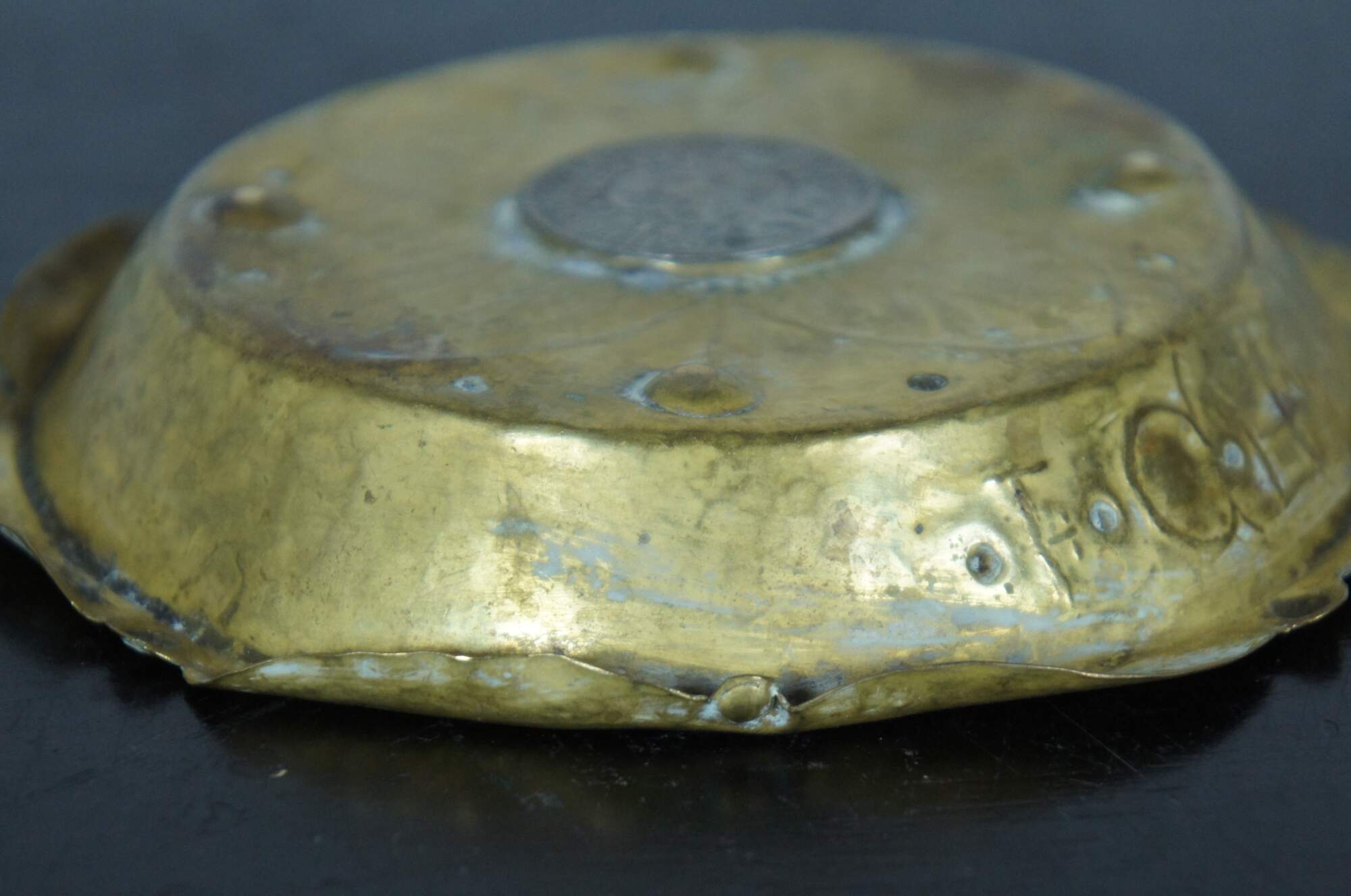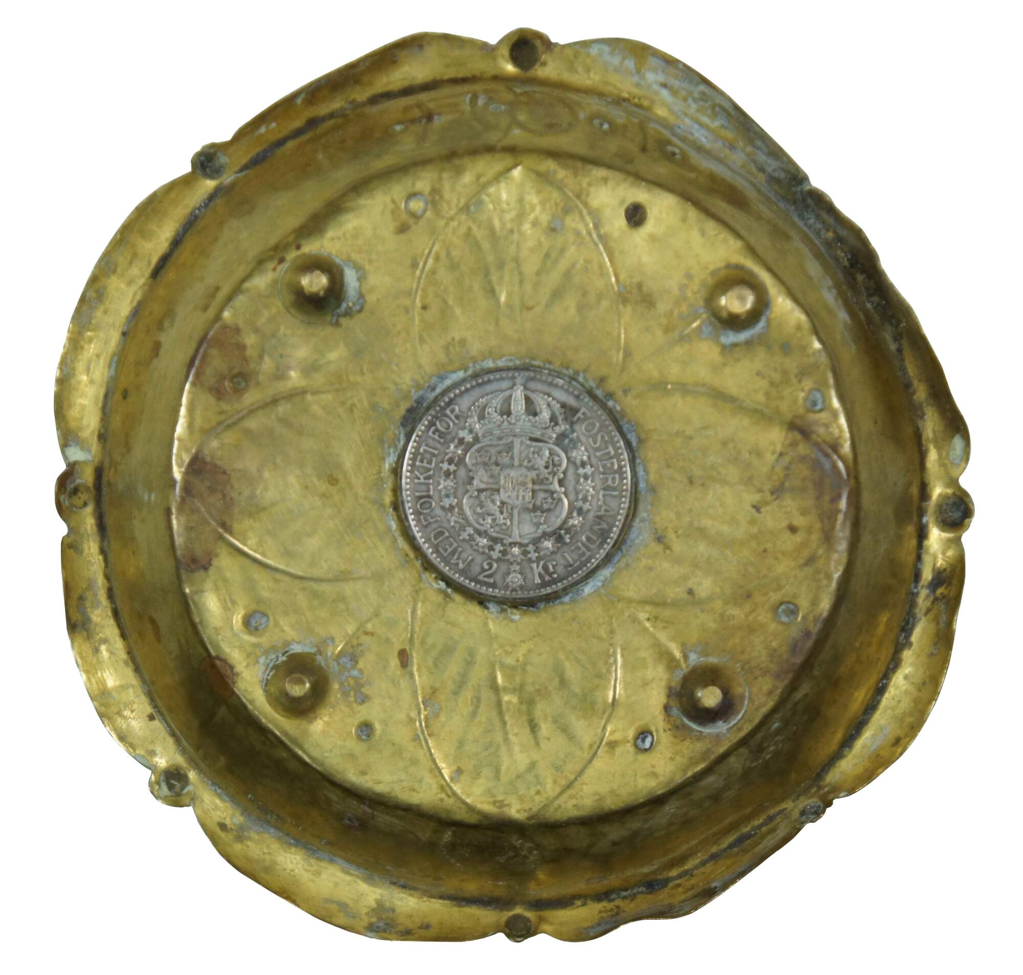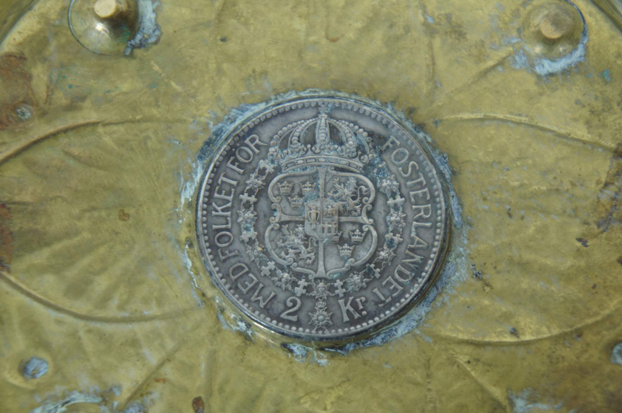 Early 20th century etched brass trinket dish featuring a four petaled flower surrounding an inset 2 kronor Swedish silver coin (exact year worn away); the letters F.C(or G). A. are etched along one side.