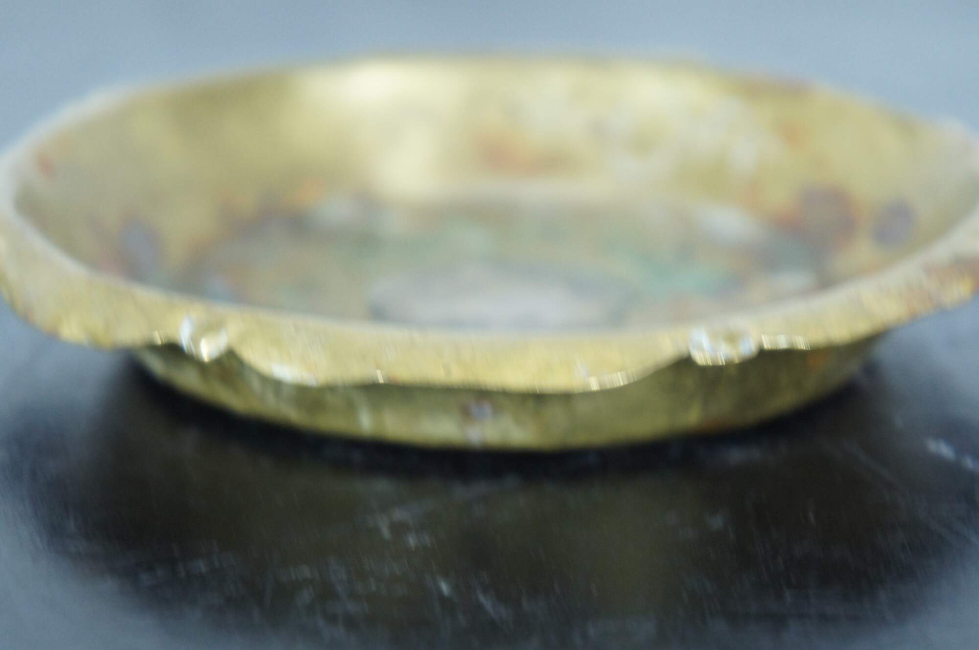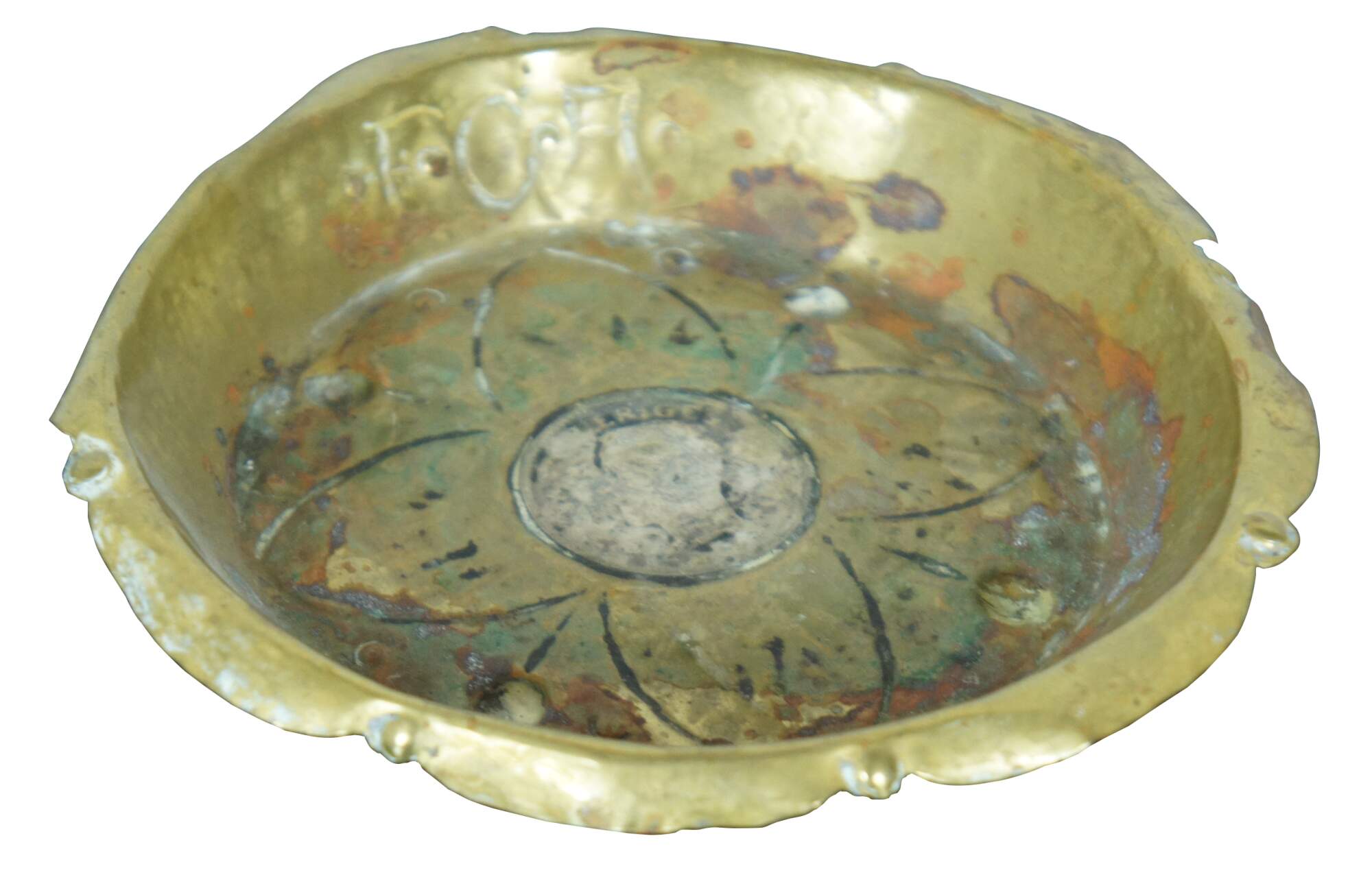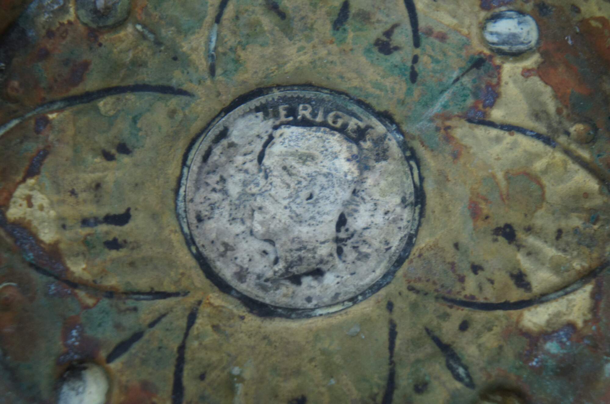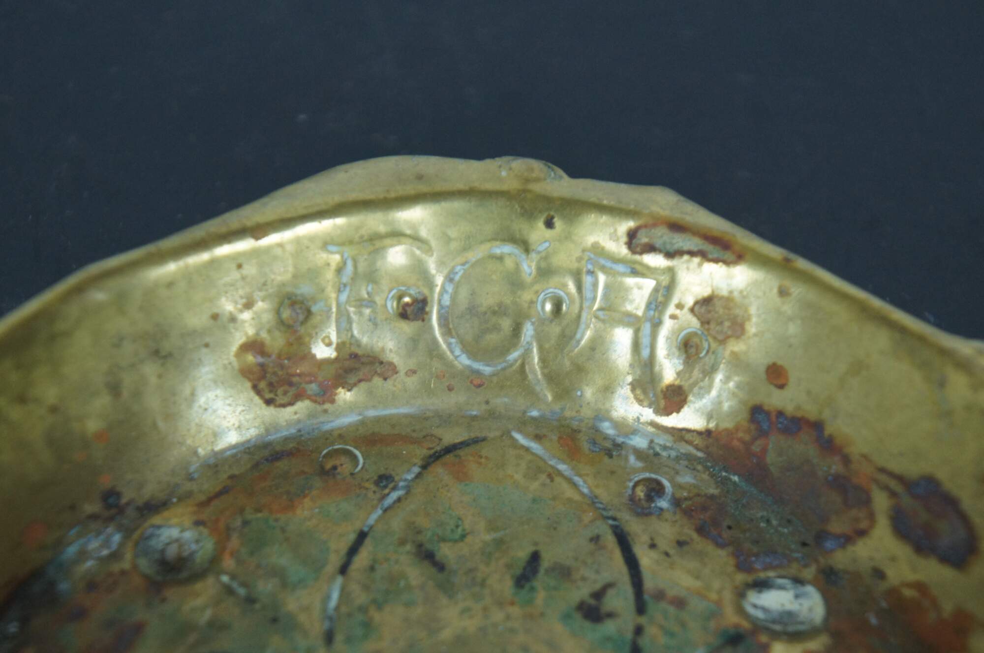 Early 20th century etched brass trinket dish featuring a four petaled flower surrounding an inset 2 kronor Swedish silver coin (exact year worn away); the letters F.C(or G). A. are etched along one side.