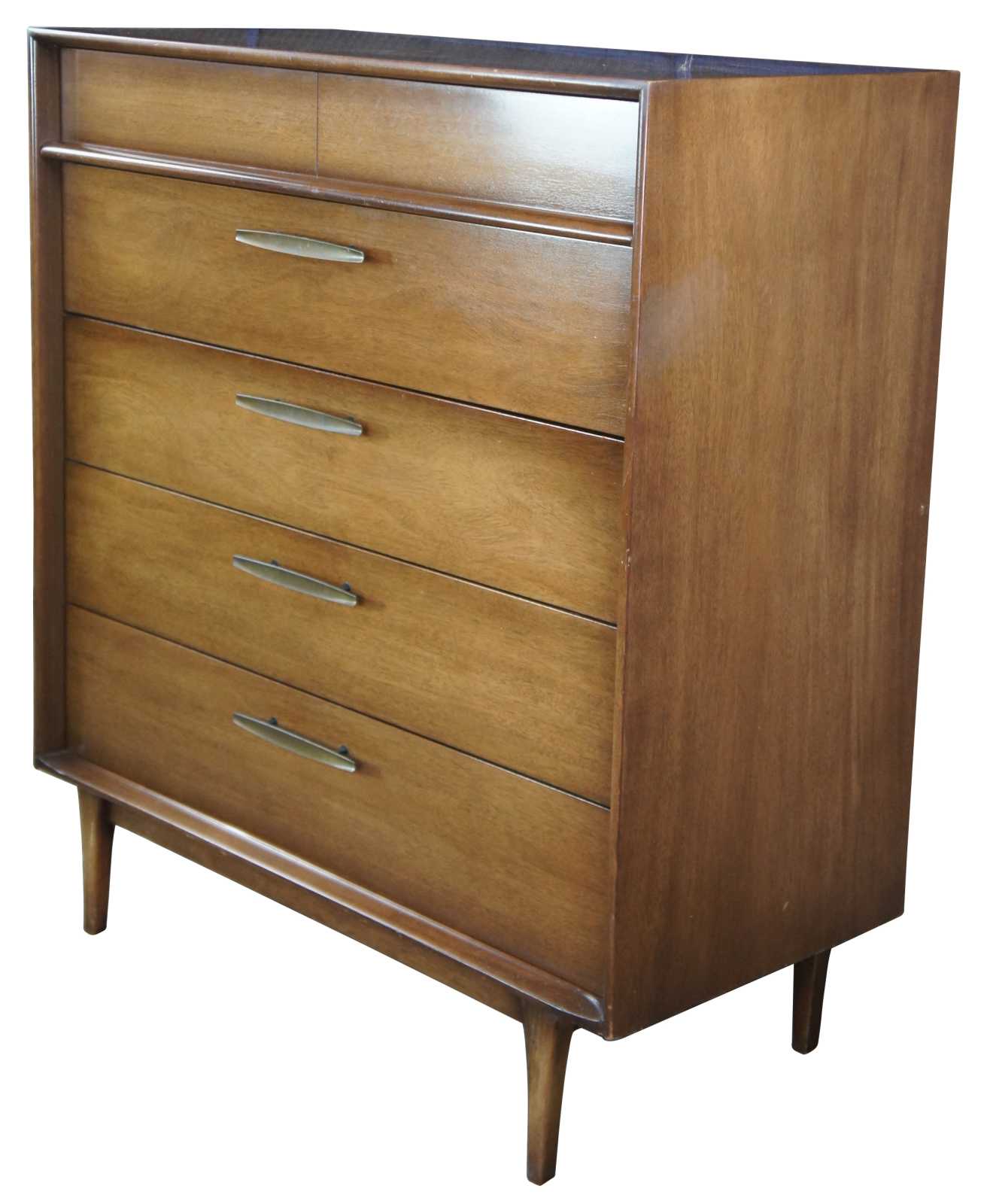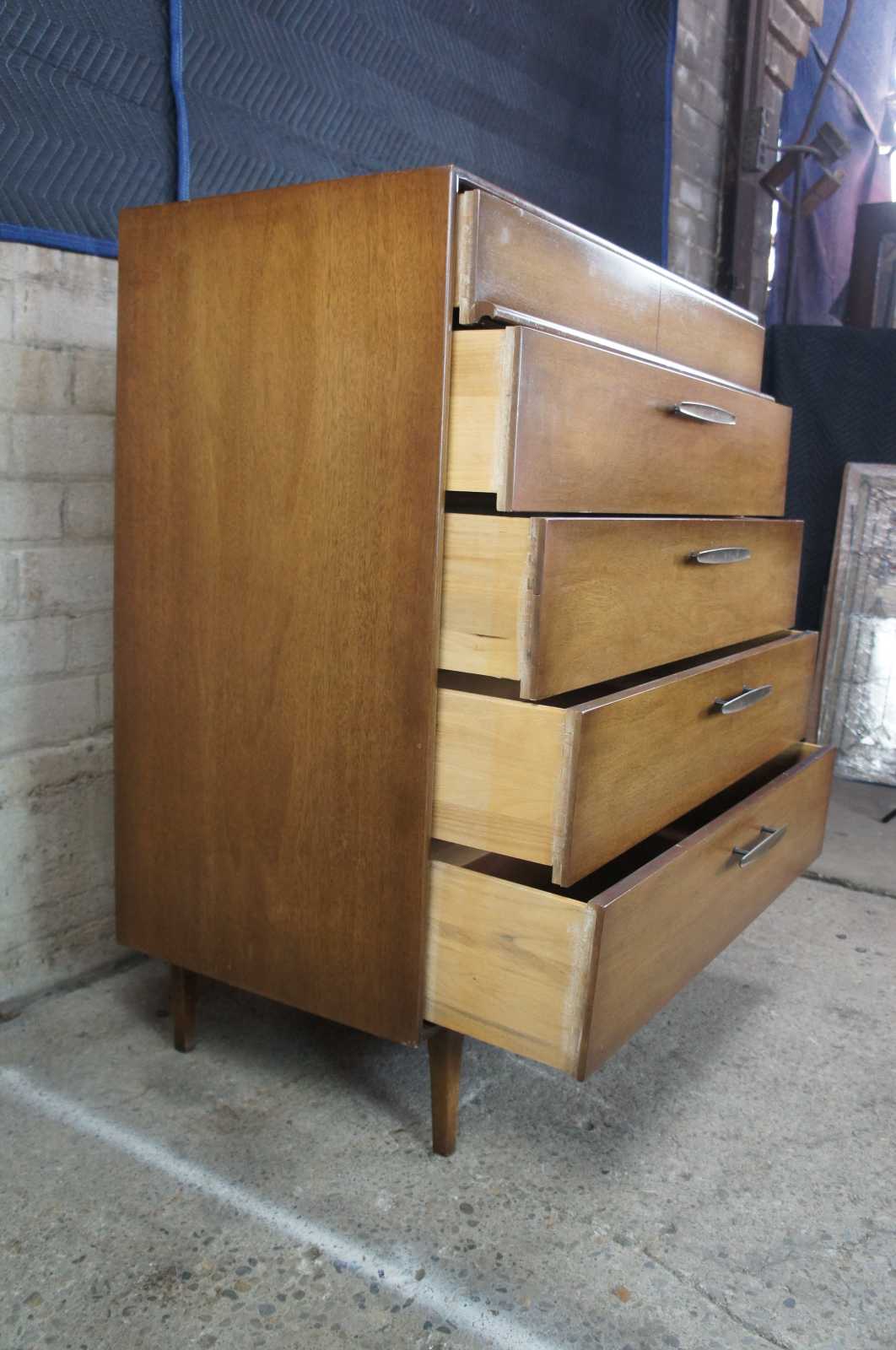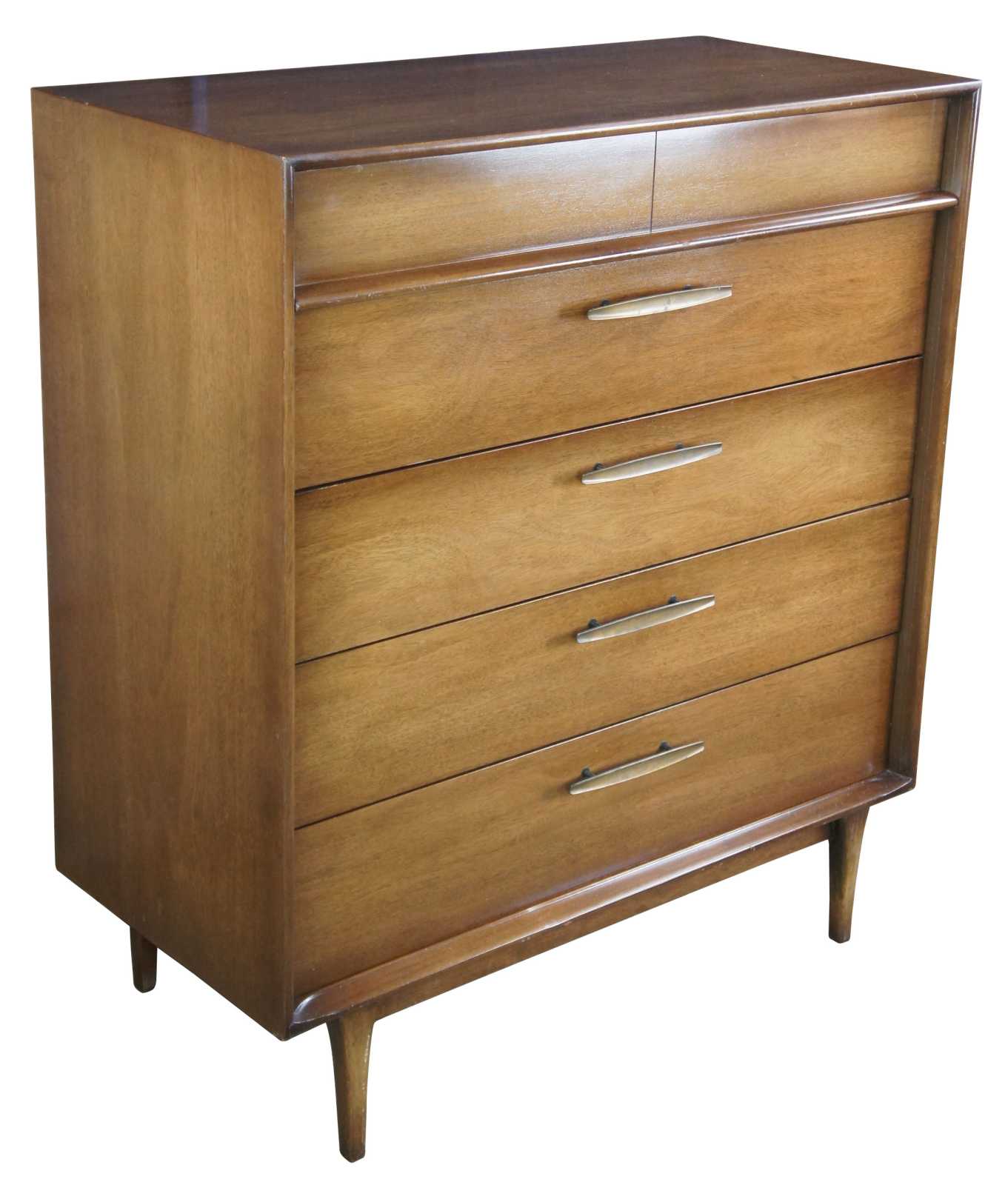 Mid century modern Red Lion Table Co dresser or chest of drawers. Made from walnut featuring five drawers supported by tapered legs.