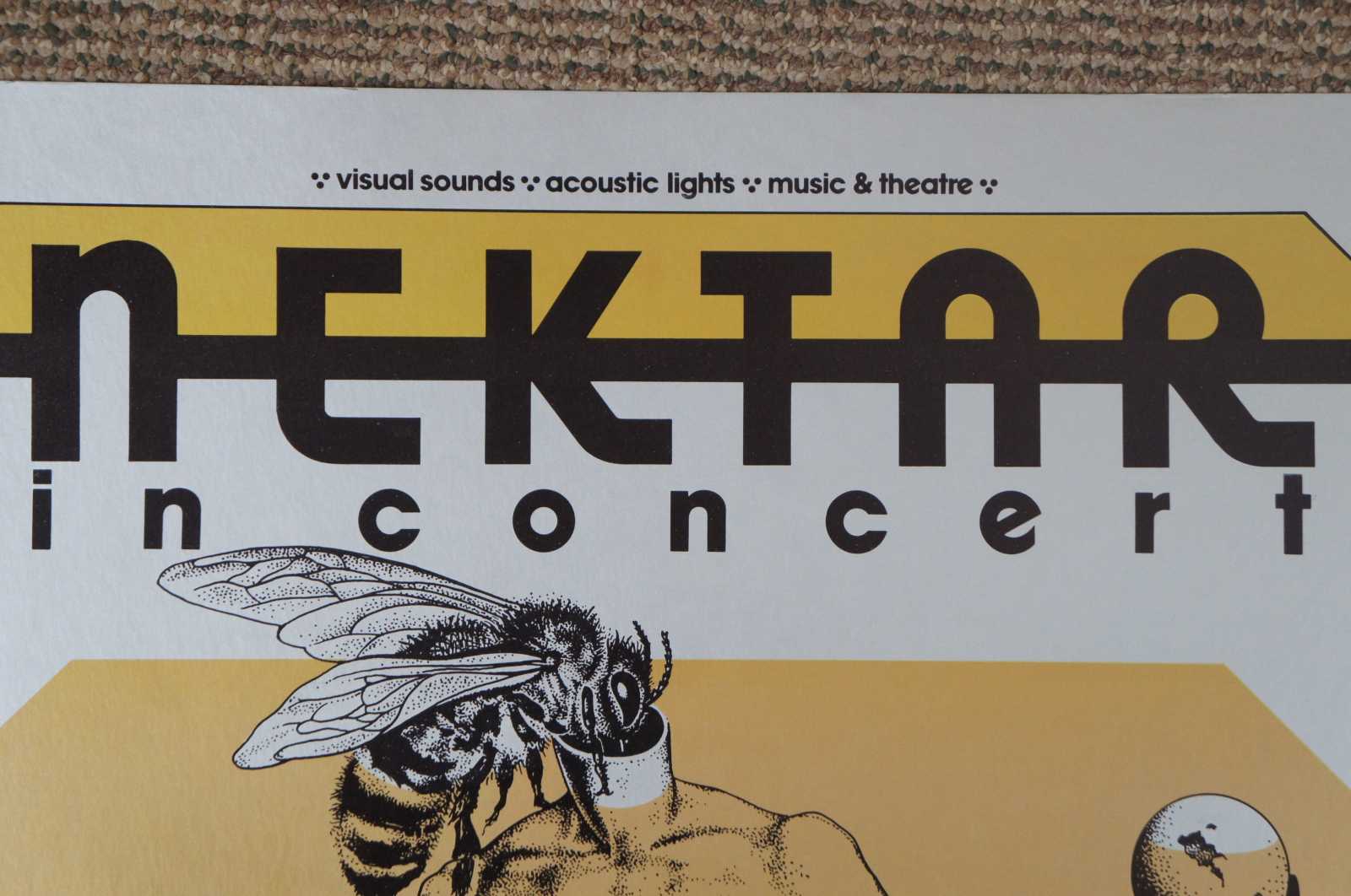 6 Available – Vintage 1970s promotional poster for Nektar in Concert featuring a surrealist image of the “nektarman”, part human, part insect, penetrated by stacked orange geometric trapezoids on a semi-metallic silver background.