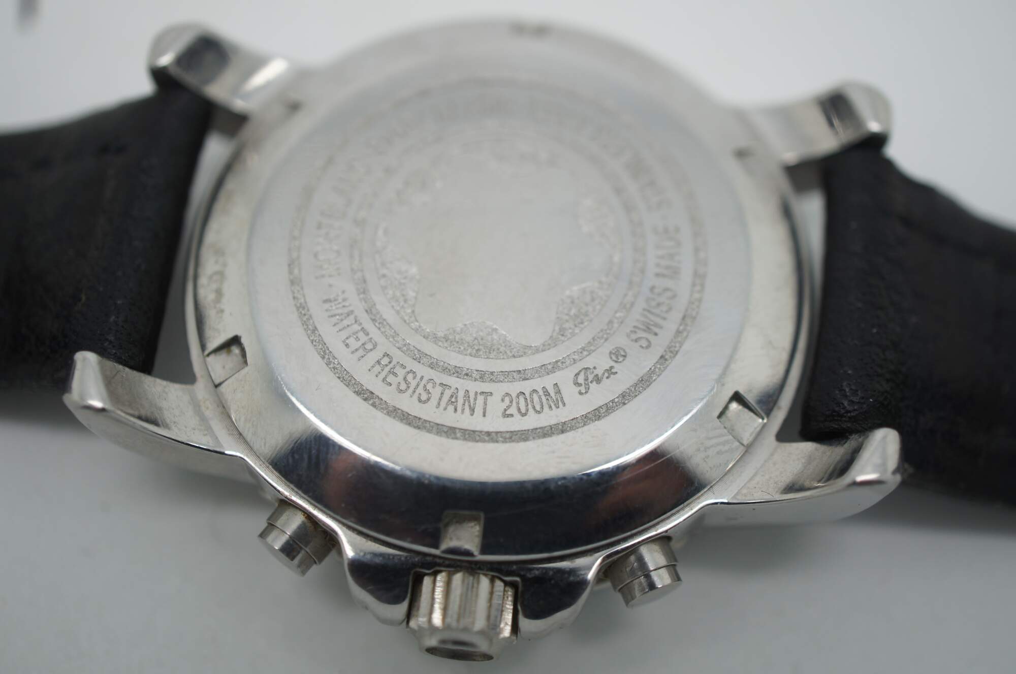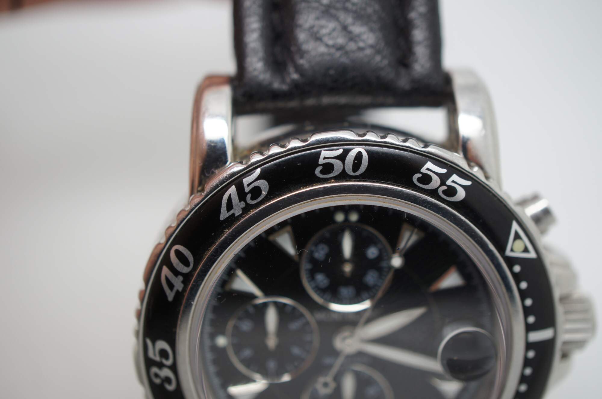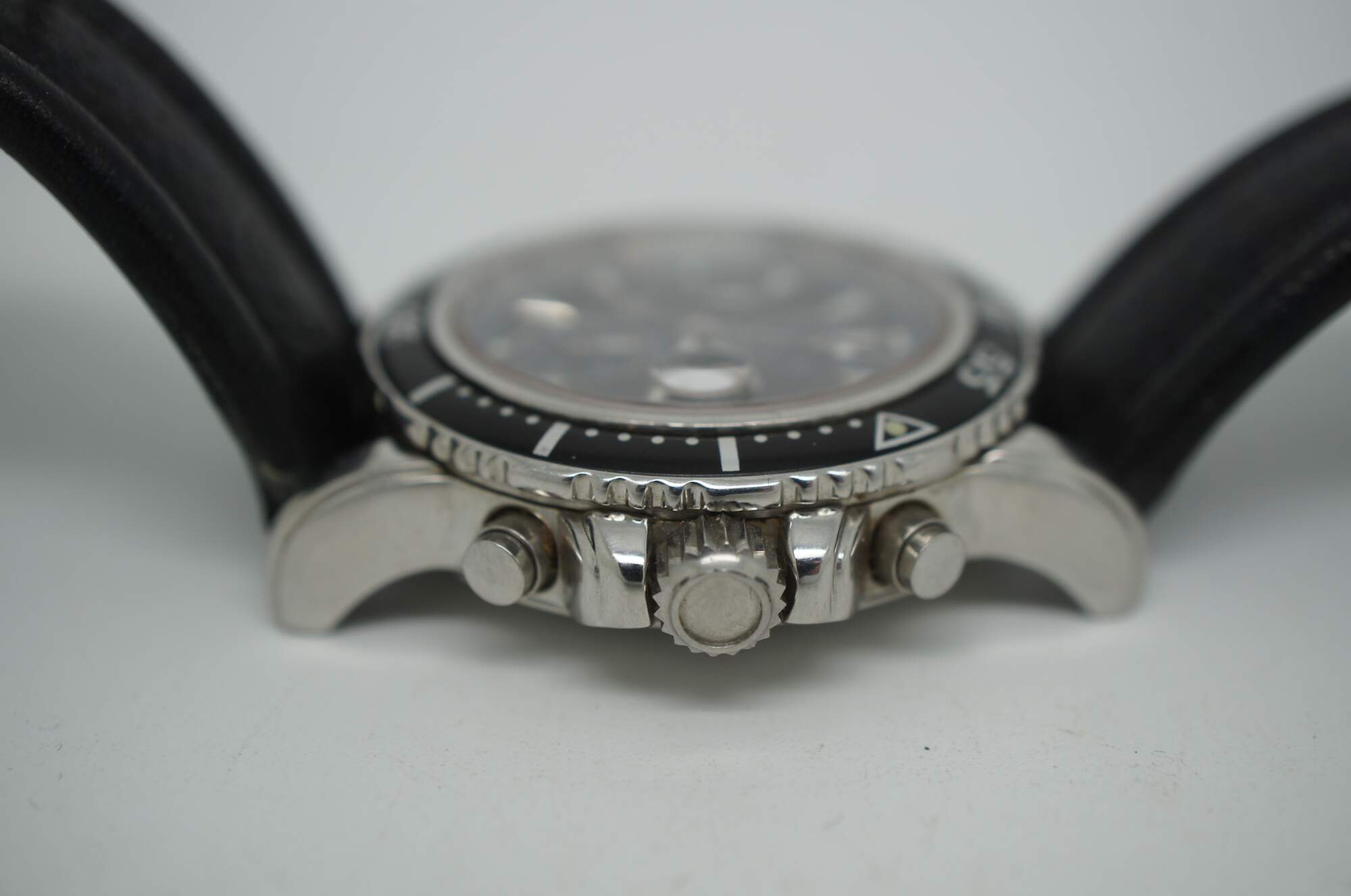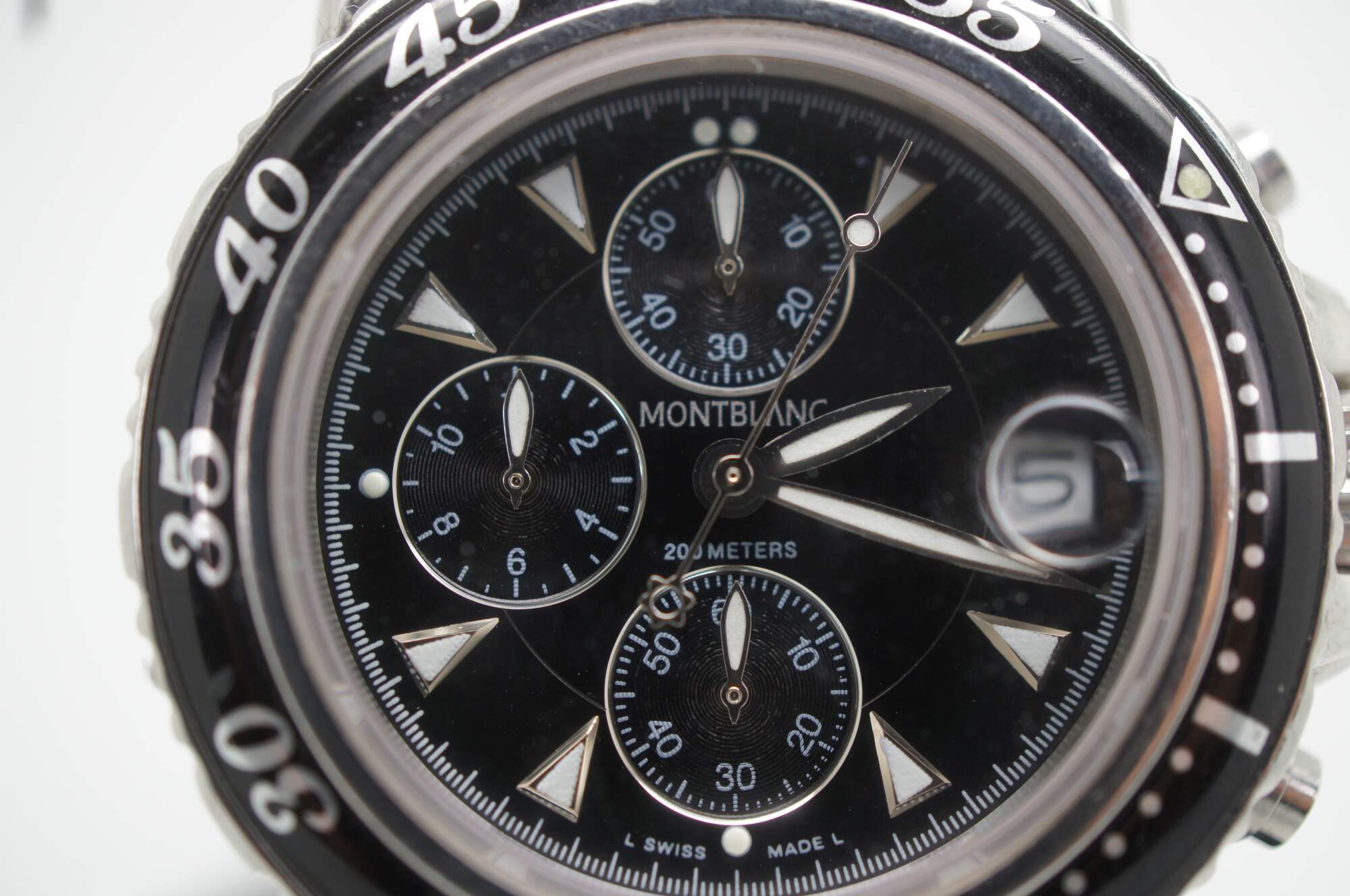 Montblanc Meisterstuck Sport chronograph wristwatch model 7037-PL78948. Features a stainless steel case trimmed in black, water resistant 200 meters. Genuine black leather band and an unused spare. 41mm Circa 2011