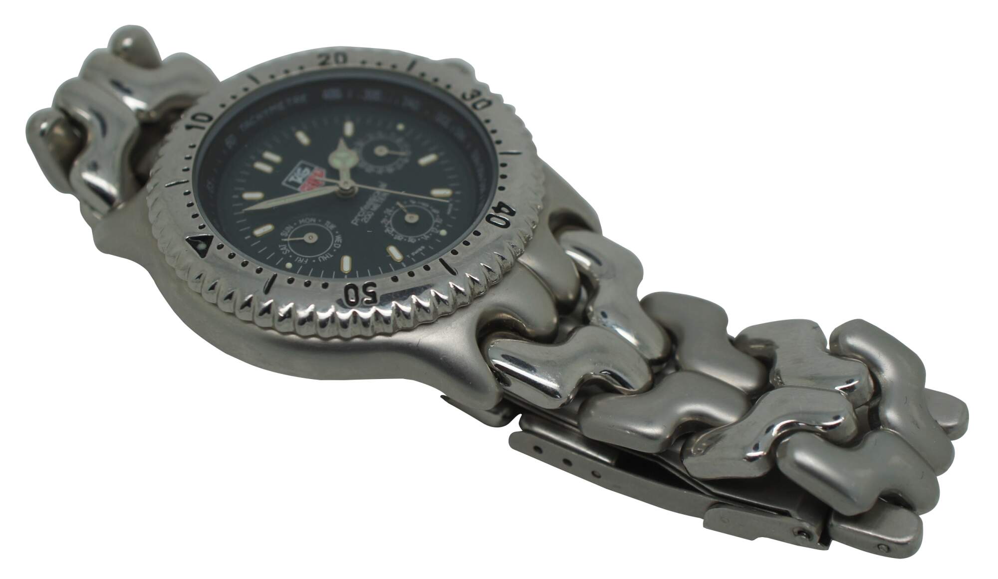 Tag Heuer chronograph wristwatch with tachymetre, stainless steel case and band, water resistant to 200 meters.