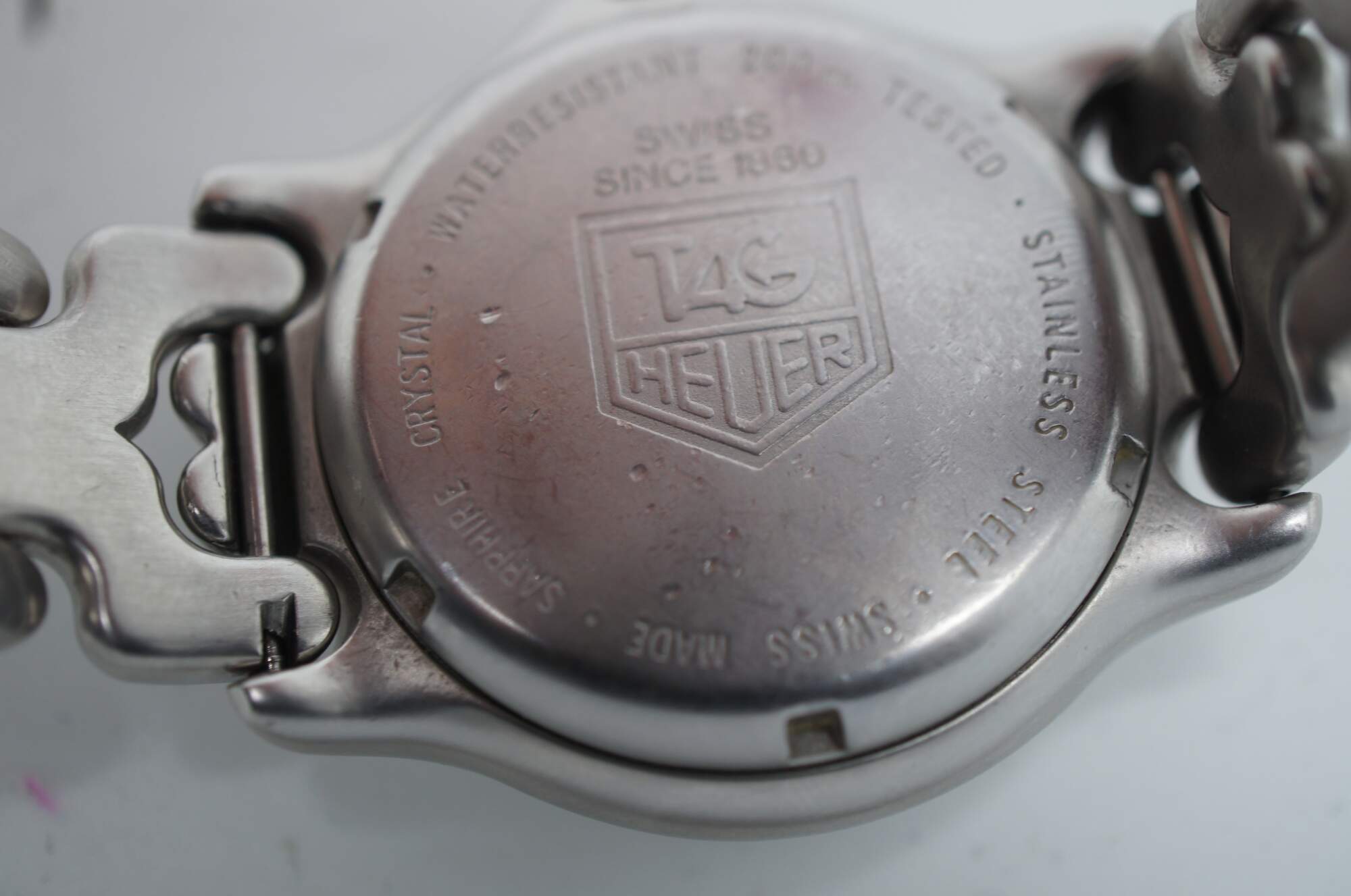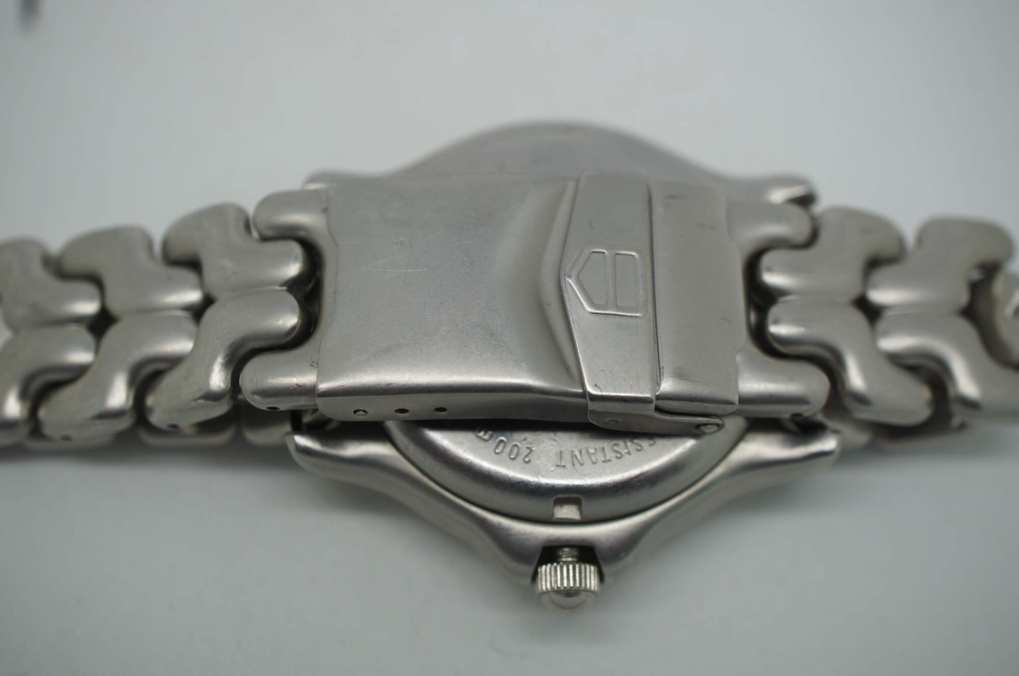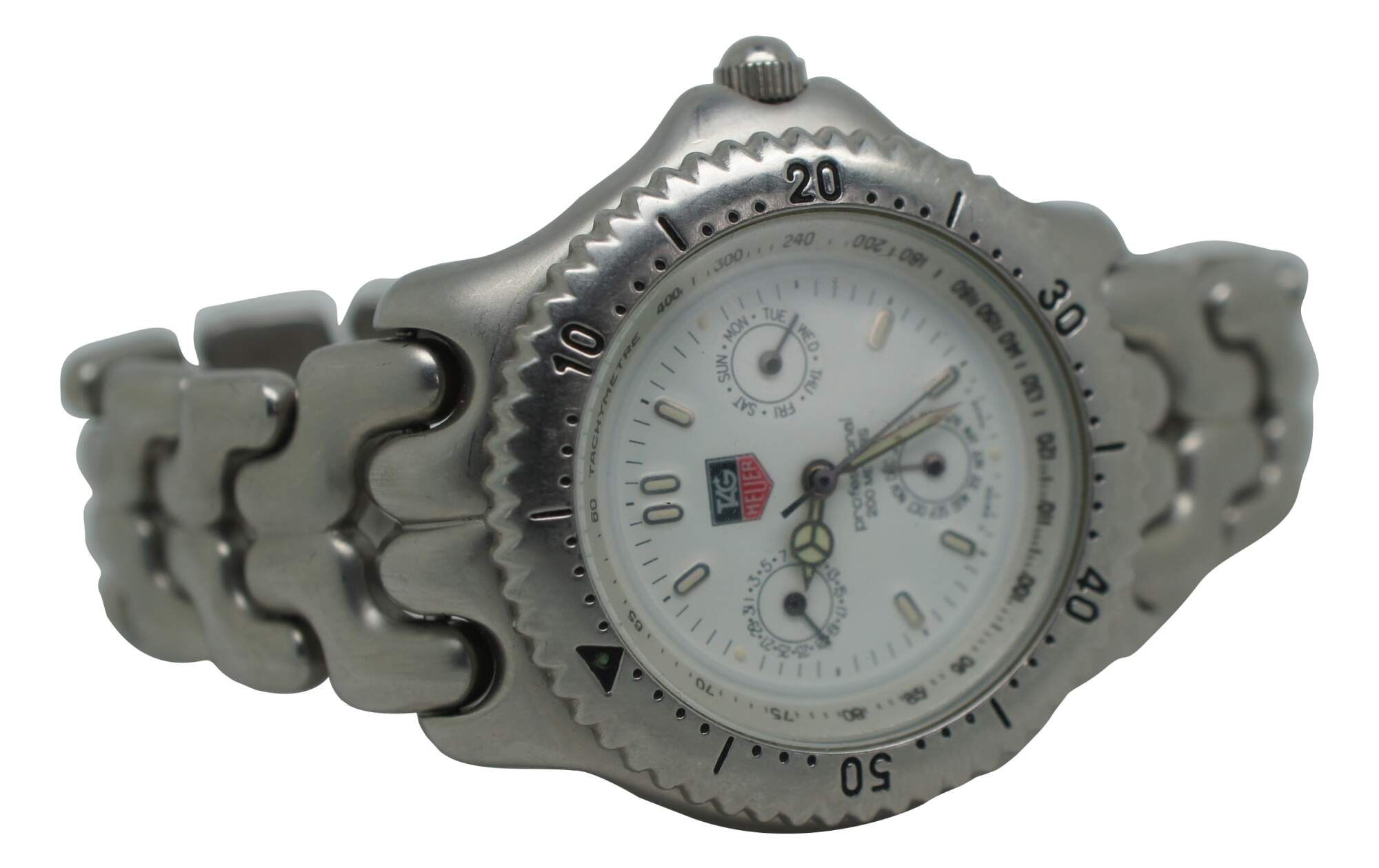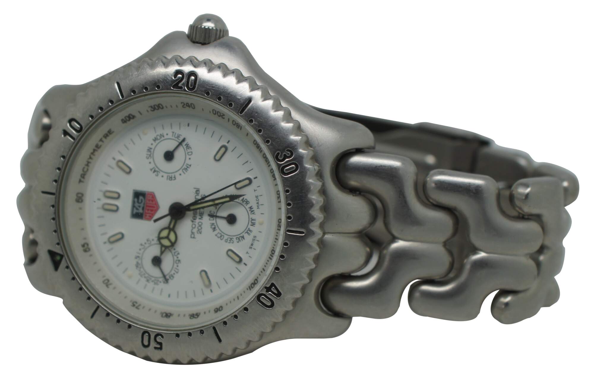 Tag Heuer Professional watch with stainless steel case and band, perpetual calendar on the face, and tachymetre, water resistant 200 meters.