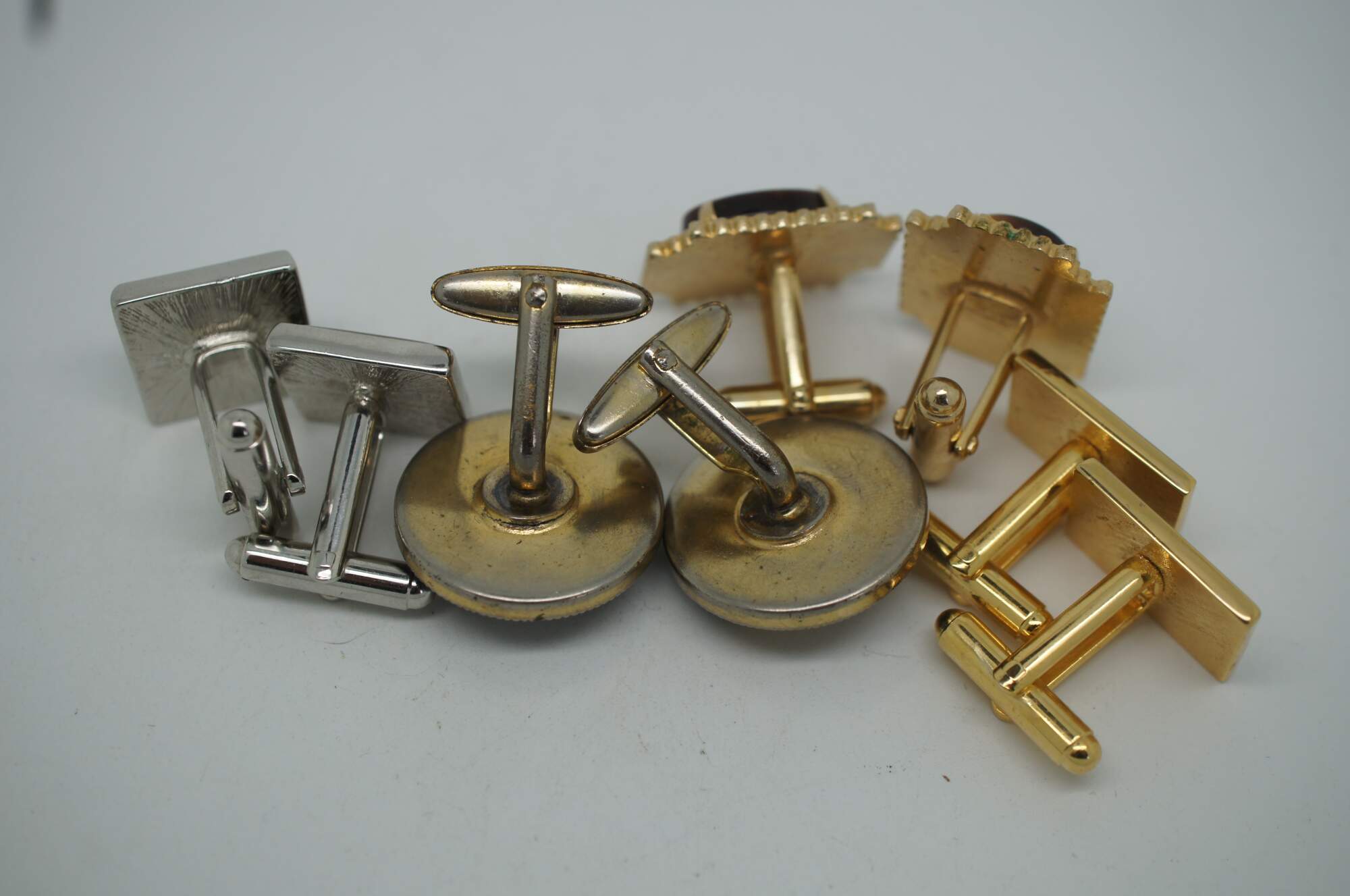 Four pairs of unmarked mid century vintage cufflinks, two of which feature tiger’s eye opal stones.