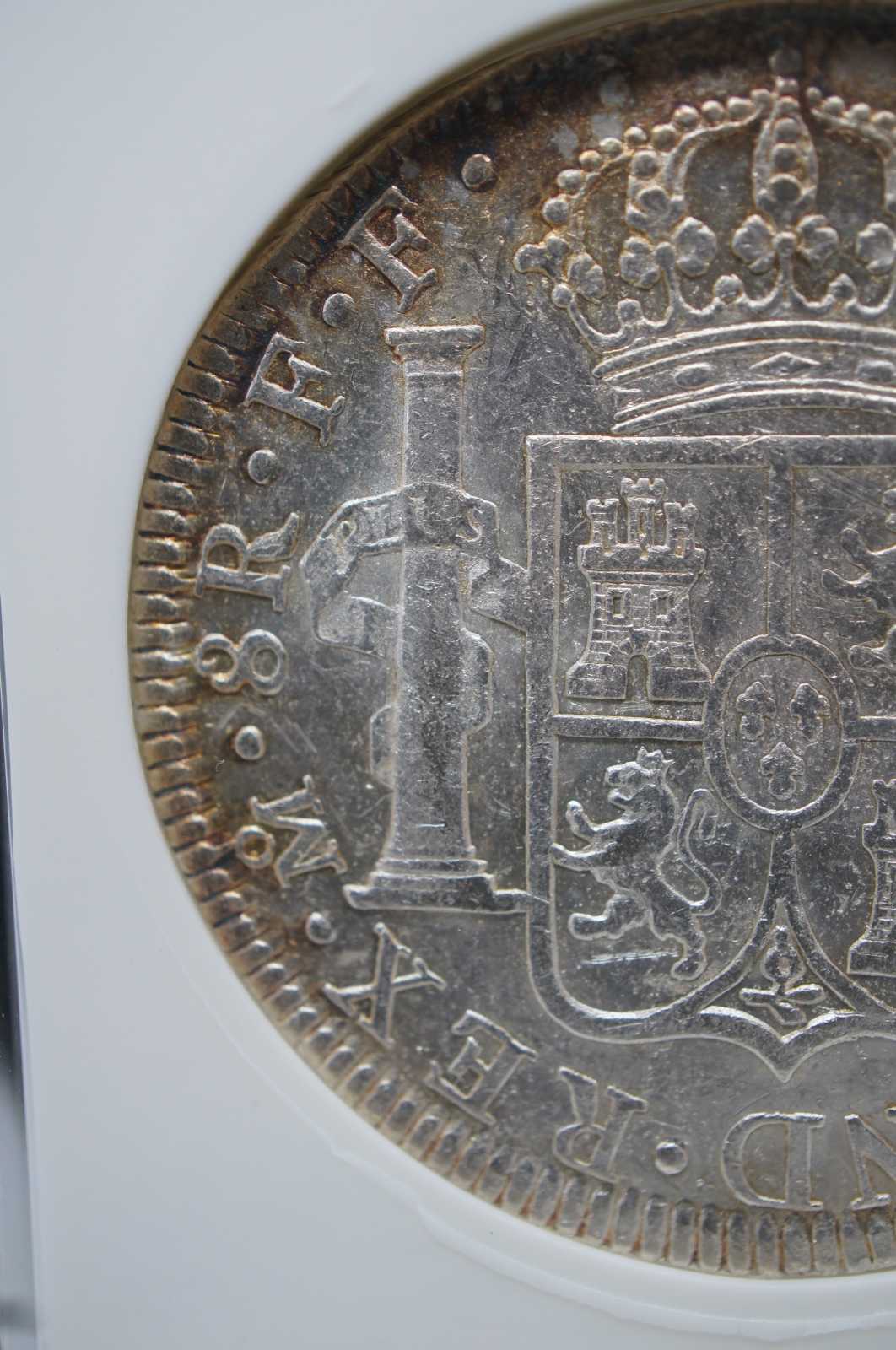 Antique 1783 Mexican 8 reales coin. Obverse: the head of King Carolus III of Spain, facing right, dressed like an ancient Roman emperor; the words “Carolus III” along the left edge, “Dei Gratia” along the right edge, and the year centered along the bottom edge. Reverse: crowned coat of arms flanked by two ribbon wrapped pillars; the words “Hispan Et Ind Rex Mo (Mexico City’s mint mark) 8R FF (assayer’s initials)” along the bottom three quarters of the edge and separated by dots. Graded by The American Numismatic Association Certification Service. Coin grade AU 53 – About Uncirculated. The coin has very light wear or maybe only a trace of friction on the highest points. It has nearly full mint luster.