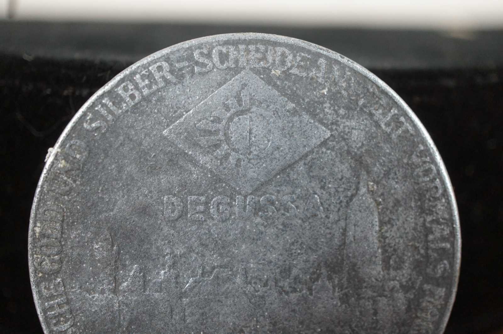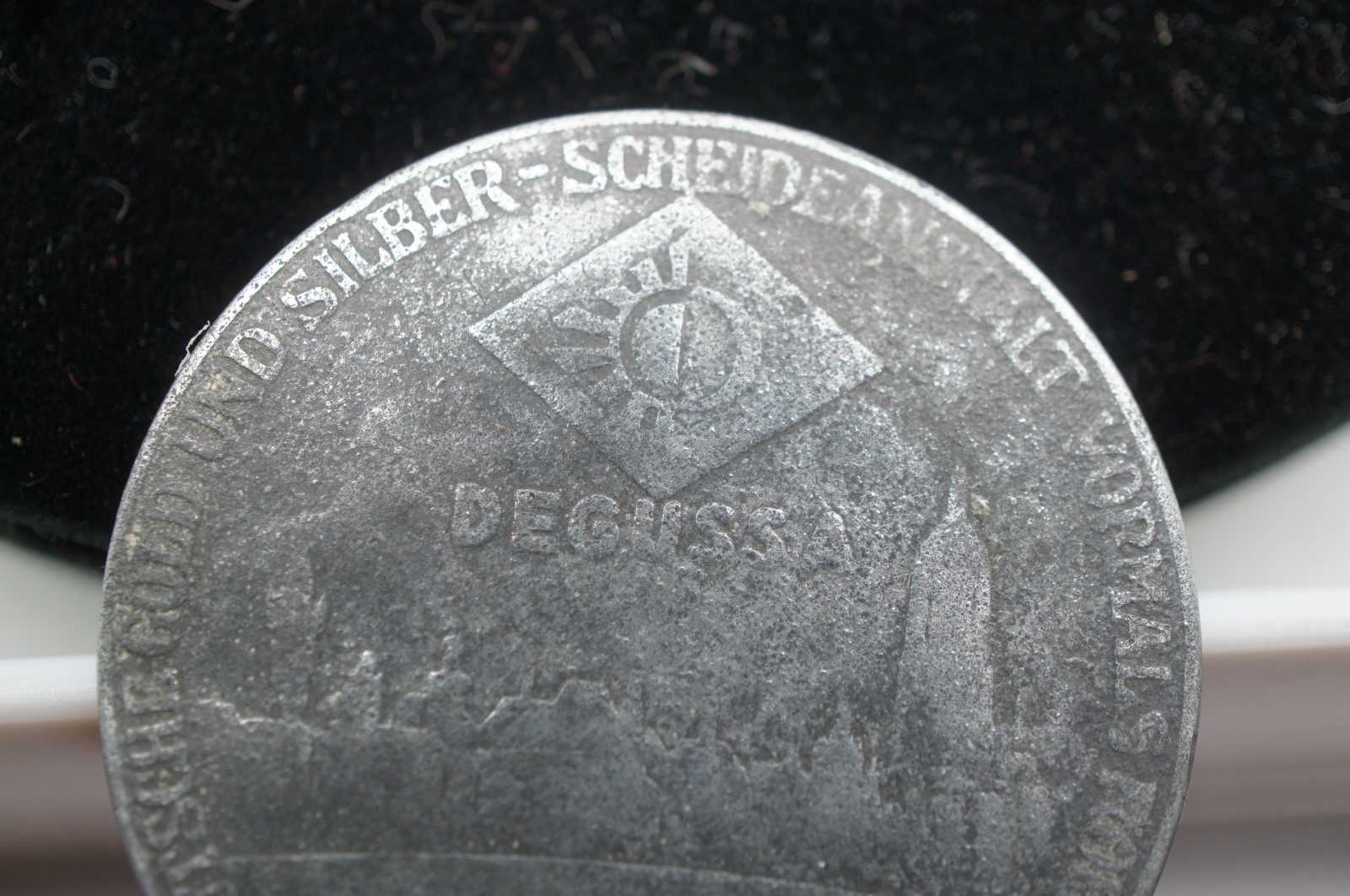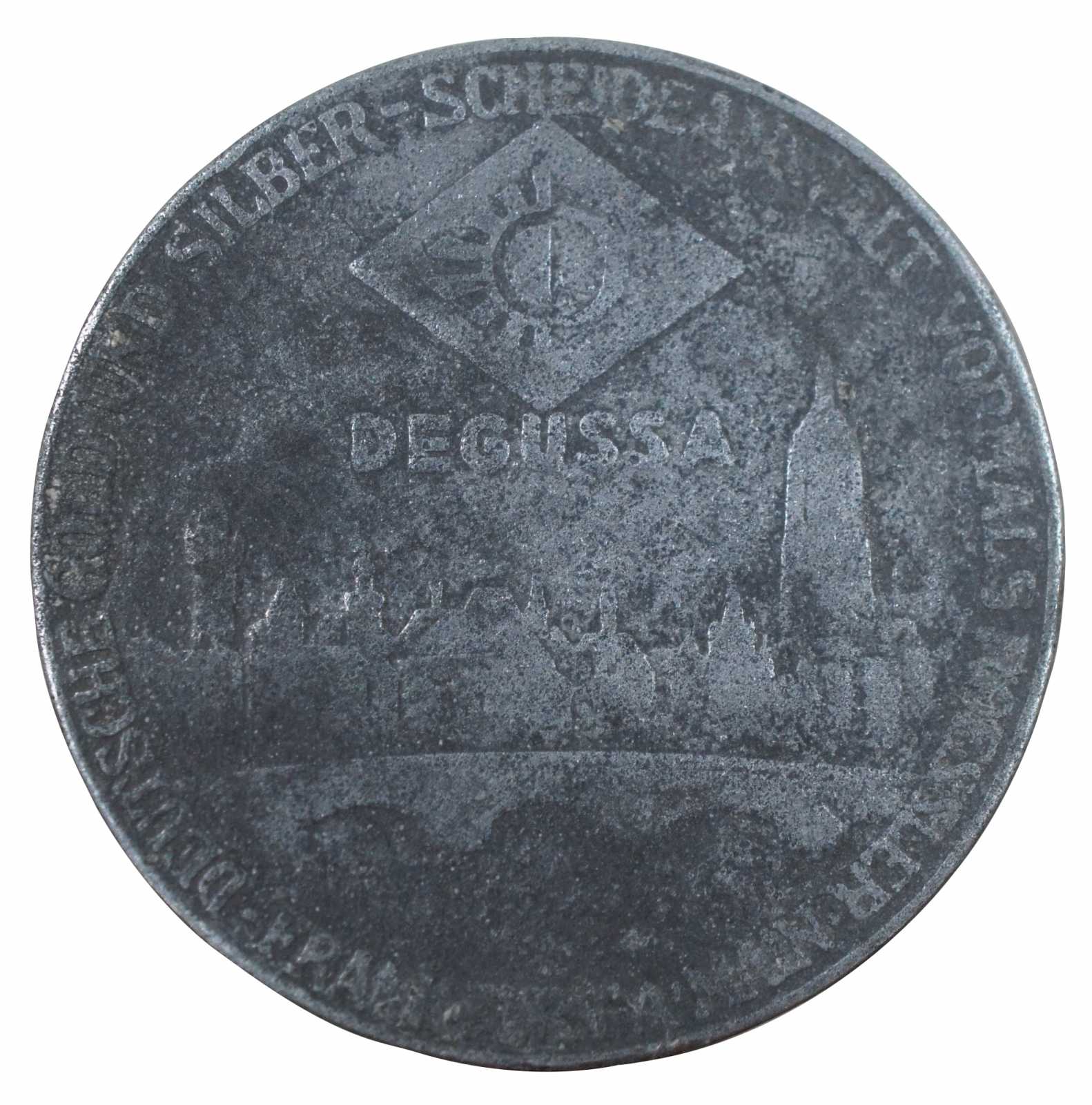 Antique 1943 The Sundays calendar coin by Degussa metalworks of Germany. Obverse: the words “Die Sonntage” across the top center; an open book printed with the months and days above a reclining nude figure; 1943 to the left of the figure; “Gertag Fuhrers 20.4” and something on a banner to the right of the figure; astroligical symbols bordering the top edge; words bordering bottom edge. Reverse: “Deutsche Gold- und Silber-Scheideanstalt vormals Roessler” (German Gold and Silver Refinery formerly Roessler) around the outside edge; a sun and moon logo in a diamond centered above the word “Degussa” above a city skyline. “The history of former Degussa began in the half of the 19 century, when the head of the Frankfurt Mint, Friedrich Ernst Roessler, established a gold and silver separation factory at the city’s request in 1843. Furthermore, Roessler initiated the construction of a chemical-technical laboratory close to the Mint, on the premises of today’s Evonik site. This laboratory processed the byproducts of sulfuric acid separation, namely silver nitrate and cyanide salts. When Frankfurt lost its political independence in 1866 as a consequence of the Prussian-Austrian War, Friedrich Ernst Roessler became a Prussian civil servant and withdrew from the separation business. His eldest sons, Hector and Heinrich, both chemists, took over operations. They transferred the separation factory to the chemical-technical laboratory and continued both activities as the company Friedrich Roessler Söhne. When the German Empire was formally established in 1871, a standard currency was introduced: mark and pfennig. They replaced all other currencies used in the former German states. Because of the large volume of coins that then had to be refined, the government demanded security guarantees from the Roessler brothers, which could be met only by incorporating the precious metal refinery.