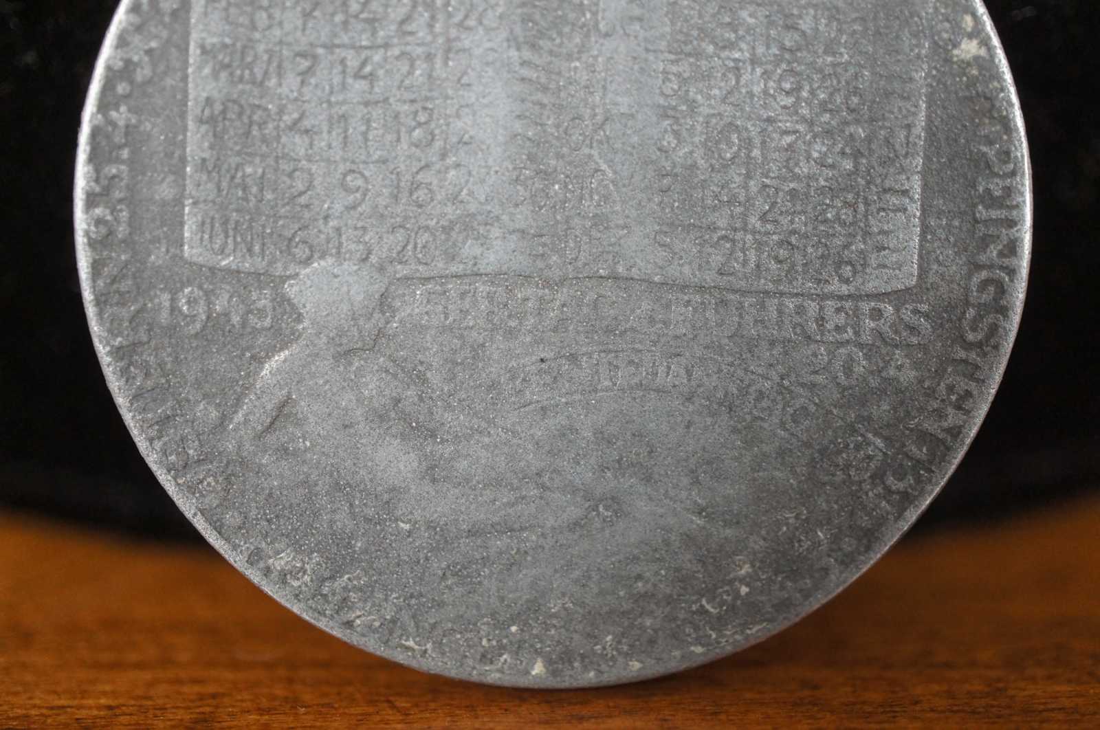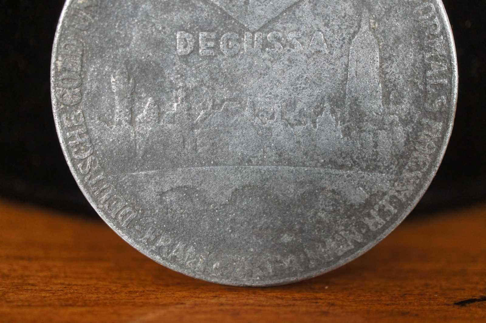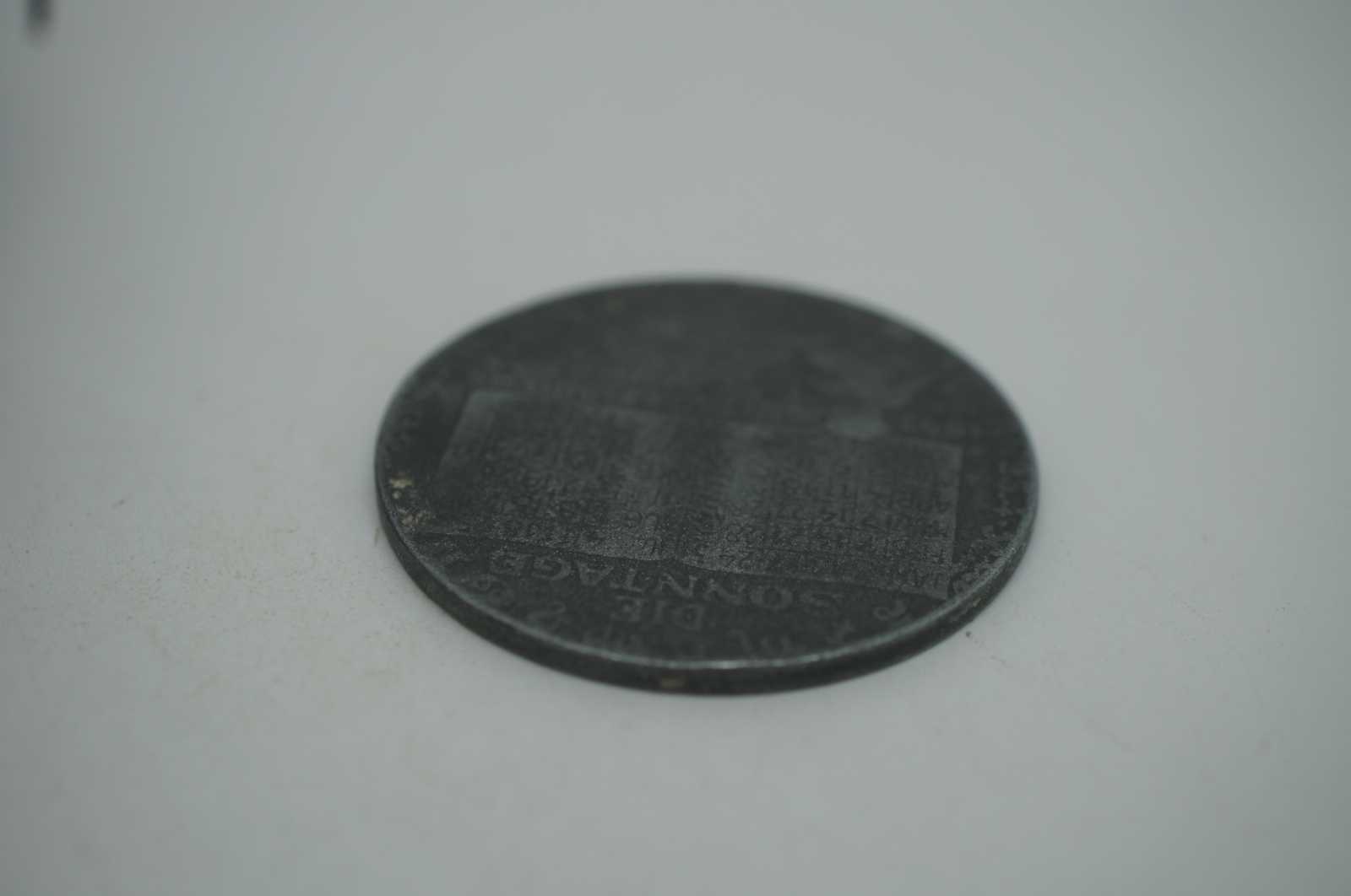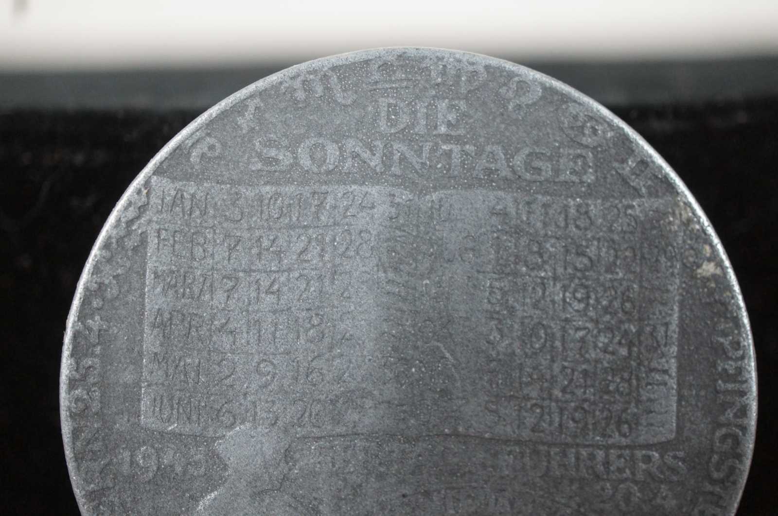 Antique 1943 The Sundays calendar coin by Degussa metalworks of Germany. Obverse: the words “Die Sonntage” across the top center; an open book printed with the months and days above a reclining nude figure; 1943 to the left of the figure; “Gertag Fuhrers 20.4” and something on a banner to the right of the figure; astroligical symbols bordering the top edge; words bordering bottom edge. Reverse: “Deutsche Gold- und Silber-Scheideanstalt vormals Roessler” (German Gold and Silver Refinery formerly Roessler) around the outside edge; a sun and moon logo in a diamond centered above the word “Degussa” above a city skyline. “The history of former Degussa began in the half of the 19 century, when the head of the Frankfurt Mint, Friedrich Ernst Roessler, established a gold and silver separation factory at the city’s request in 1843. Furthermore, Roessler initiated the construction of a chemical-technical laboratory close to the Mint, on the premises of today’s Evonik site. This laboratory processed the byproducts of sulfuric acid separation, namely silver nitrate and cyanide salts. When Frankfurt lost its political independence in 1866 as a consequence of the Prussian-Austrian War, Friedrich Ernst Roessler became a Prussian civil servant and withdrew from the separation business. His eldest sons, Hector and Heinrich, both chemists, took over operations. They transferred the separation factory to the chemical-technical laboratory and continued both activities as the company Friedrich Roessler Söhne. When the German Empire was formally established in 1871, a standard currency was introduced: mark and pfennig. They replaced all other currencies used in the former German states. Because of the large volume of coins that then had to be refined, the government demanded security guarantees from the Roessler brothers, which could be met only by incorporating the precious metal refinery.