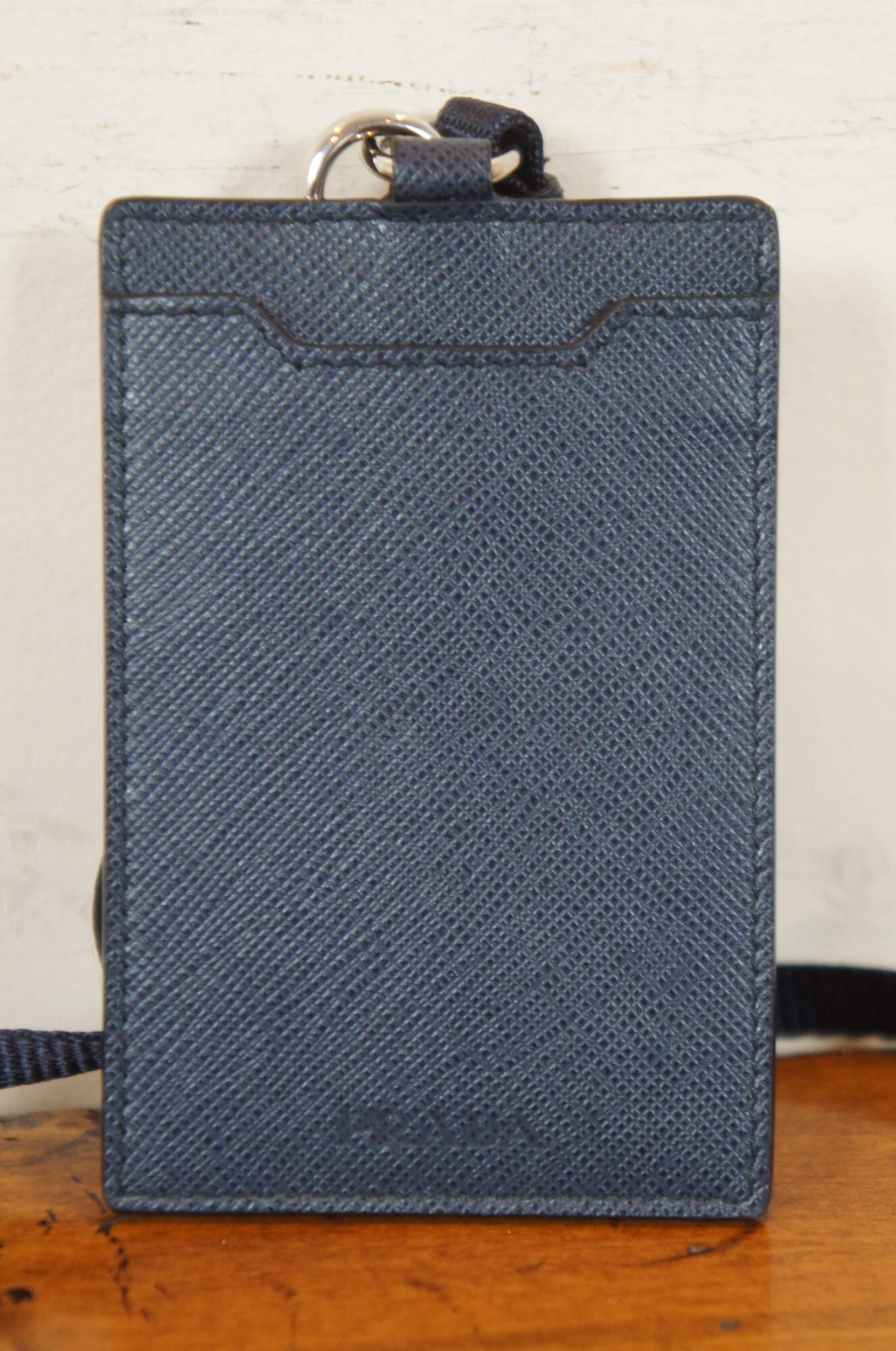 Prada navy blue crossgrain Saffiano leather id/badge holder with two card slots – one with see through window – nylon strap with branded clip, and embossed with the Prada name.