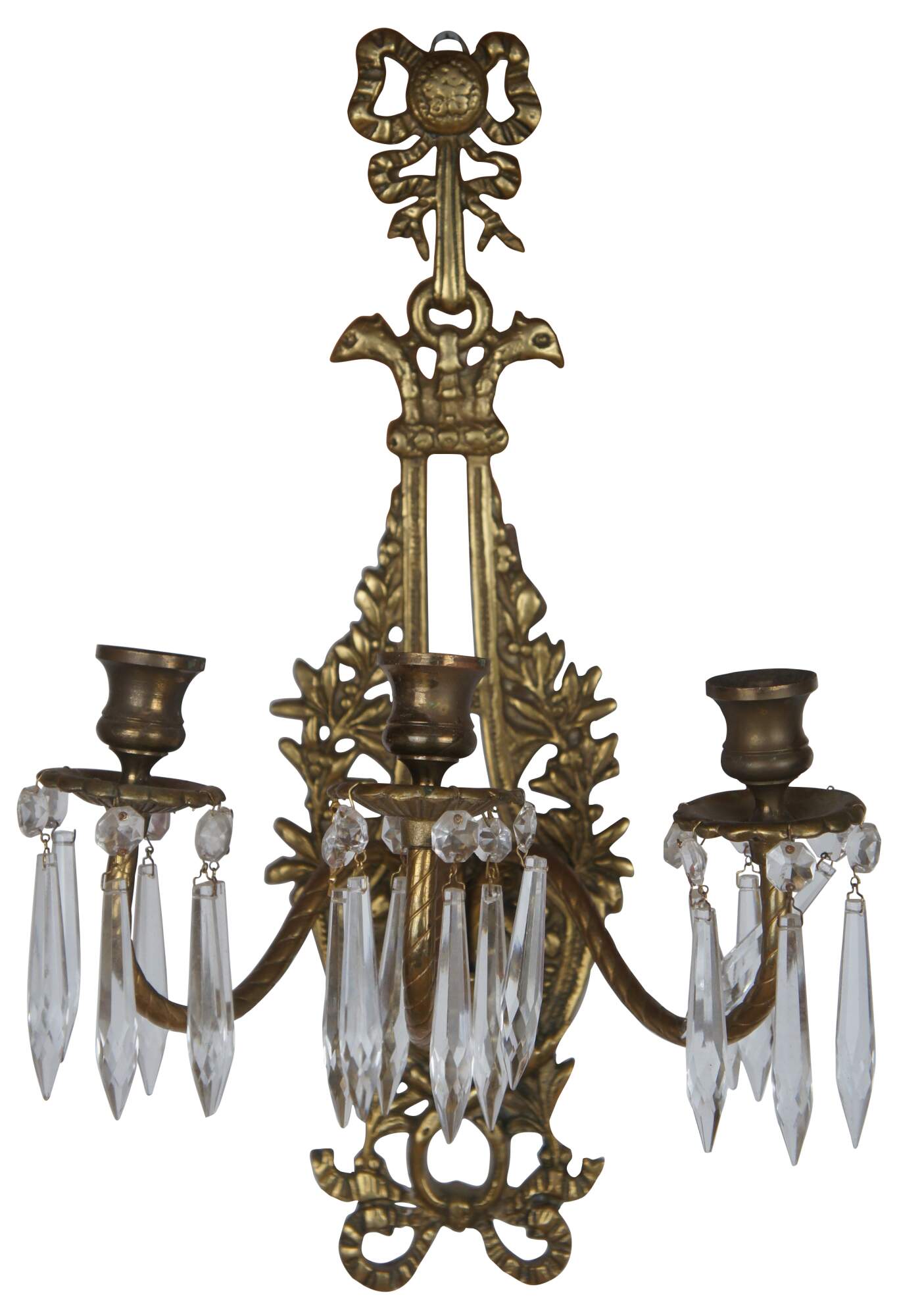 Two wall mounted triple candle sconces in brass with ornate styling and acanthus leaves. Circa 1970s