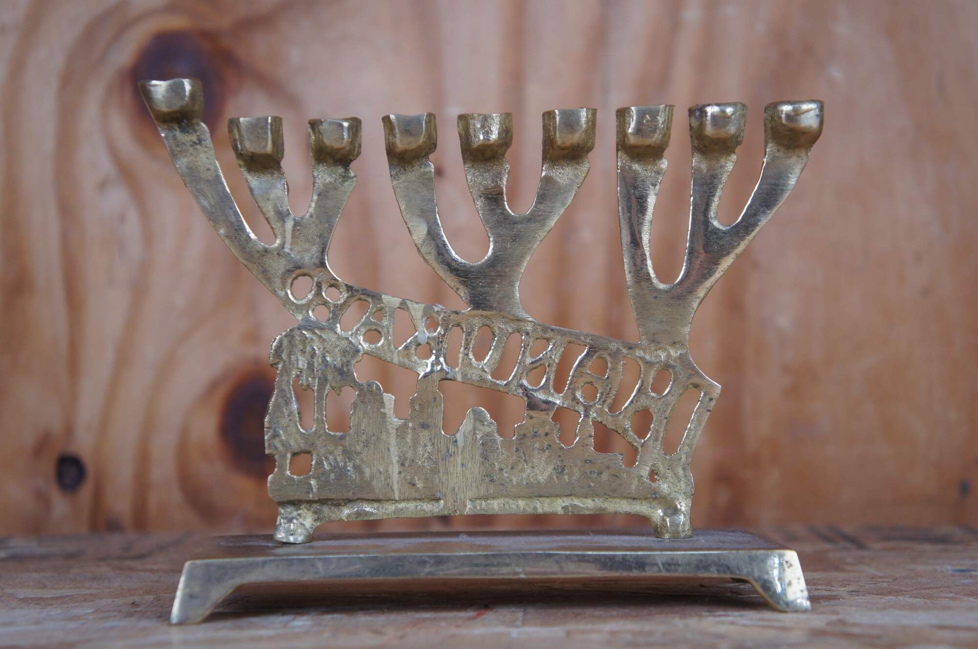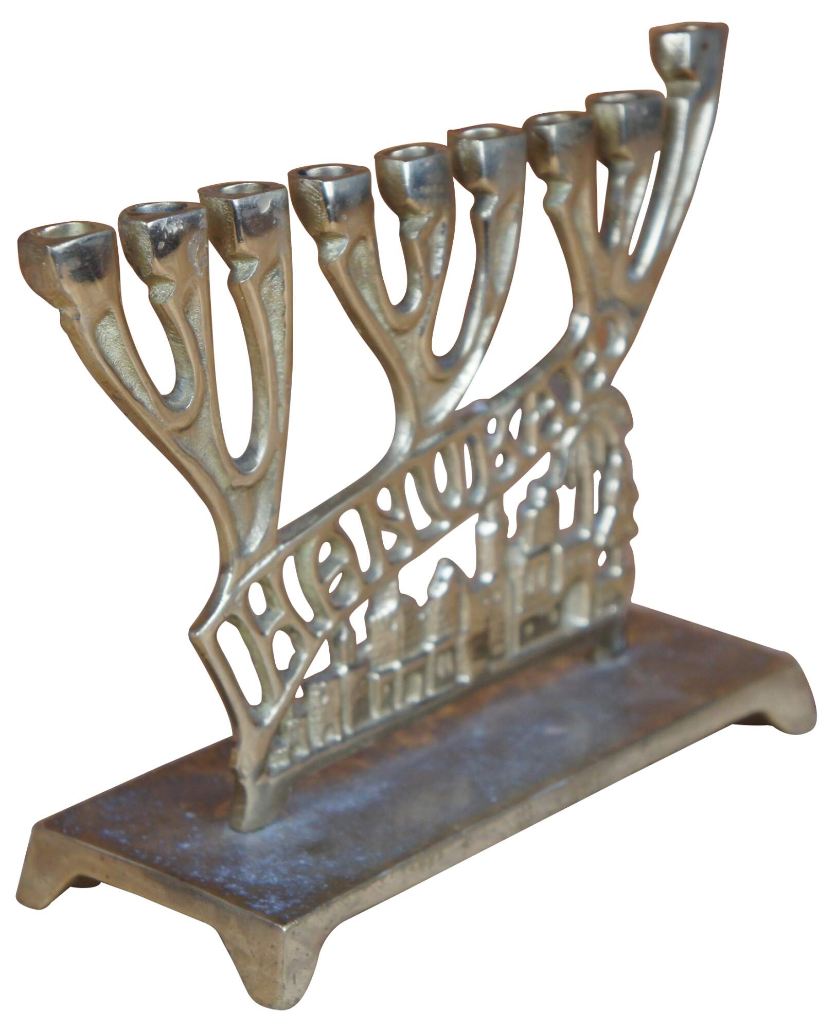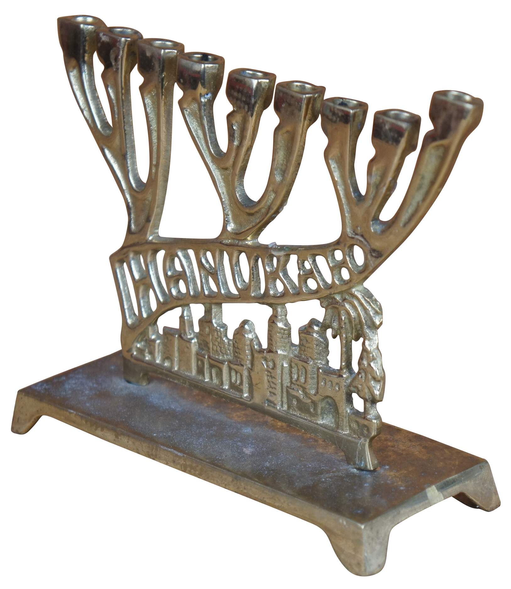 Small vintage brass menorah with the word Hanukah and delicate candle holders.