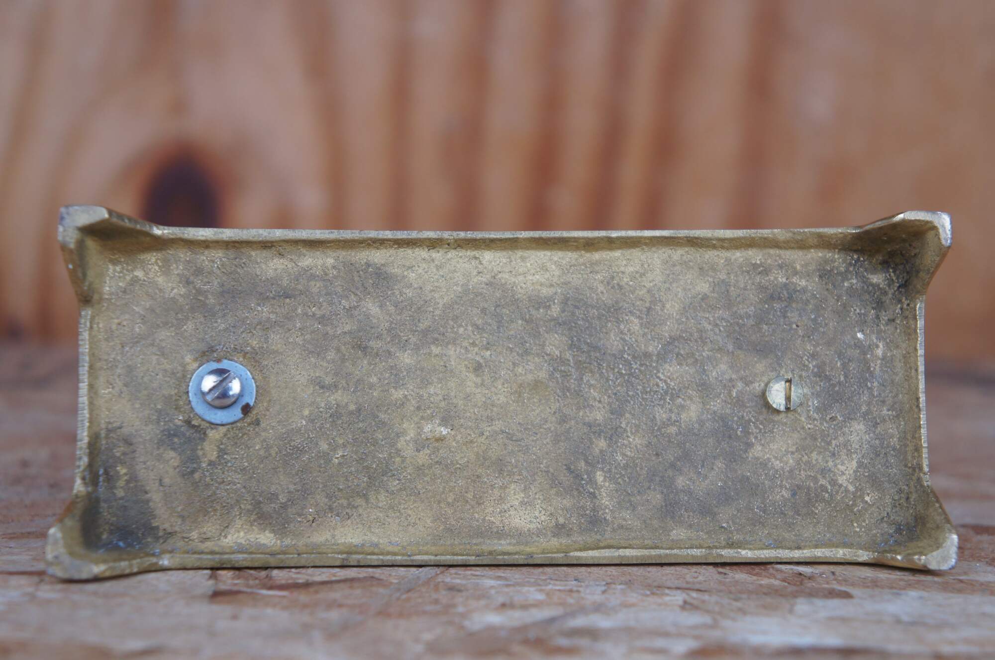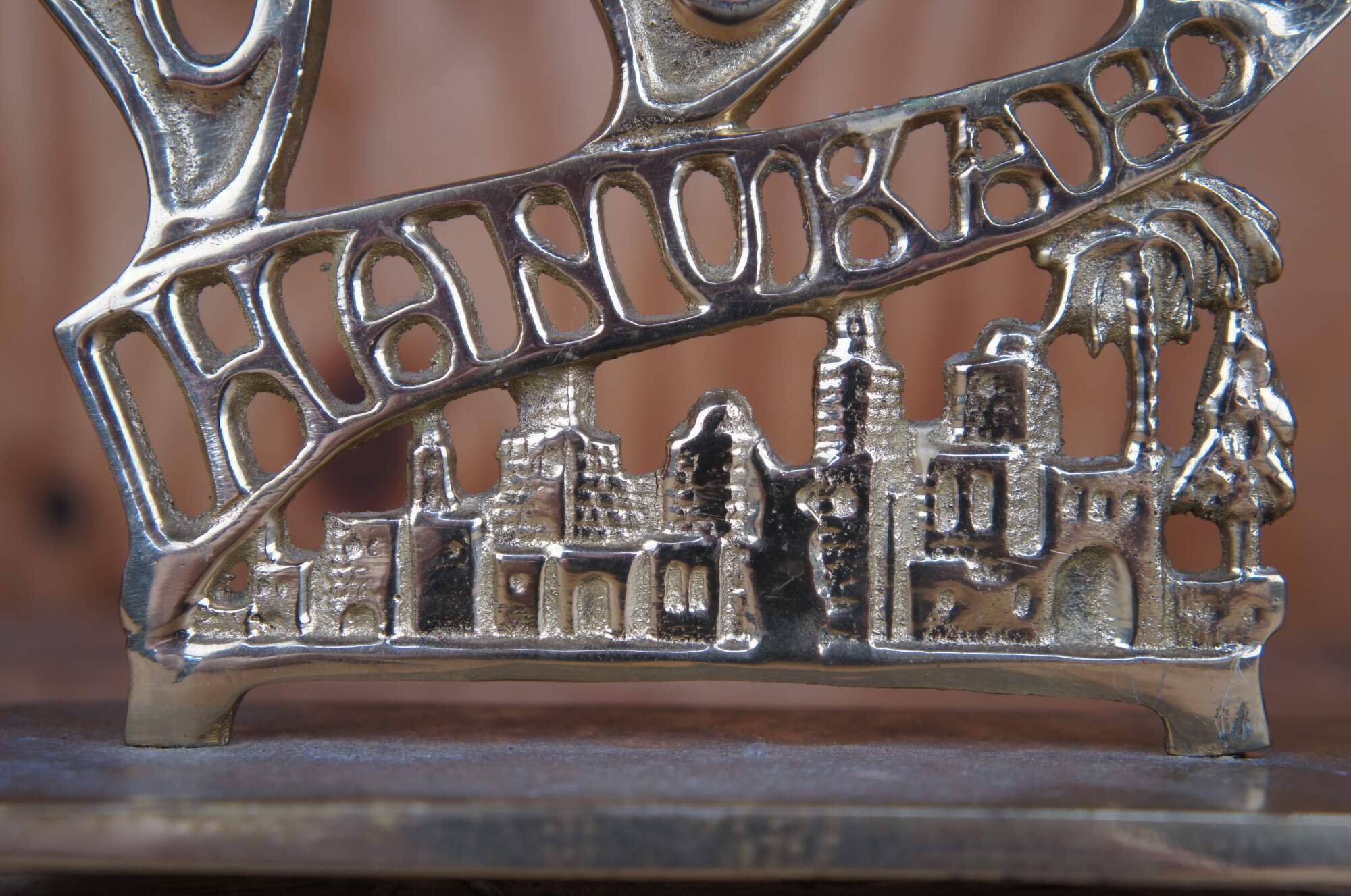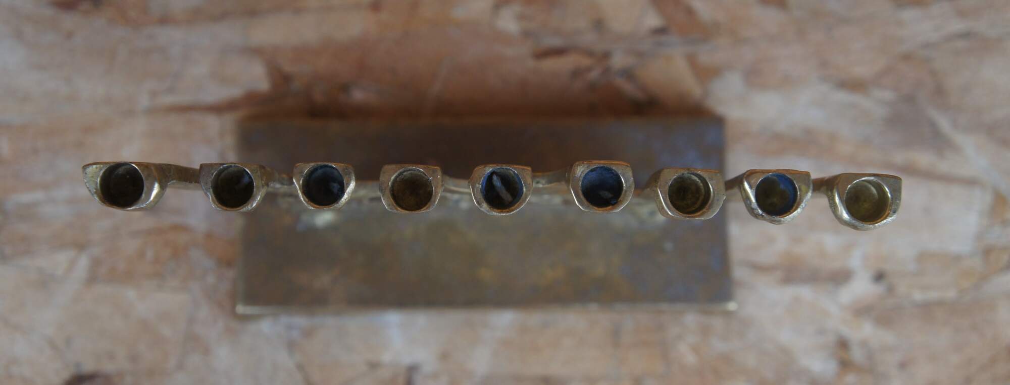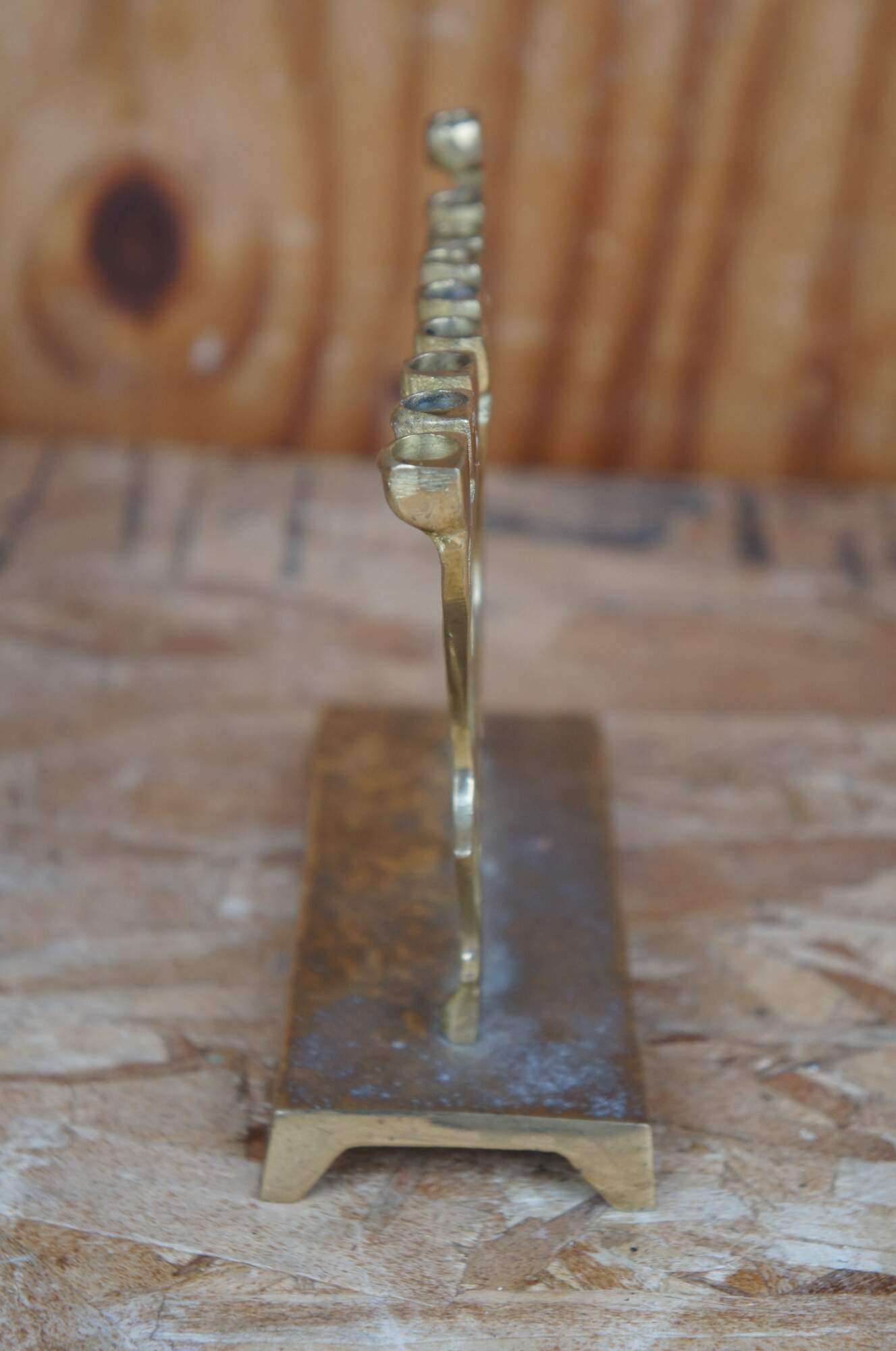 Small vintage brass menorah with the word Hanukah and delicate candle holders.