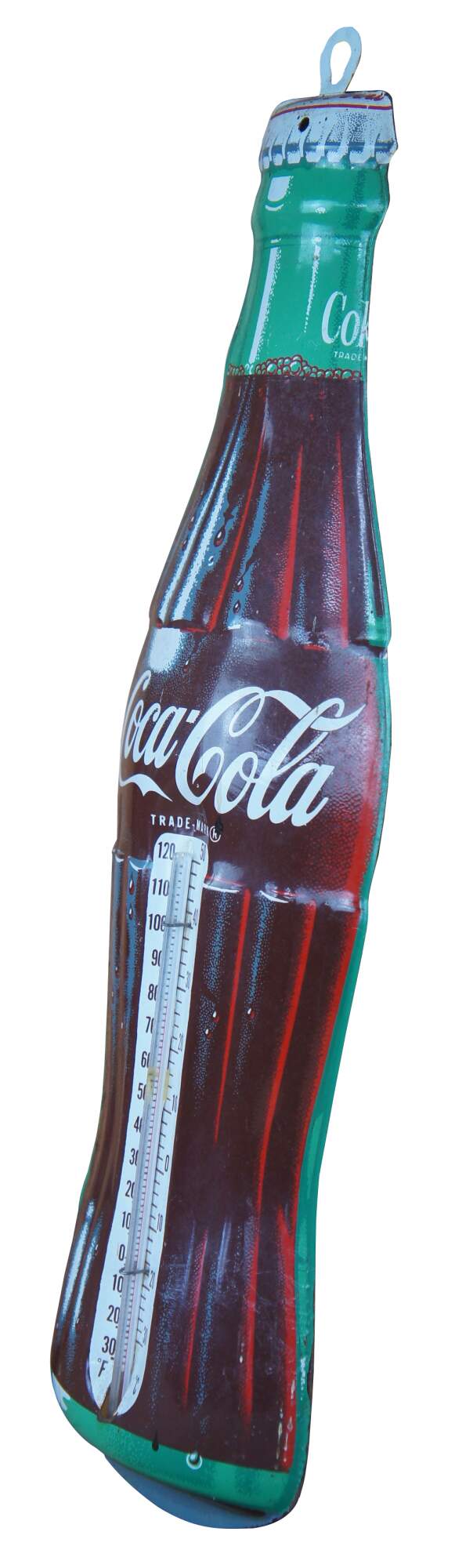 Outdoor thermometer by the Coca Cola company in the shape of a vintage glass bottle with original thermometer.