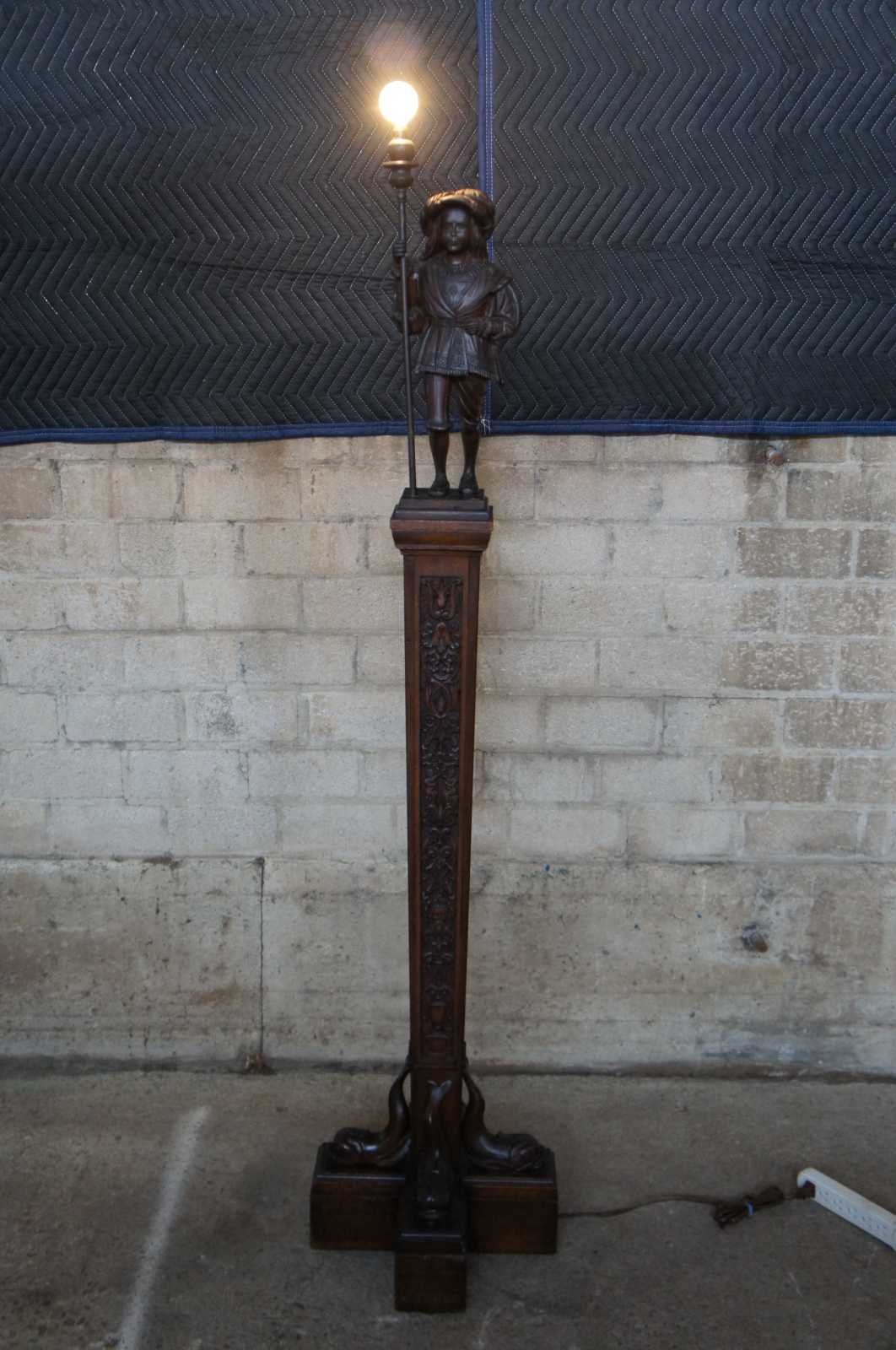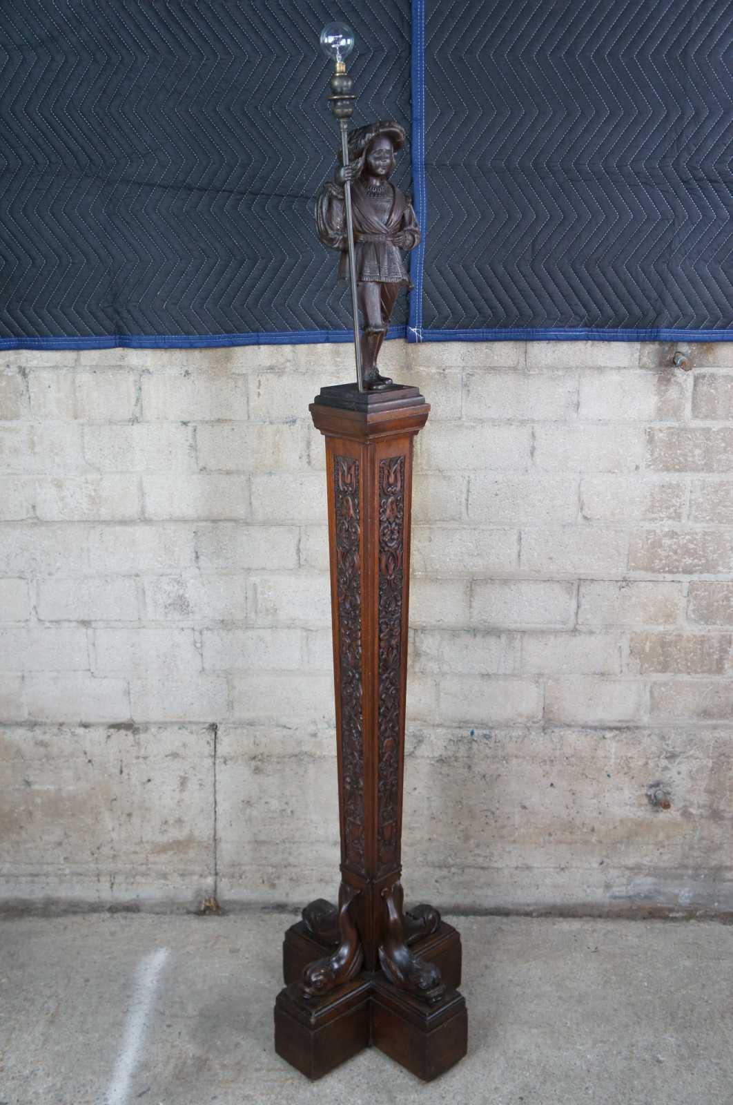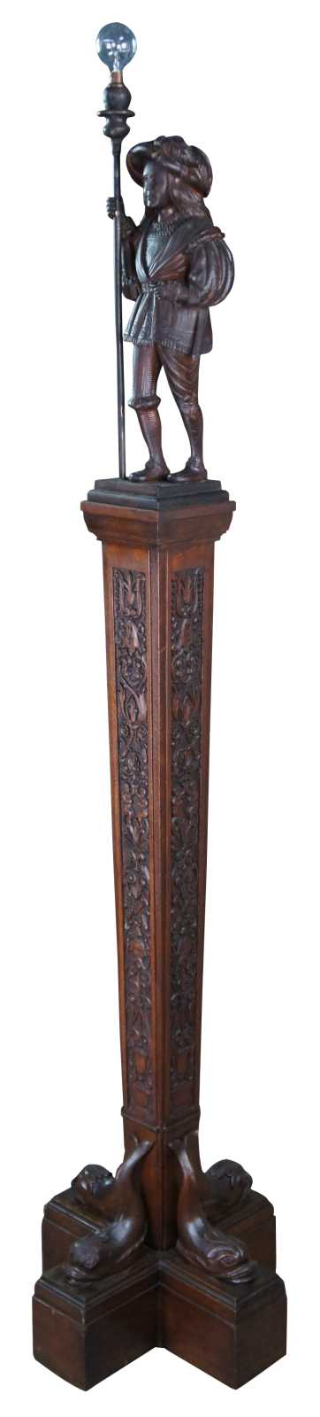A rare and one of a kind antique figural carved oak floor lamp, circa 1920s. Meticulously carved with amazing detail throughout. Features a Swiss guard with torchiere staff atop a square tapered heraldic column leading to dolphin base. Columnar sides include trophy urns, scrollwork, flowers, faces and cherubs. Lamp illuminates via switch along rear.