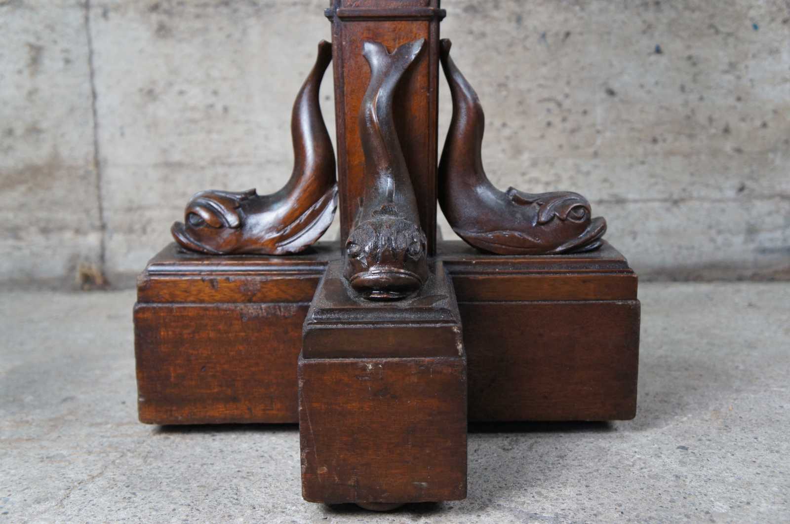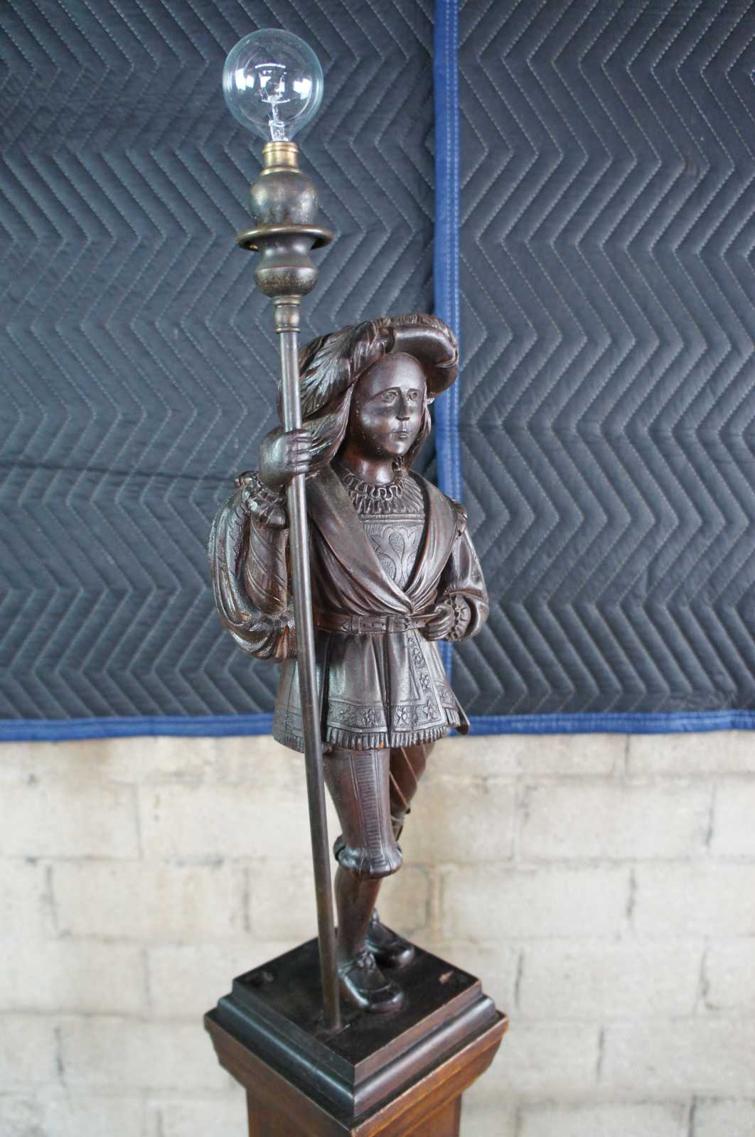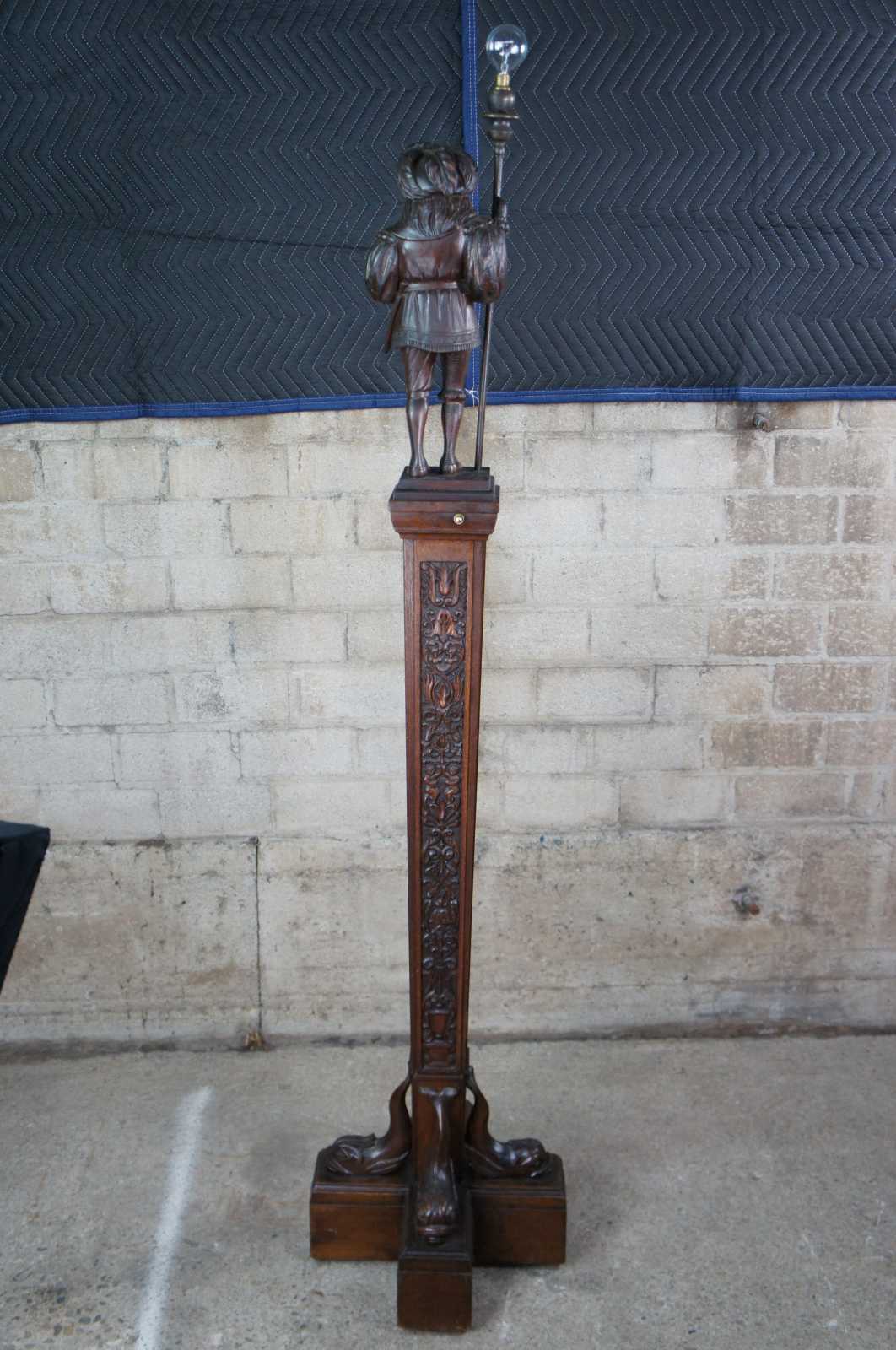 A rare and one of a kind antique figural carved oak floor lamp, circa 1920s. Meticulously carved with amazing detail throughout. Features a Swiss guard with torchiere staff atop a square tapered heraldic column leading to dolphin base. Columnar sides include trophy urns, scrollwork, flowers, faces and cherubs. Lamp illuminates via switch along rear.