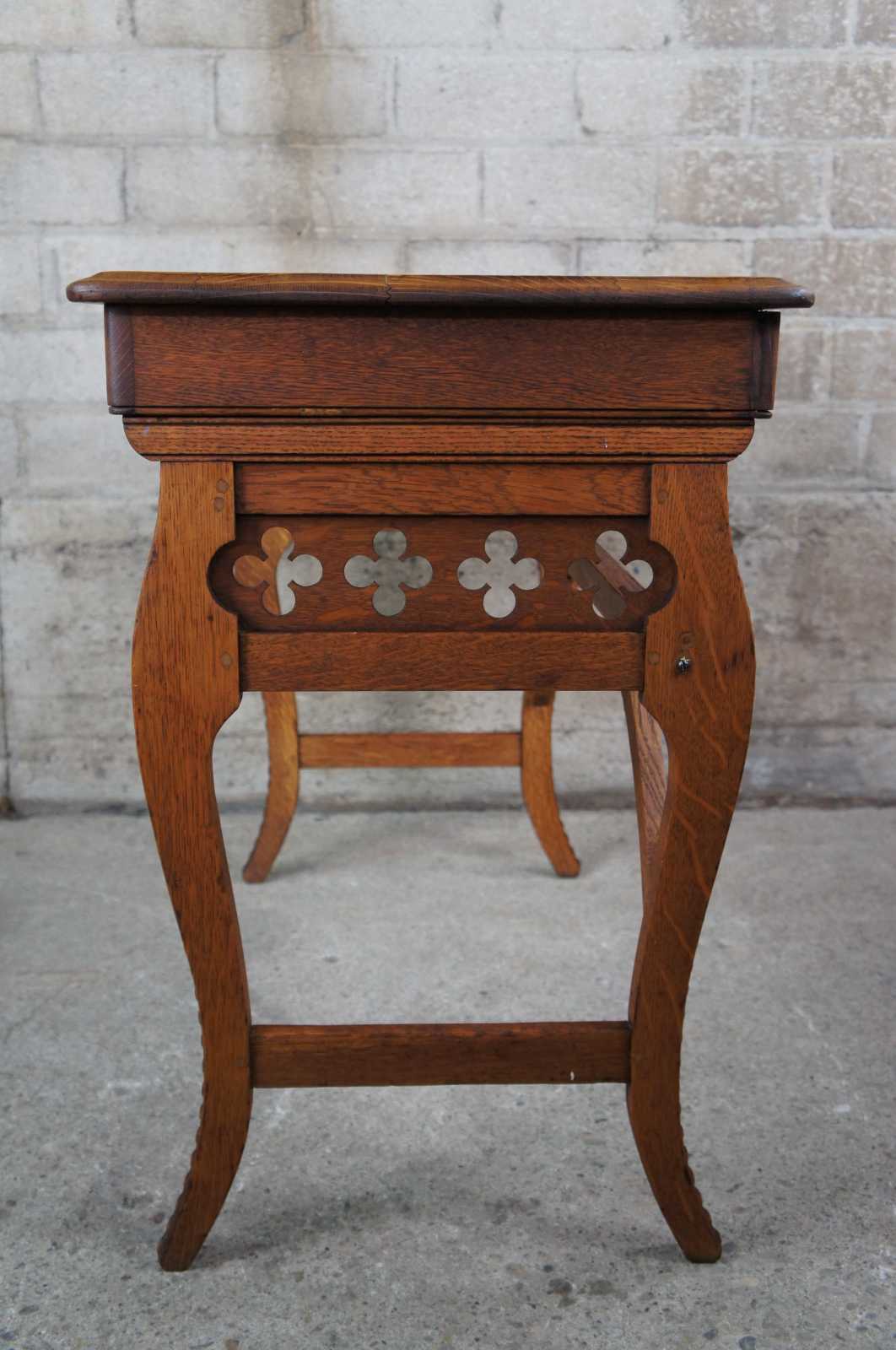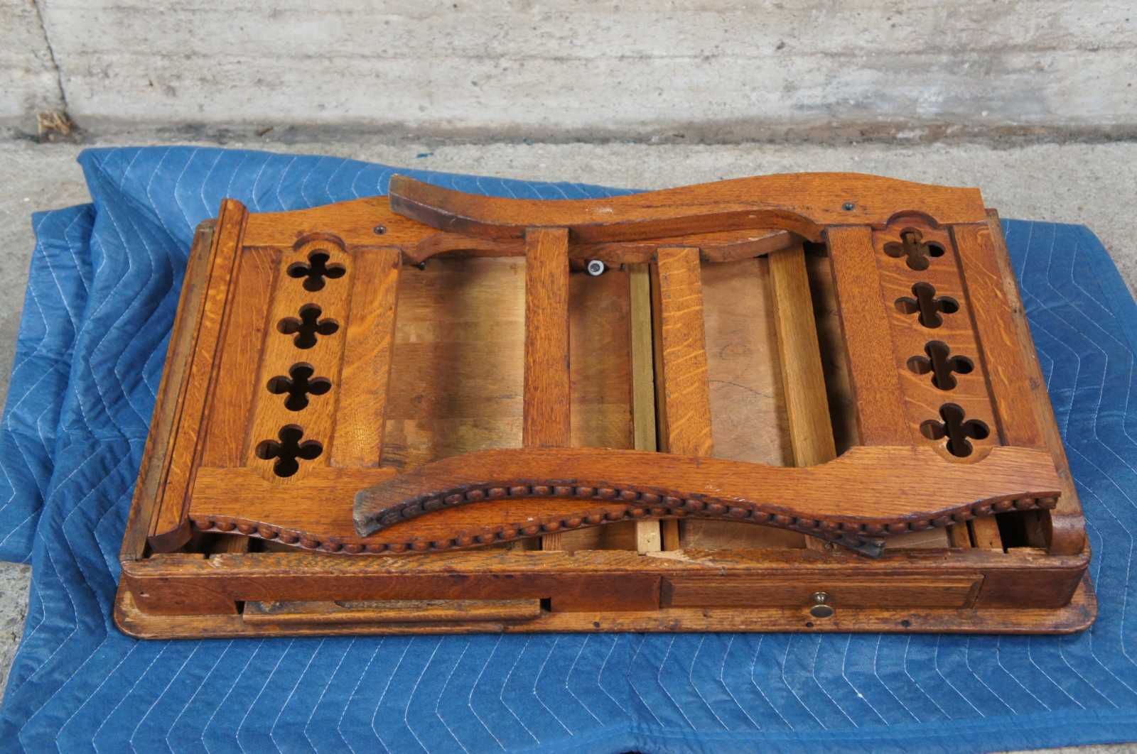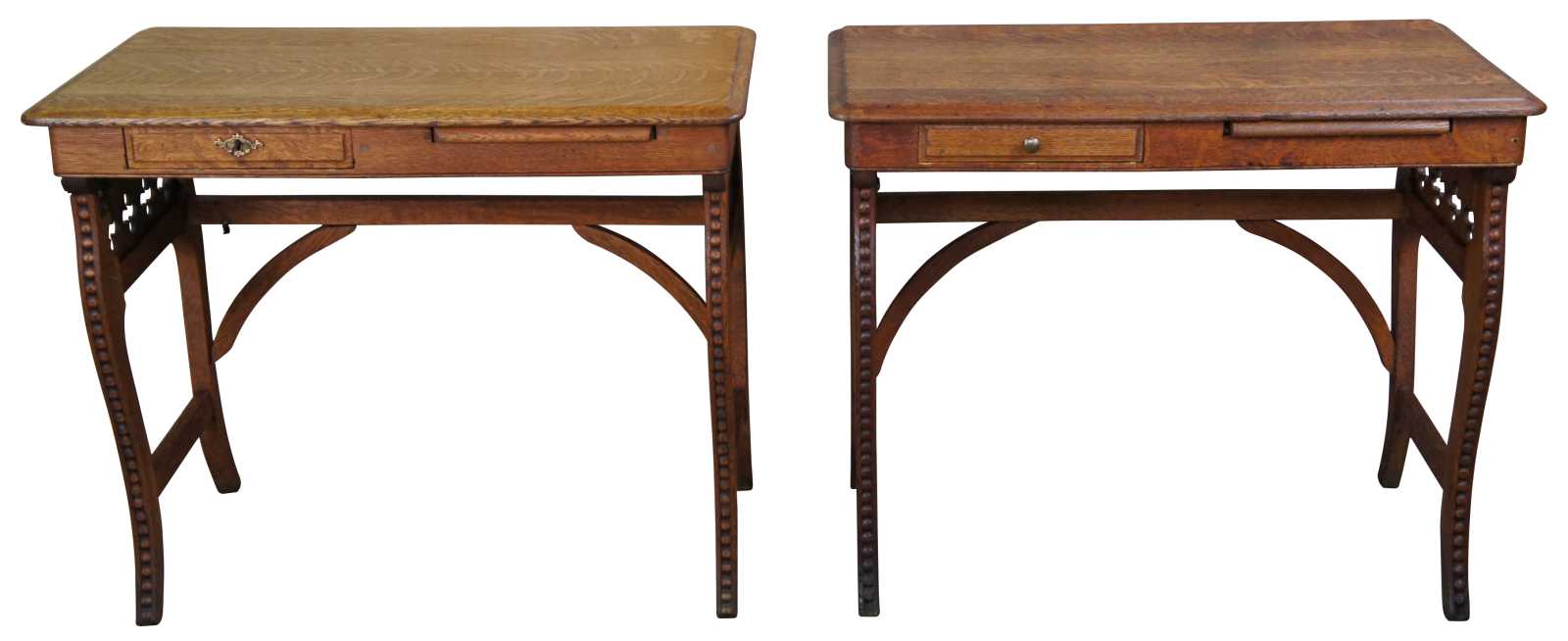 Pair of antique Civil War Era folding Campaign desks. Made of quartersawn oak featuring Gothic quatrefoil and beaded carved accents with drawer and pull out writing surface. Neatly folds for travel.