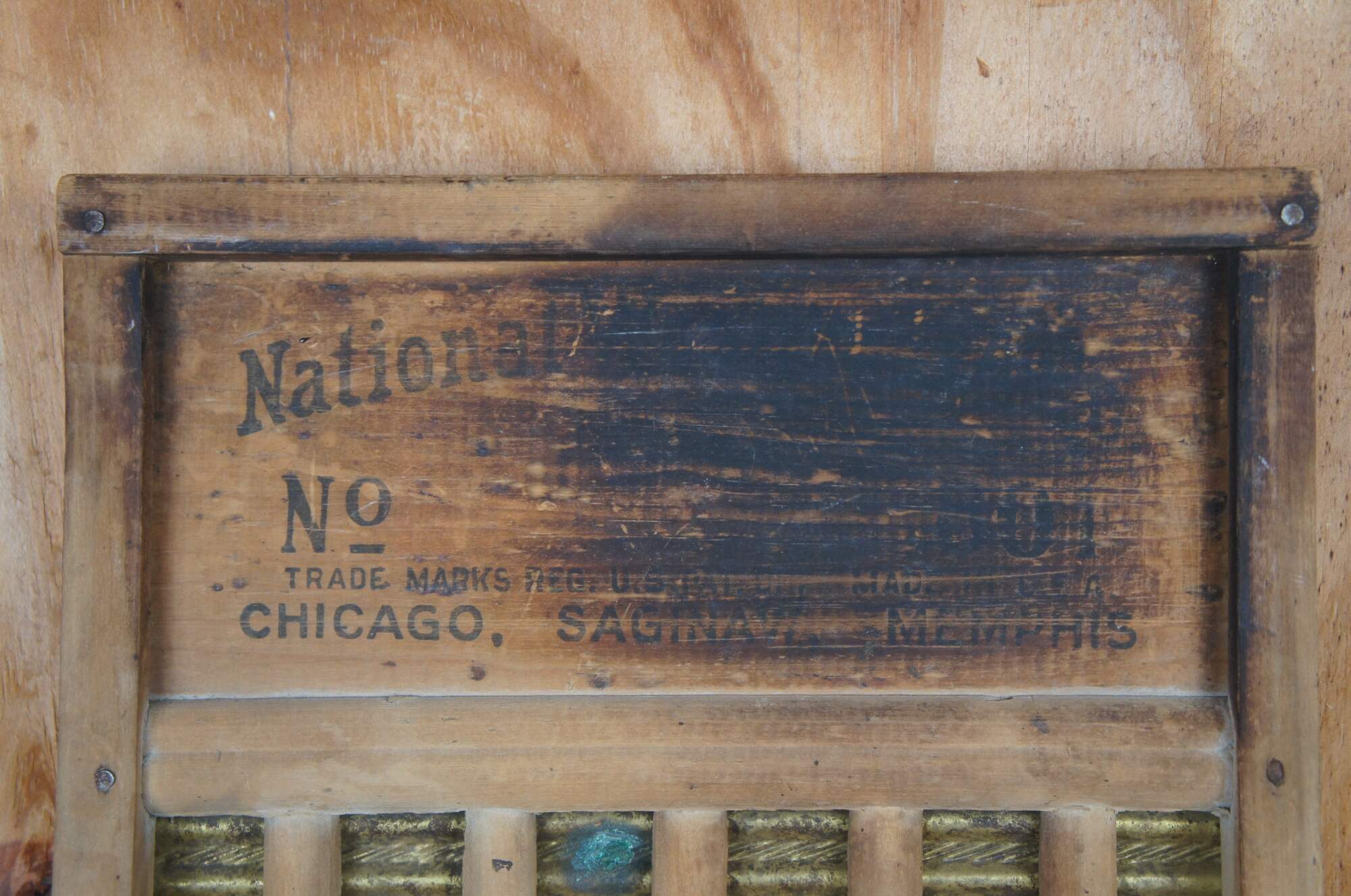 This vintage washboard features a wooden frame and ridged brass scrubbing plate.