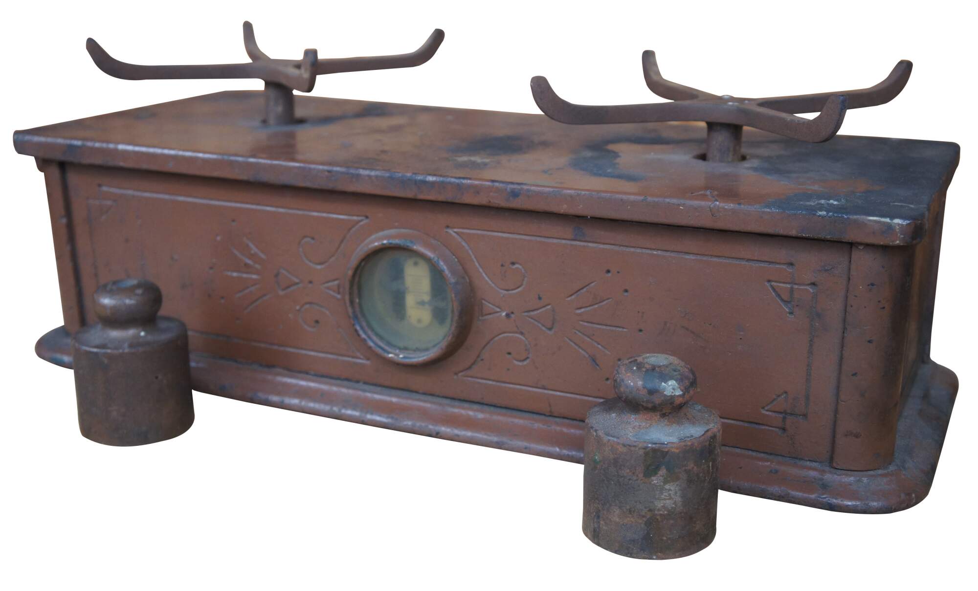 Antique Victorian mechanical apothecary or pharmacy balance scale with wood construction featuring Eastlake styling. Includes two cast iron 1 kilo weights.