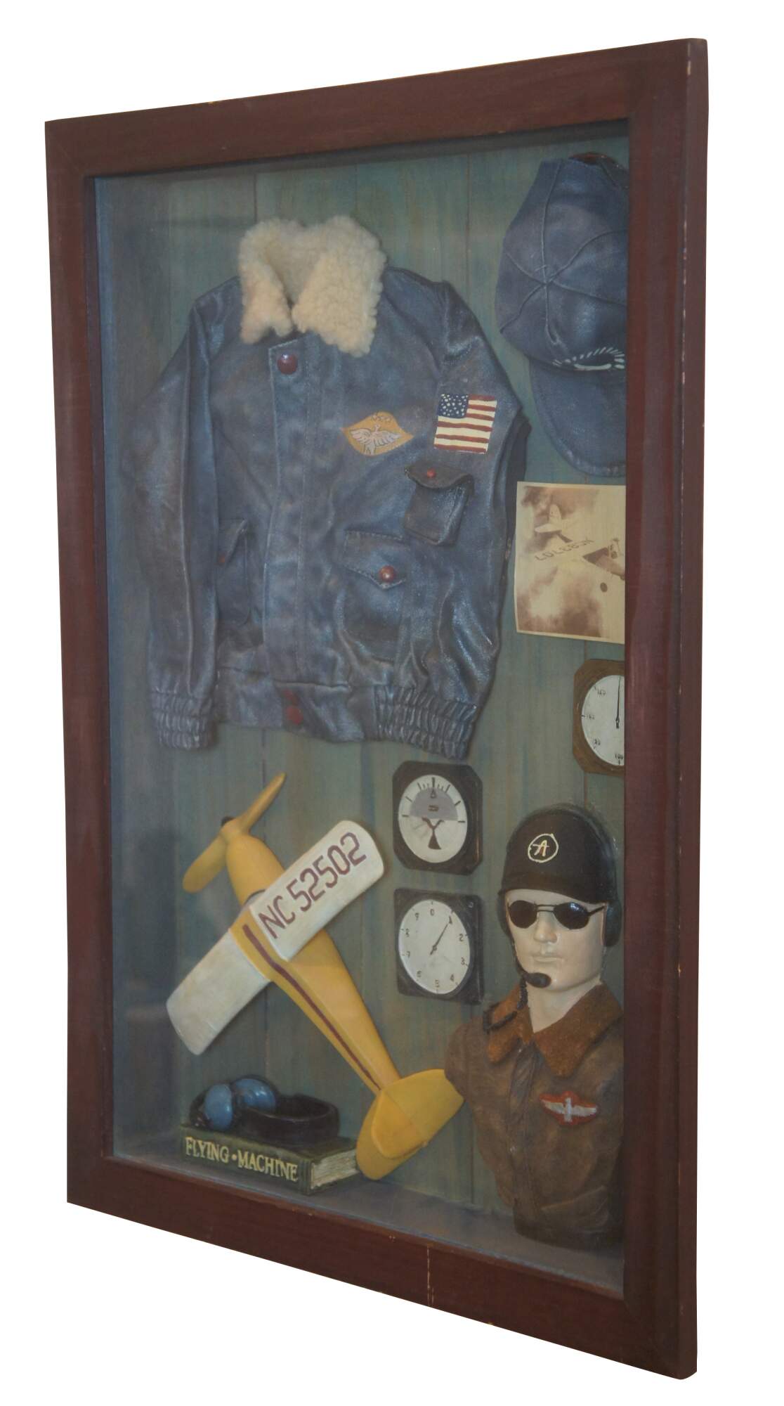 Vintage aeronaut shadow box or display featuring pilot, aviator / bomber jacket, hat, NC 52502 plane / aircraft (most likely a piper cub), Flying Machine book, head gear, and other collectible items.