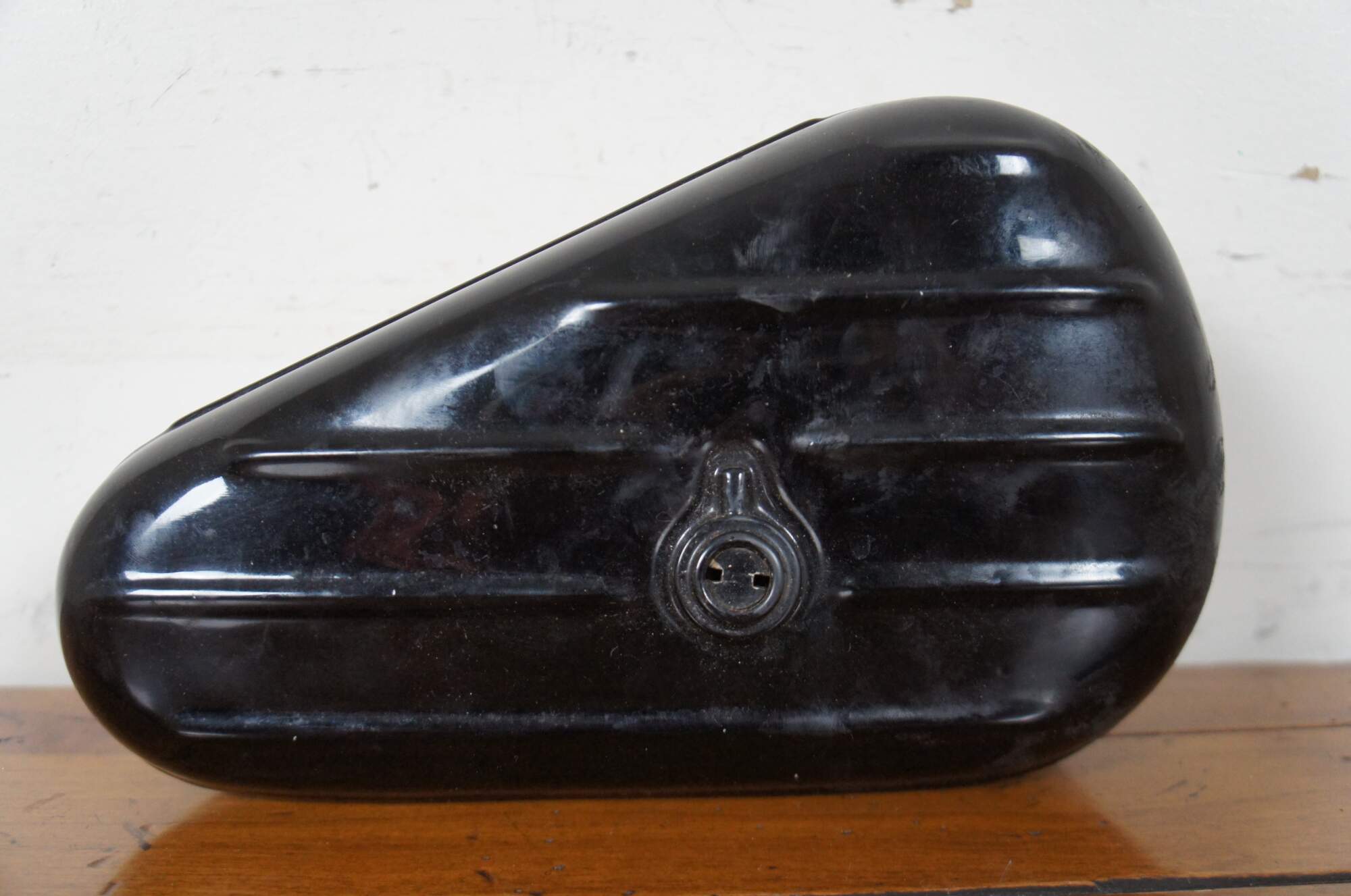 1950s Rare Vintage Harley-Davidson black ribbed kidney shaped OEM Hydraglide metal tool box for all Panhead motorcycles from 1940-1964. Originally purchased in the 1980s from the Pennsylvania warehouse where a cache of old Harley parts were discovered.