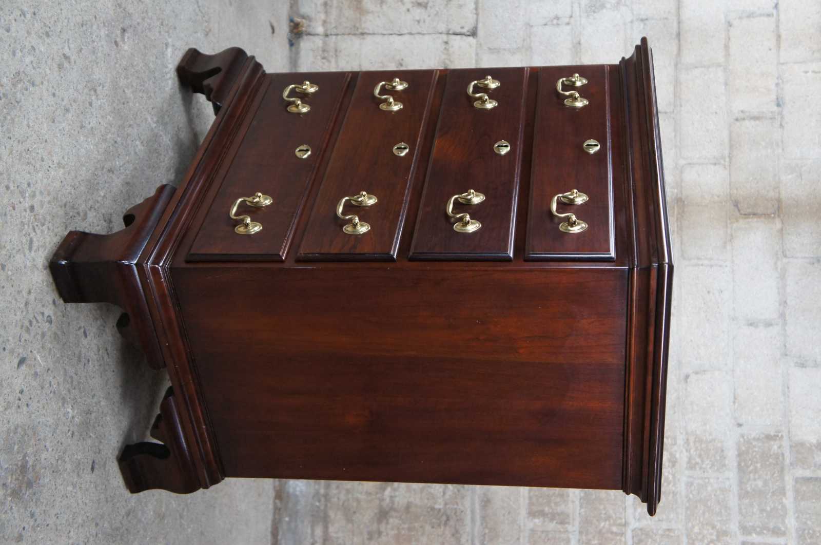 Two Vintage Statton Trutype Americana Old Towne nightstands or bedside tables, circa last quarter 20th century. Made of solid cherry featuring four drawers with brass hardware and bracket feet.