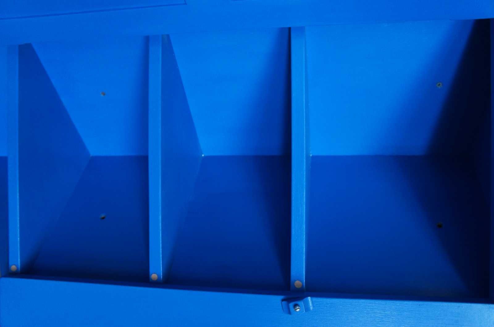 Vintage Roscoe Village Early American style wall hanging corner cabinet featuring a paneled door with tiered shelving and painted in an electric blue finish.
