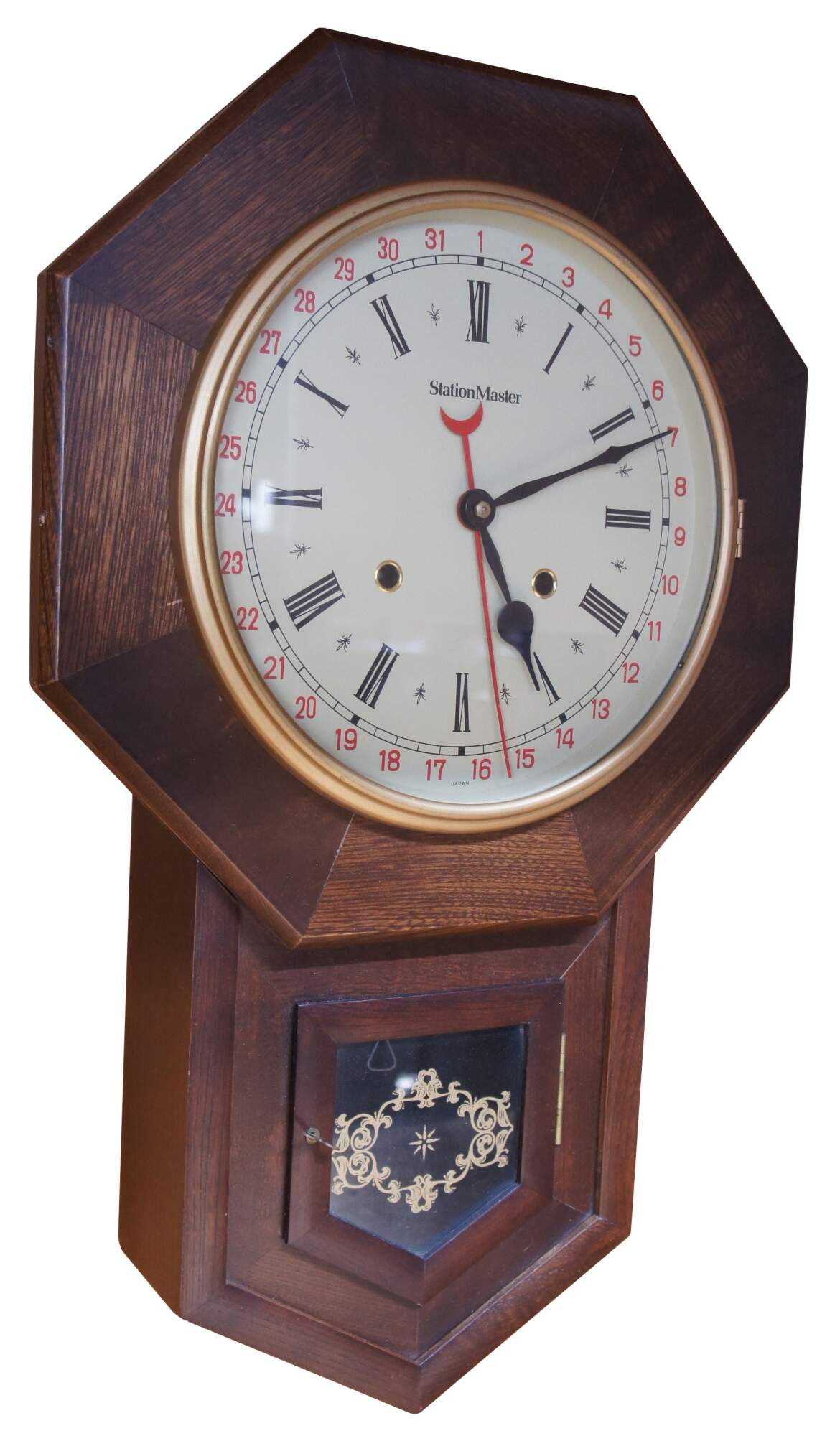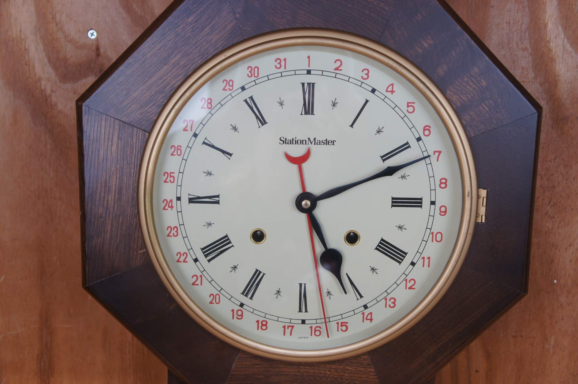 Wall hanging clock by StationMaster with tin face in decorative wood setting.