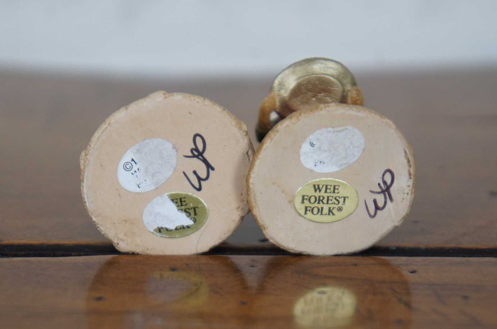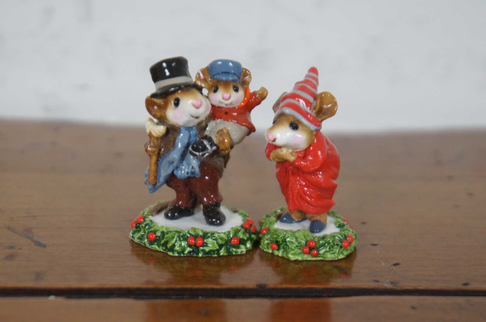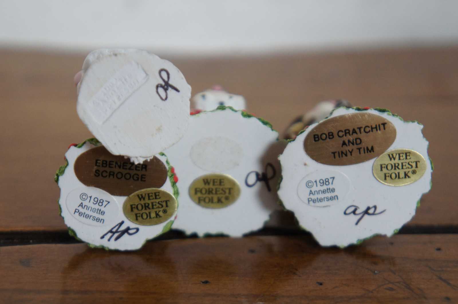 Set of eleven Wee Forest Folk Christmas themed figurines, five initialed by Donna Petersen, four by Annette Petersen, and two by William Petersen. Set includes Jenny’s Jam and Jellies M-256, Wreath Maker M-231, The Nutcracker M-174, Miss Noel M-146, Home Sweet Home M-227, Pudding Anyone? M-250, Christmas Cupboard M-241, Crystal M-275, and from the A Christmas Carol series, Scrooge CC-1, and Bob Cratchit & Tiny Tim CC-2.