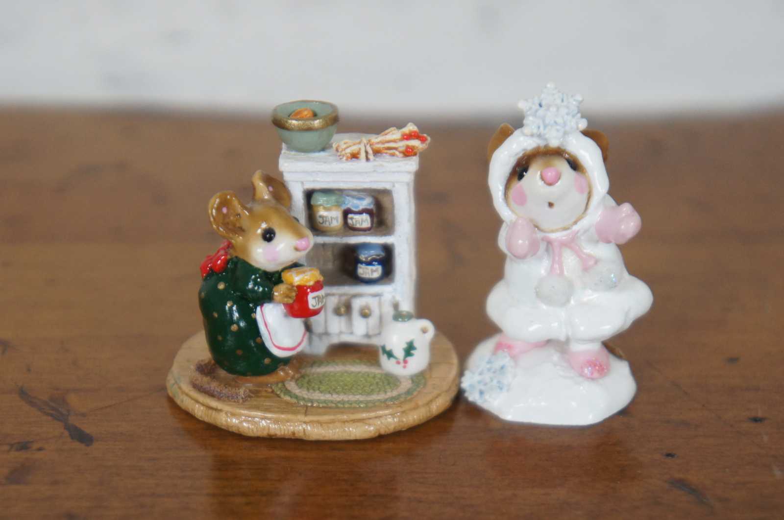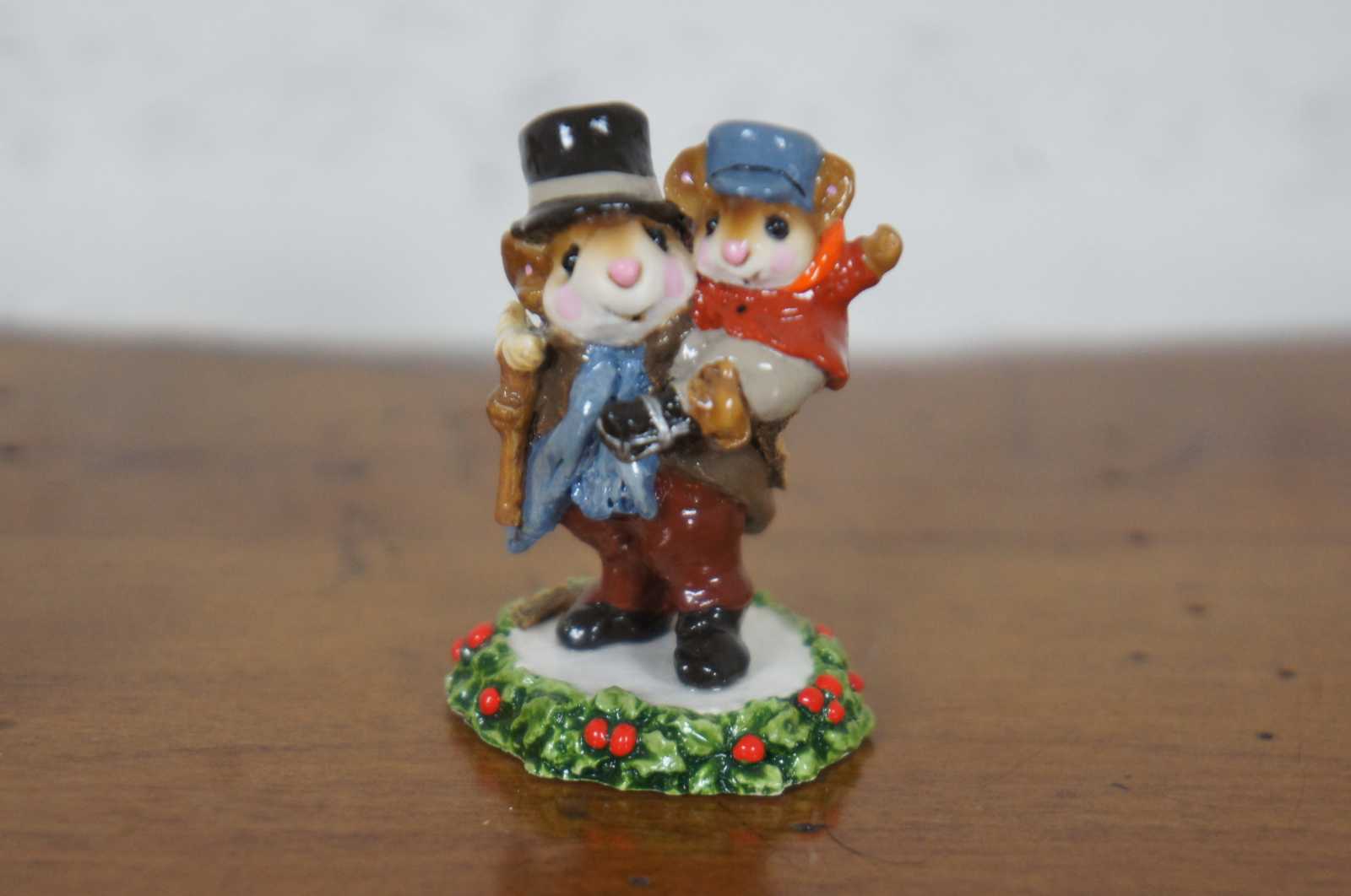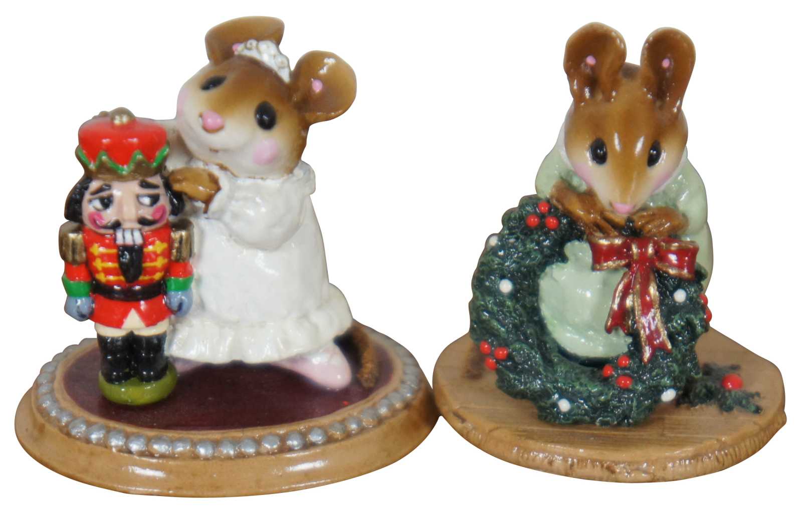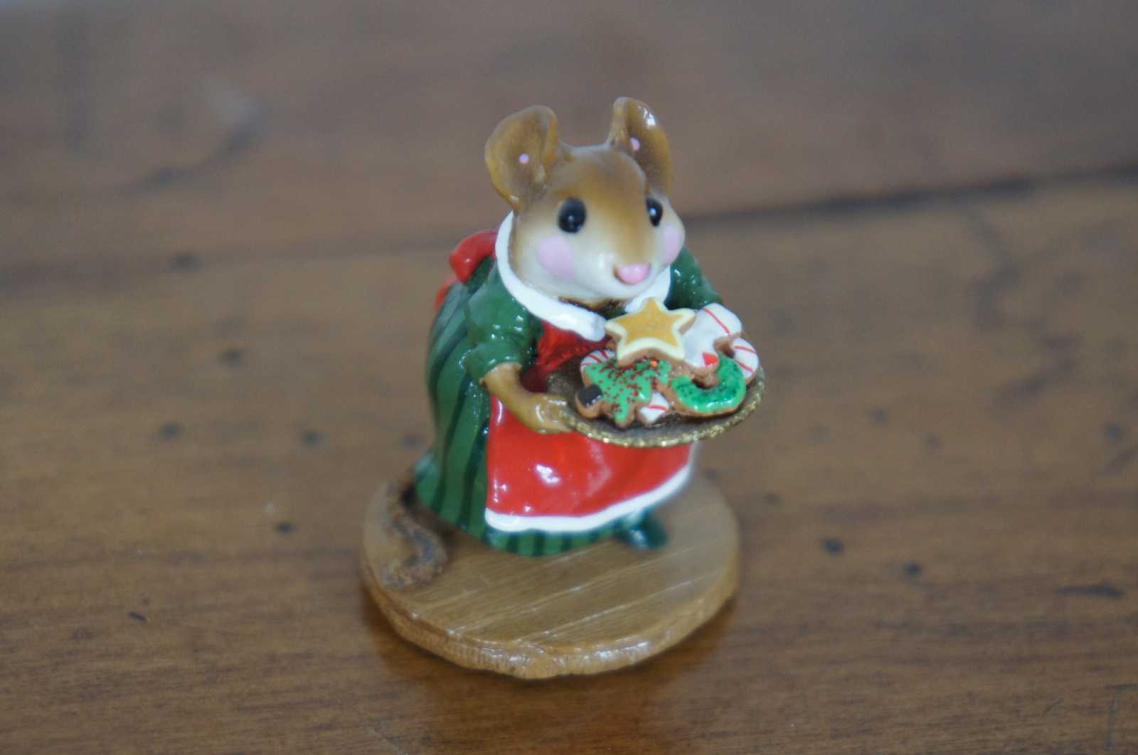 Set of eleven Wee Forest Folk Christmas themed figurines, five initialed by Donna Petersen, four by Annette Petersen, and two by William Petersen. Set includes Jenny’s Jam and Jellies M-256, Wreath Maker M-231, The Nutcracker M-174, Miss Noel M-146, Home Sweet Home M-227, Pudding Anyone? M-250, Christmas Cupboard M-241, Crystal M-275, and from the A Christmas Carol series, Scrooge CC-1, and Bob Cratchit & Tiny Tim CC-2.