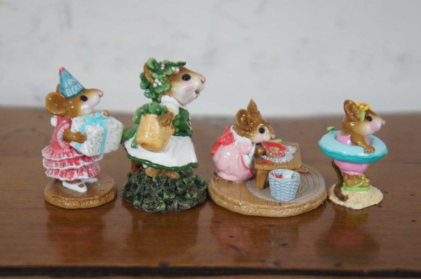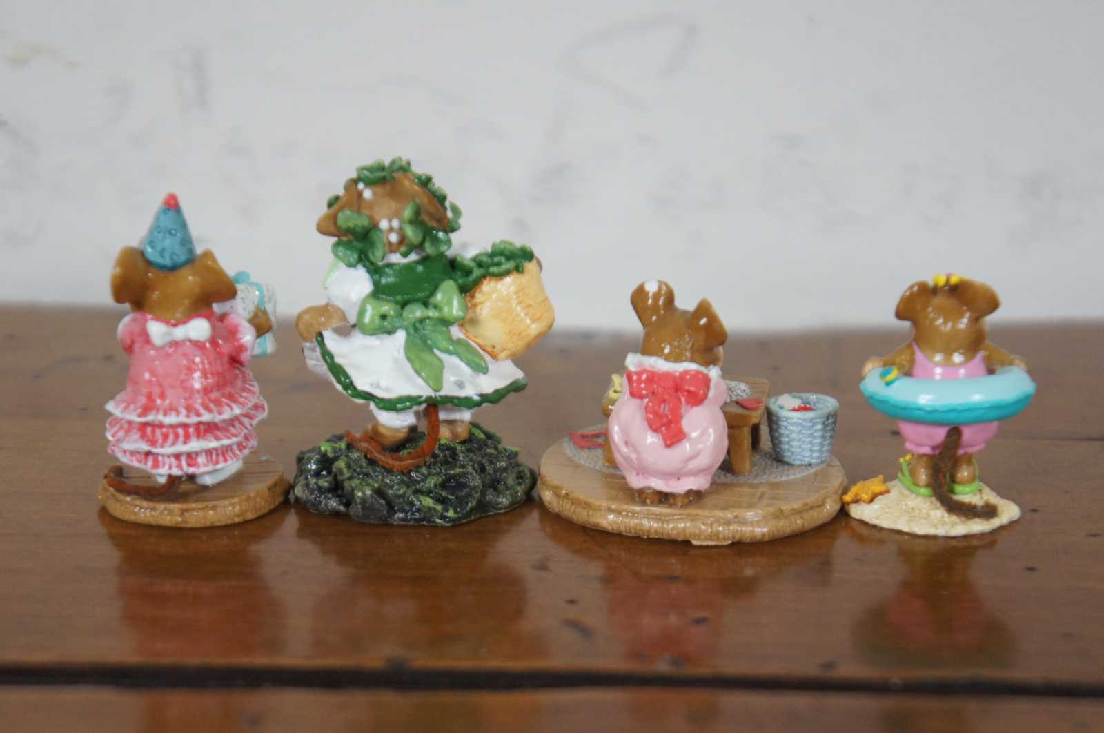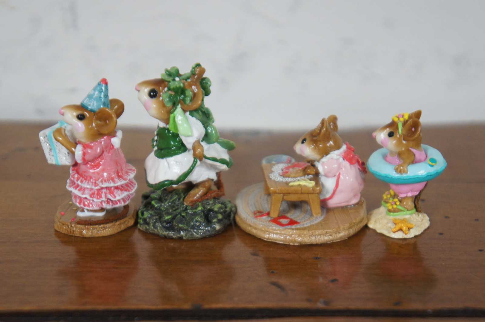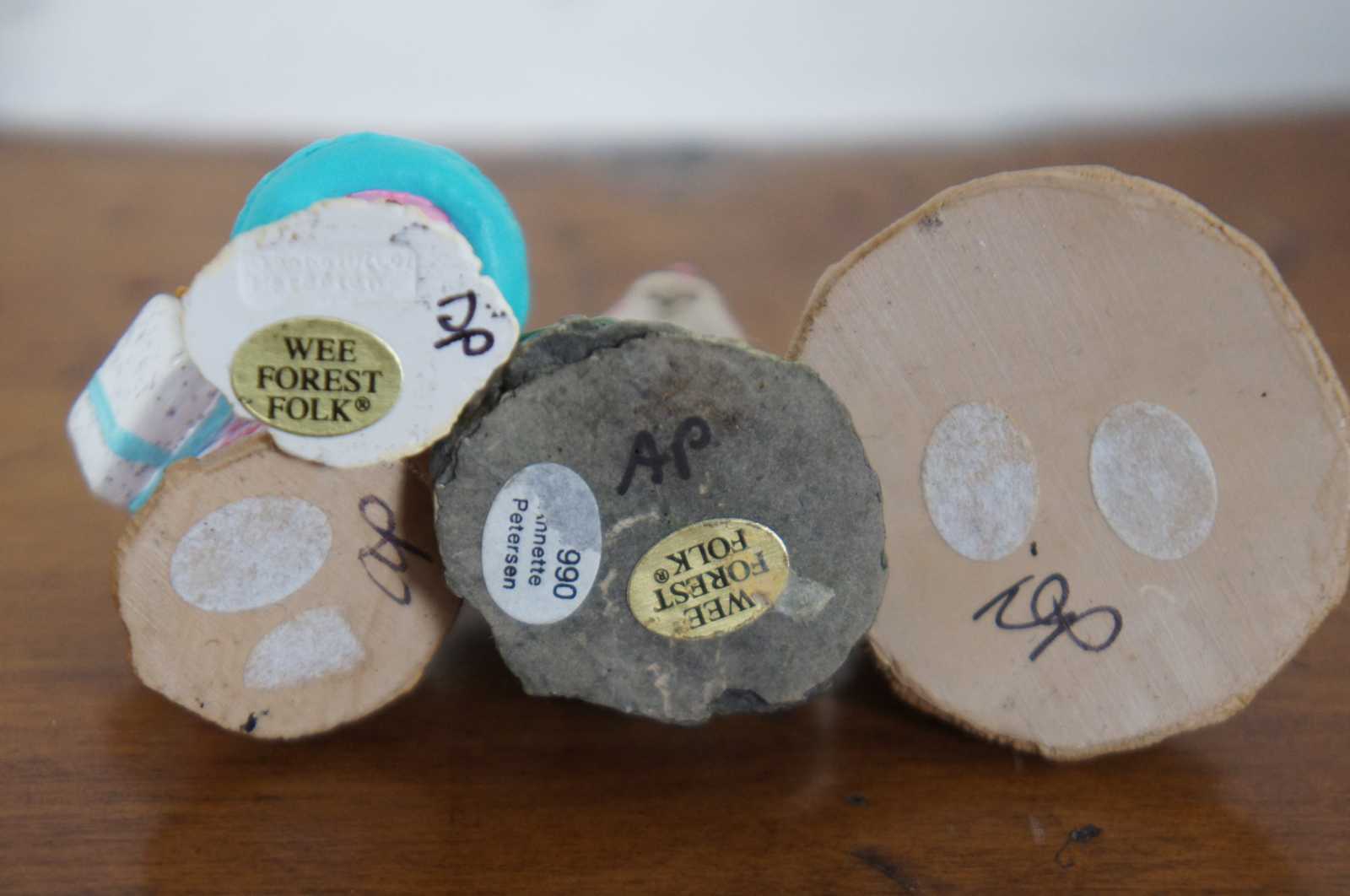 Set of four assorted holiday themed Wee Forest folk Figurines, initialed by Donna and Annette Petersen. Set includes Colleen O’Green M-167 for St. Patrick’s Day, Clementine M-204 for St. Valentine’s Day, Party Girl M-224 for birthdays, and Little Dipper Swimmer M-278 from the On the Beach series for summer vacation.