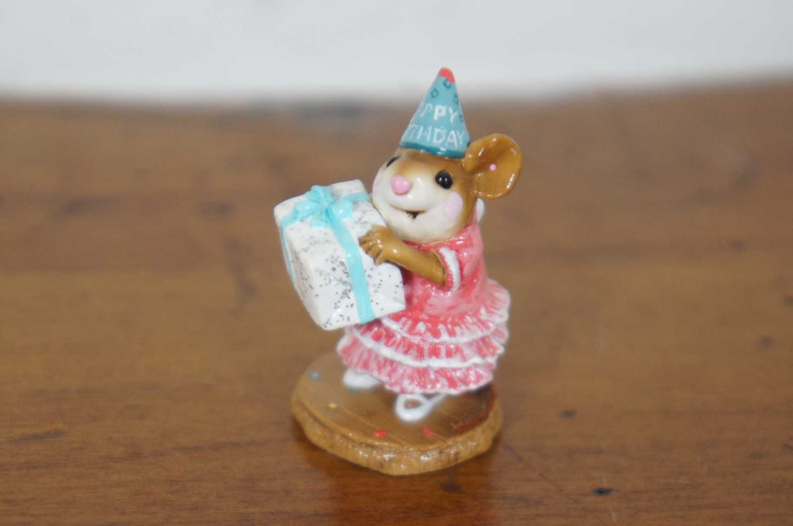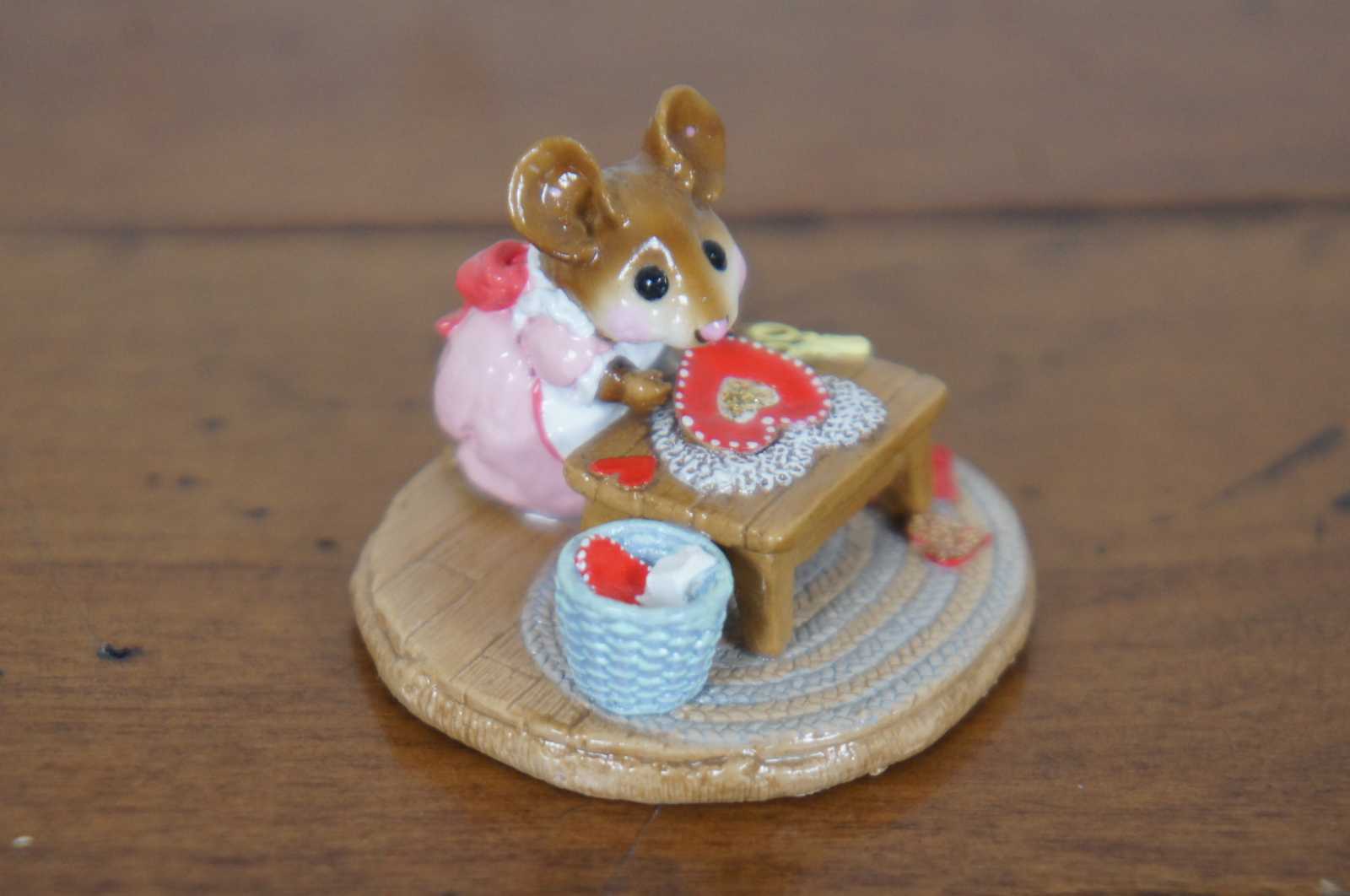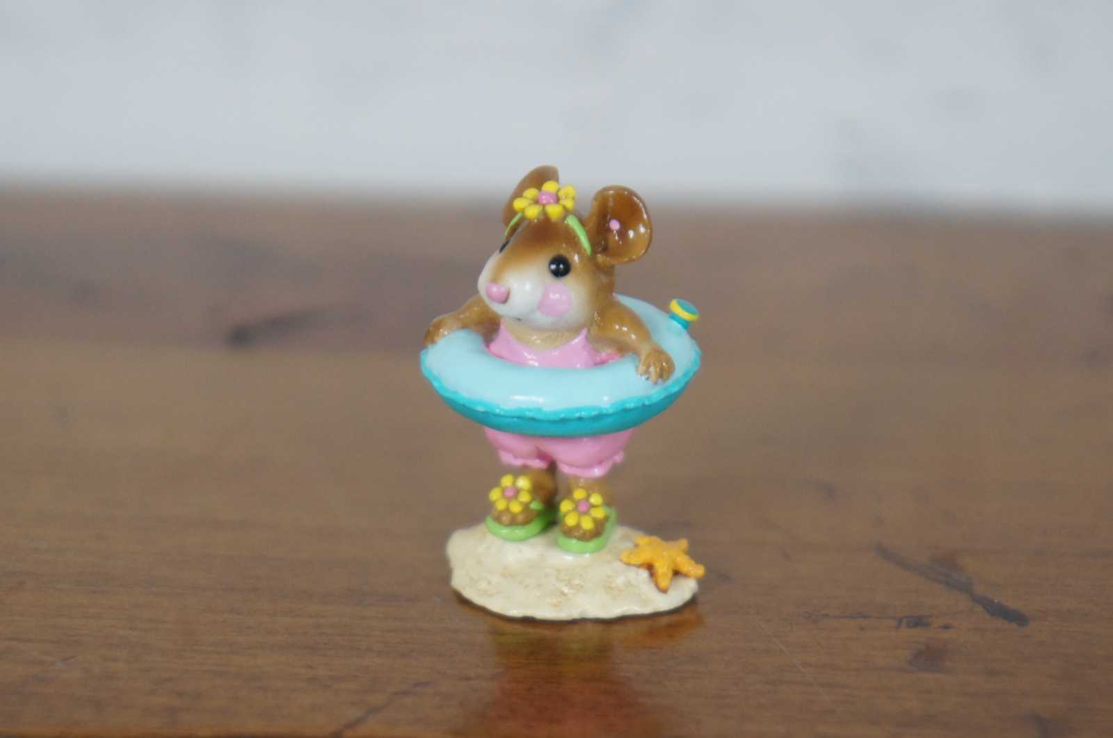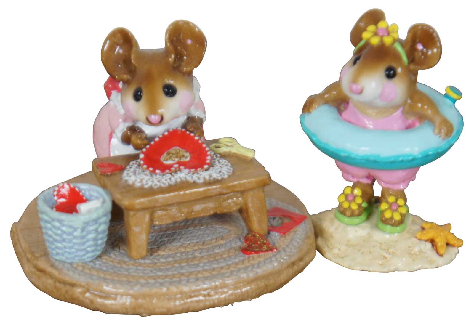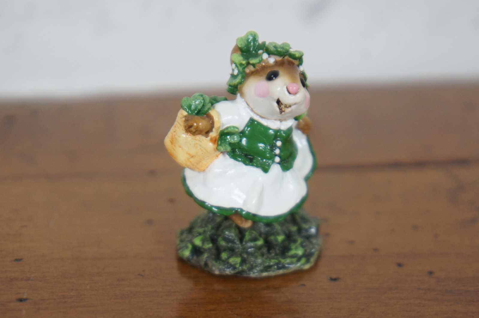 Set of four assorted holiday themed Wee Forest folk Figurines, initialed by Donna and Annette Petersen. Set includes Colleen O’Green M-167 for St. Patrick’s Day, Clementine M-204 for St. Valentine’s Day, Party Girl M-224 for birthdays, and Little Dipper Swimmer M-278 from the On the Beach series for summer vacation.