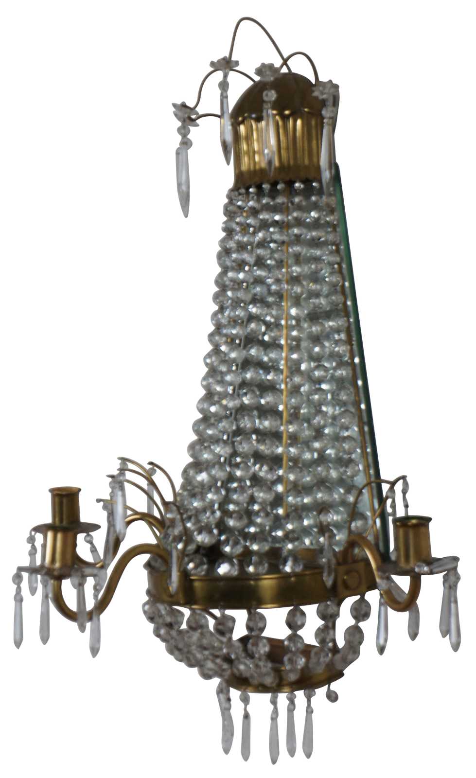 Pair of two mid century French Empire Garland three candle wall sconces made of brass with mirrored backs under sweeping strings of tapered crystal beads and drop crystal accents on the arms.
