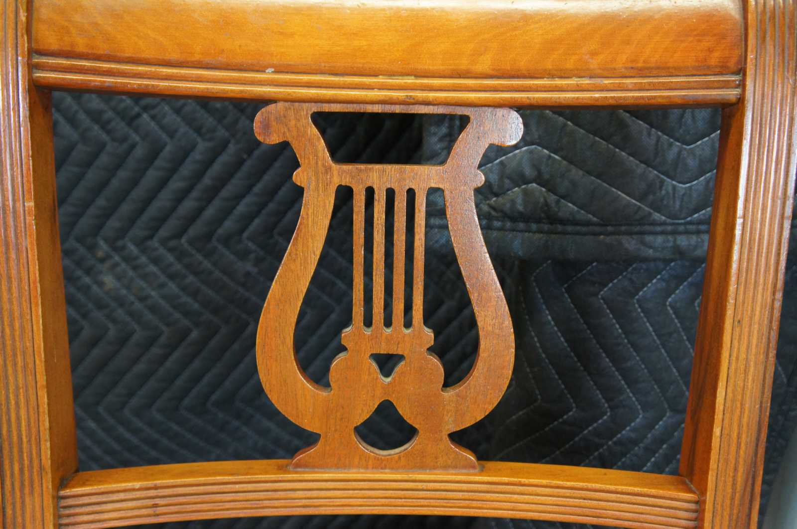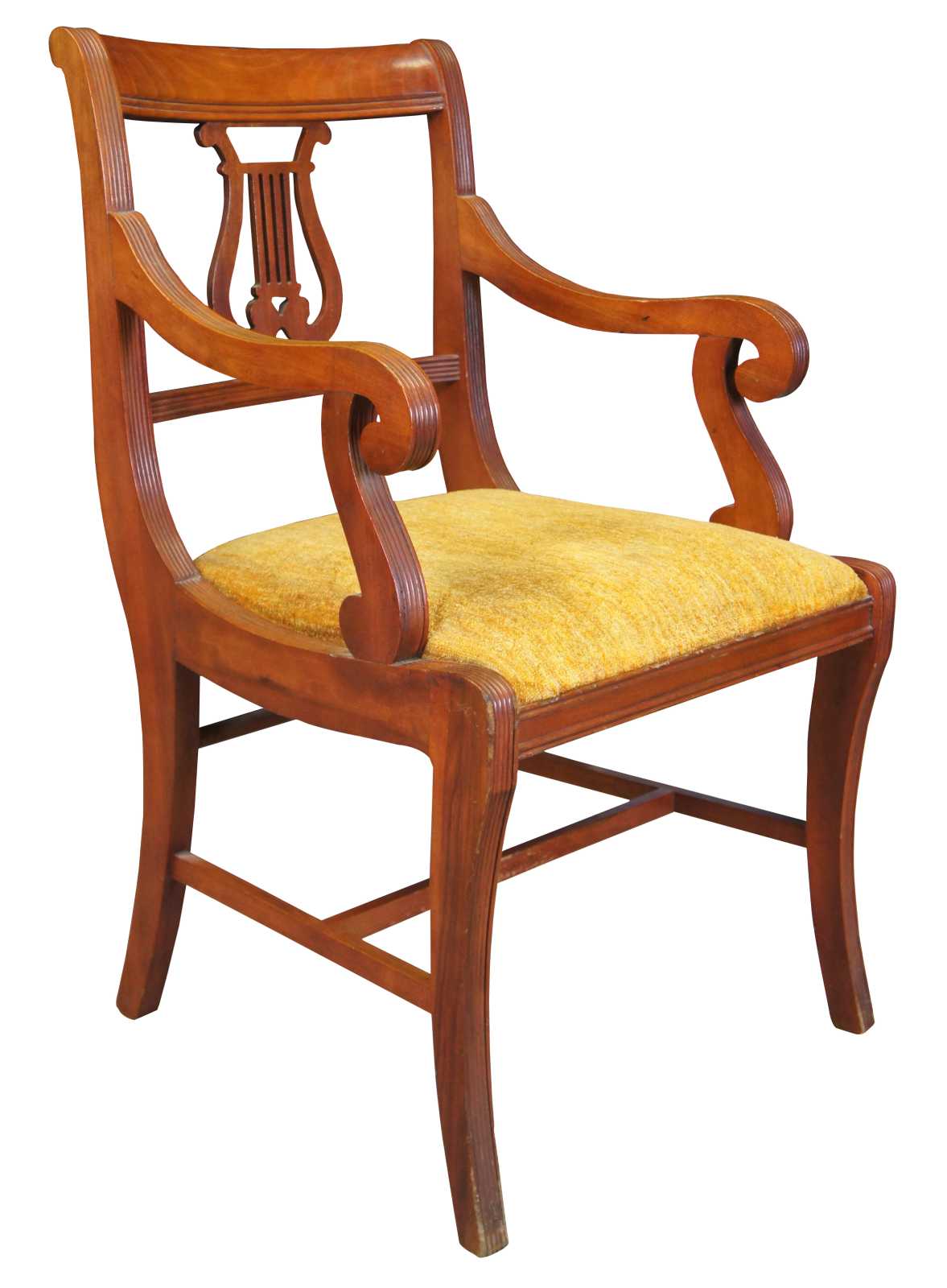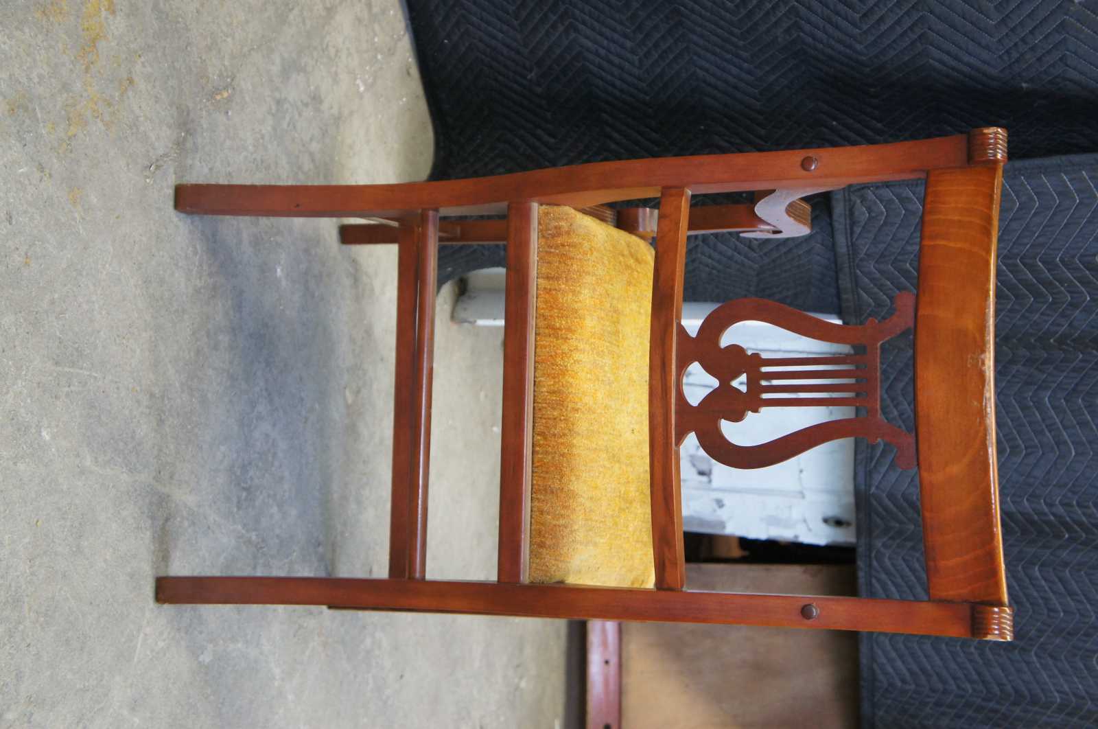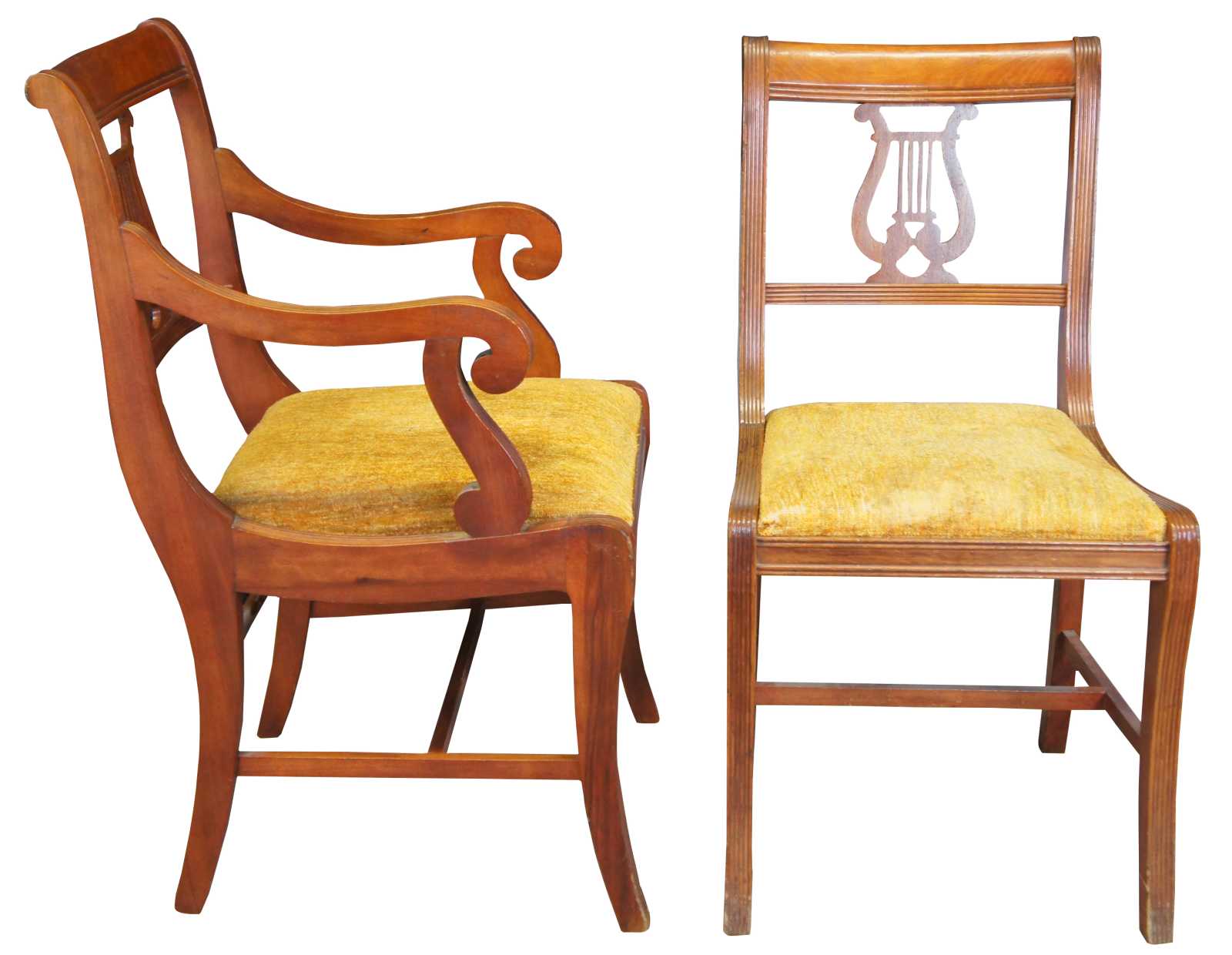 Six Duncan Phyfe dining chairs, circa mid 20th century. Made of mahogany featuring serpentine form with a lyre harpe back and fluted accents. 705-185, H-6746.