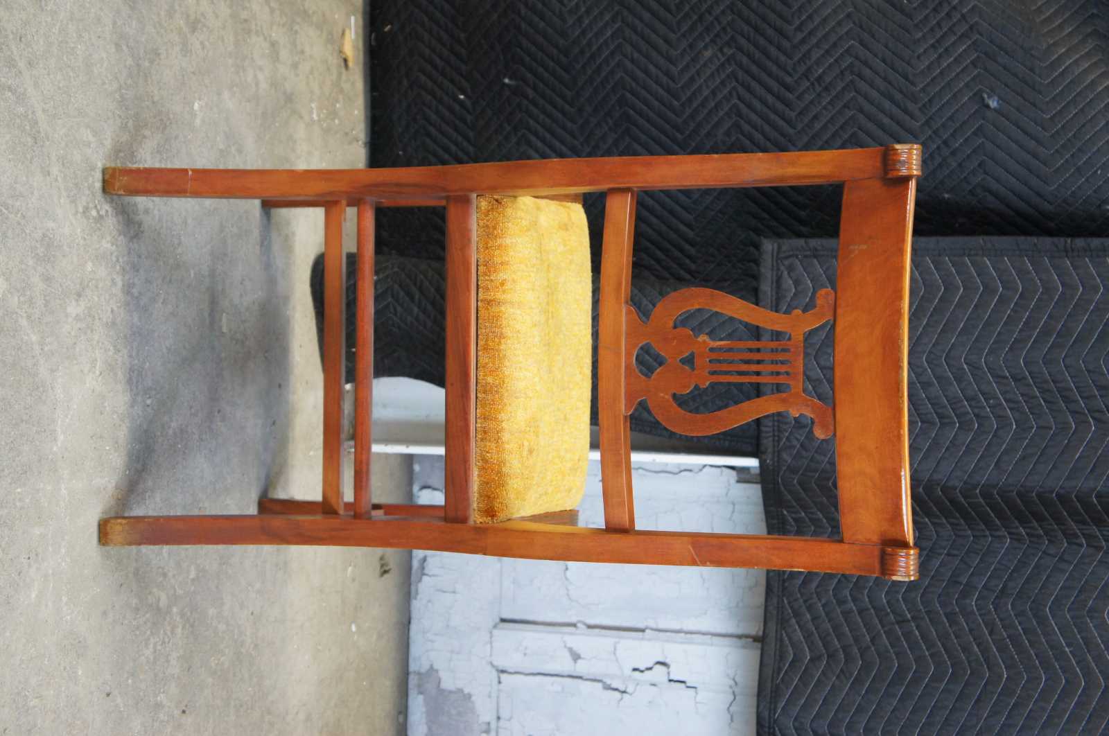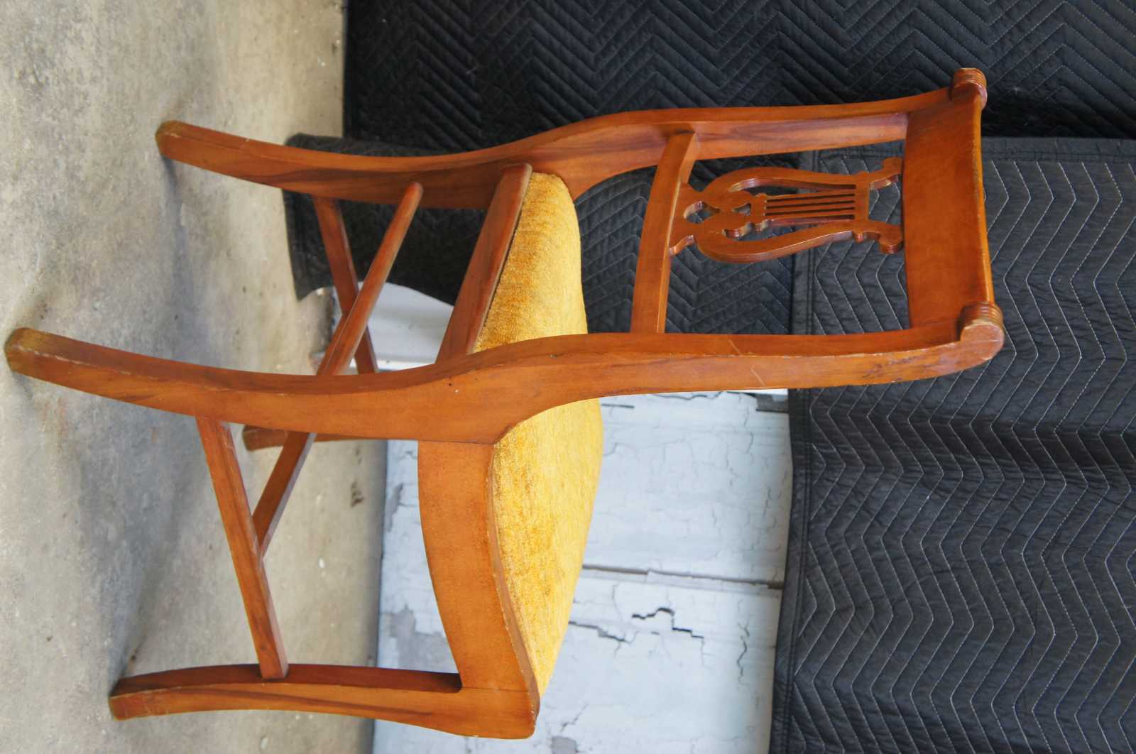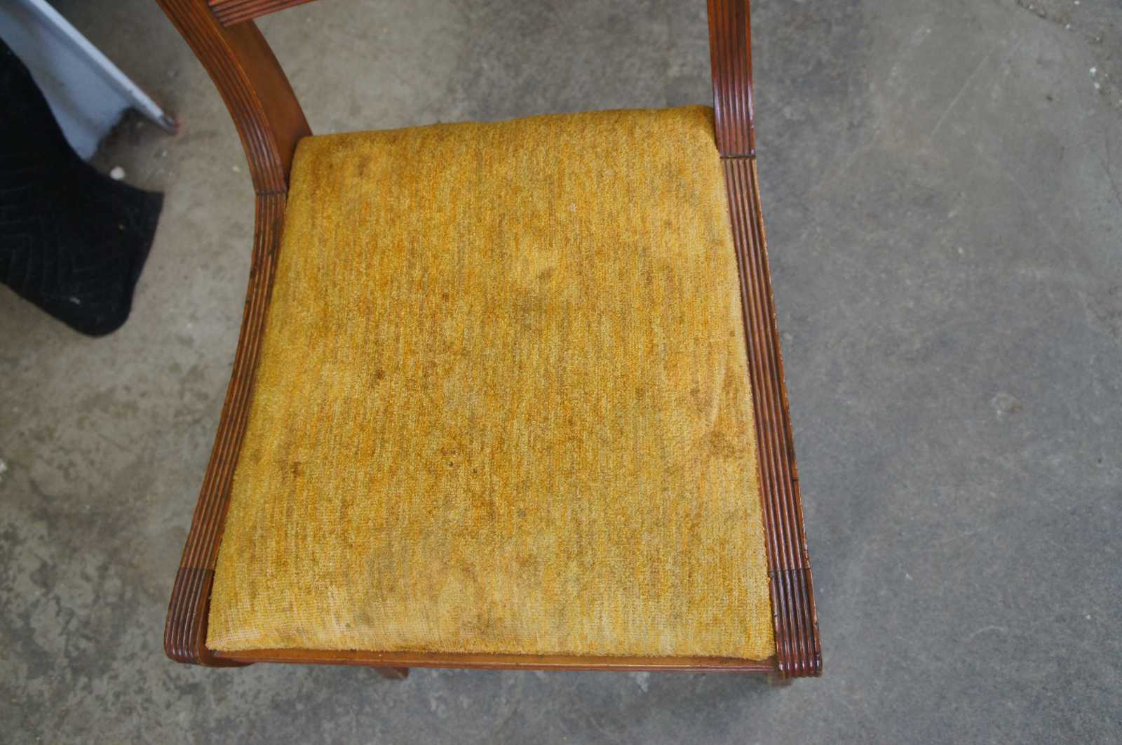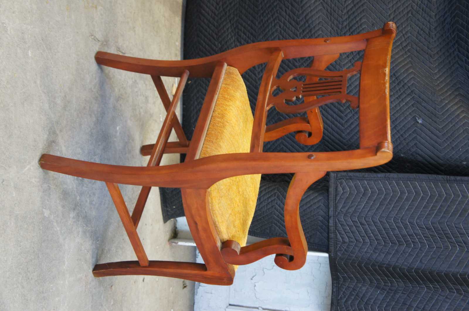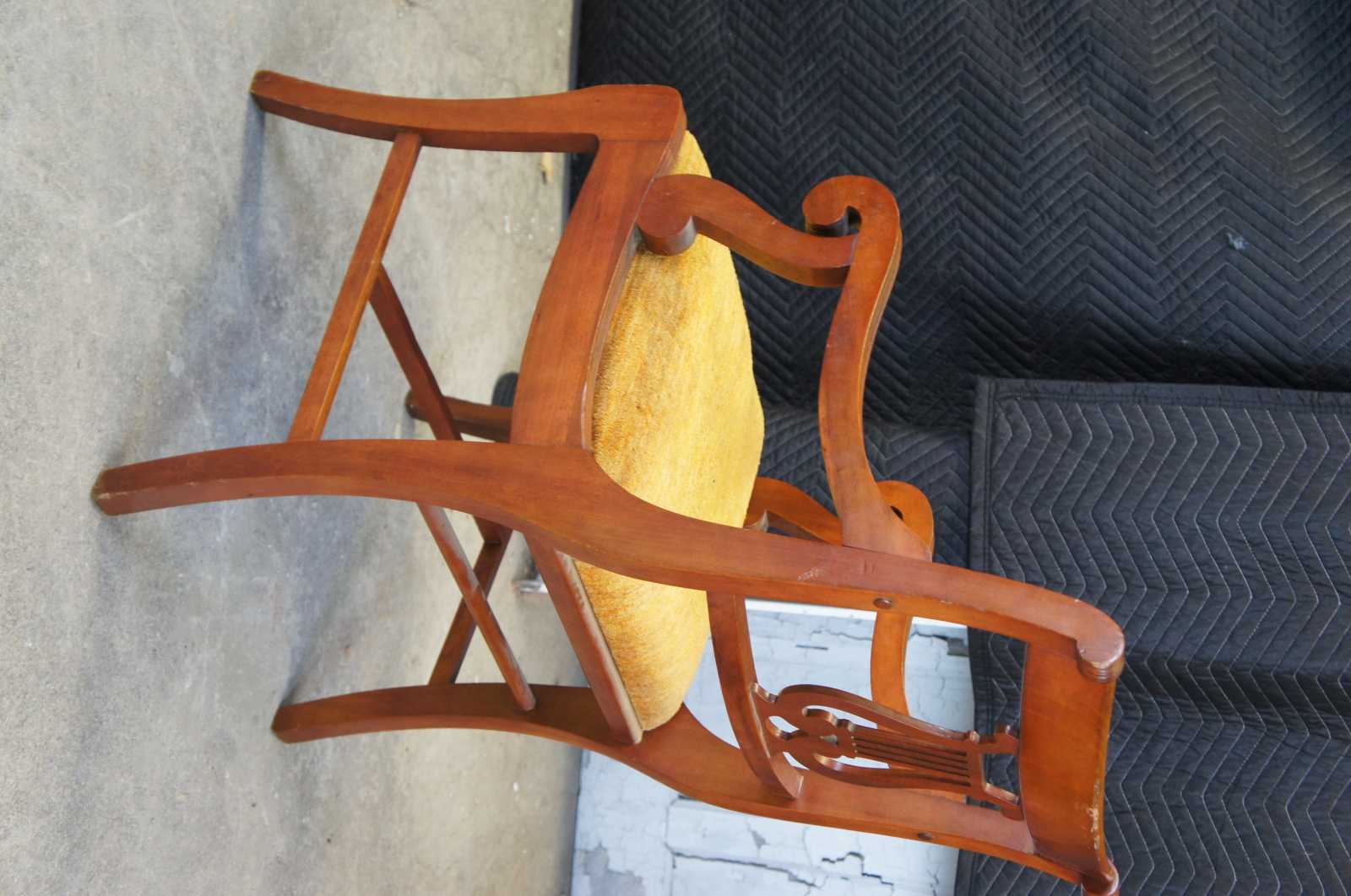 Six Duncan Phyfe dining chairs, circa mid 20th century. Made of mahogany featuring serpentine form with a lyre harpe back and fluted accents. 705-185, H-6746.