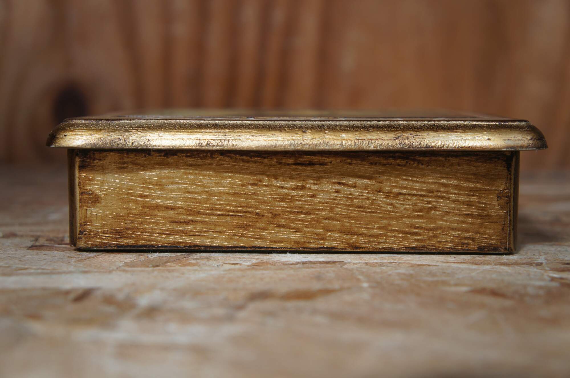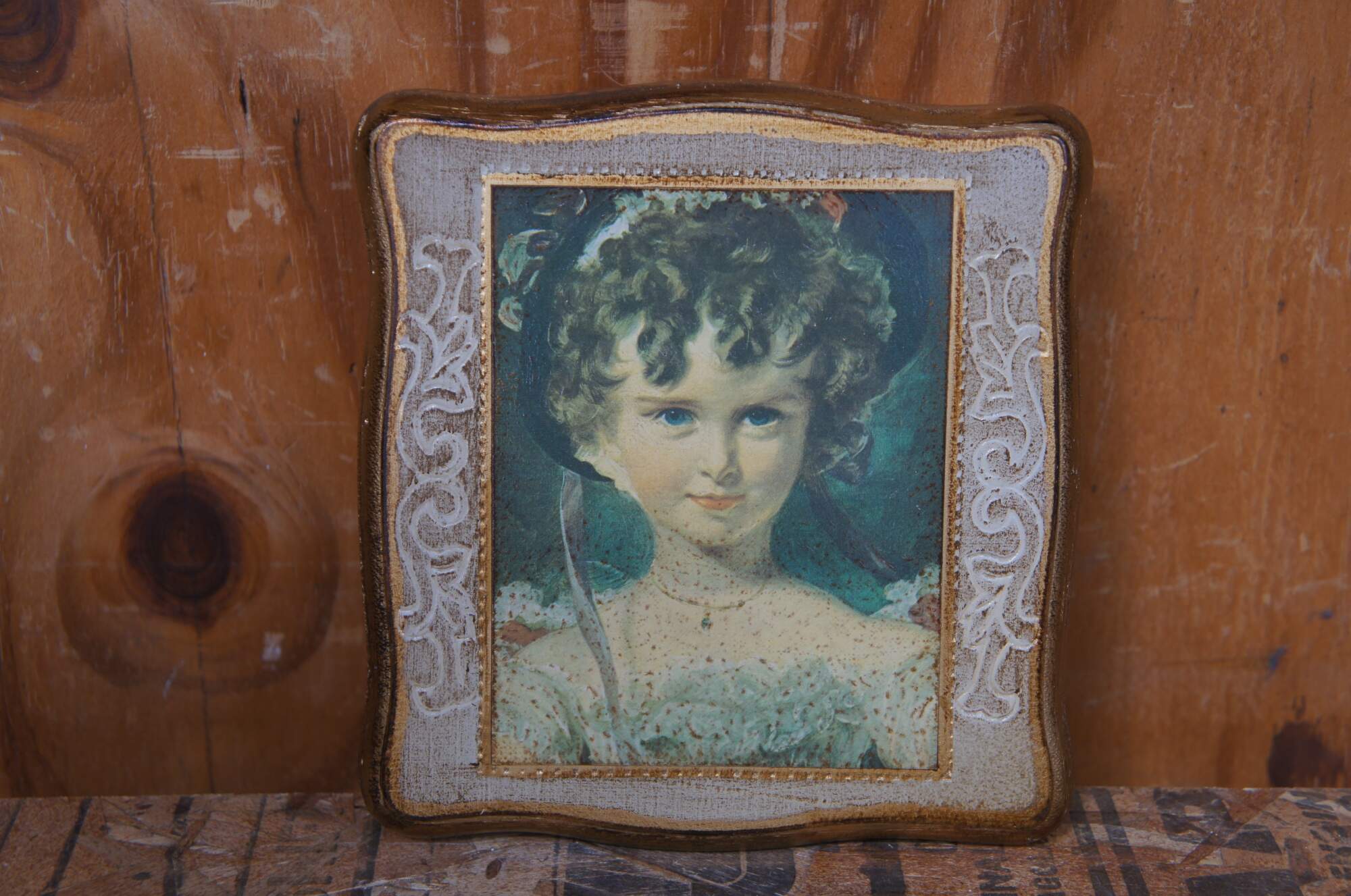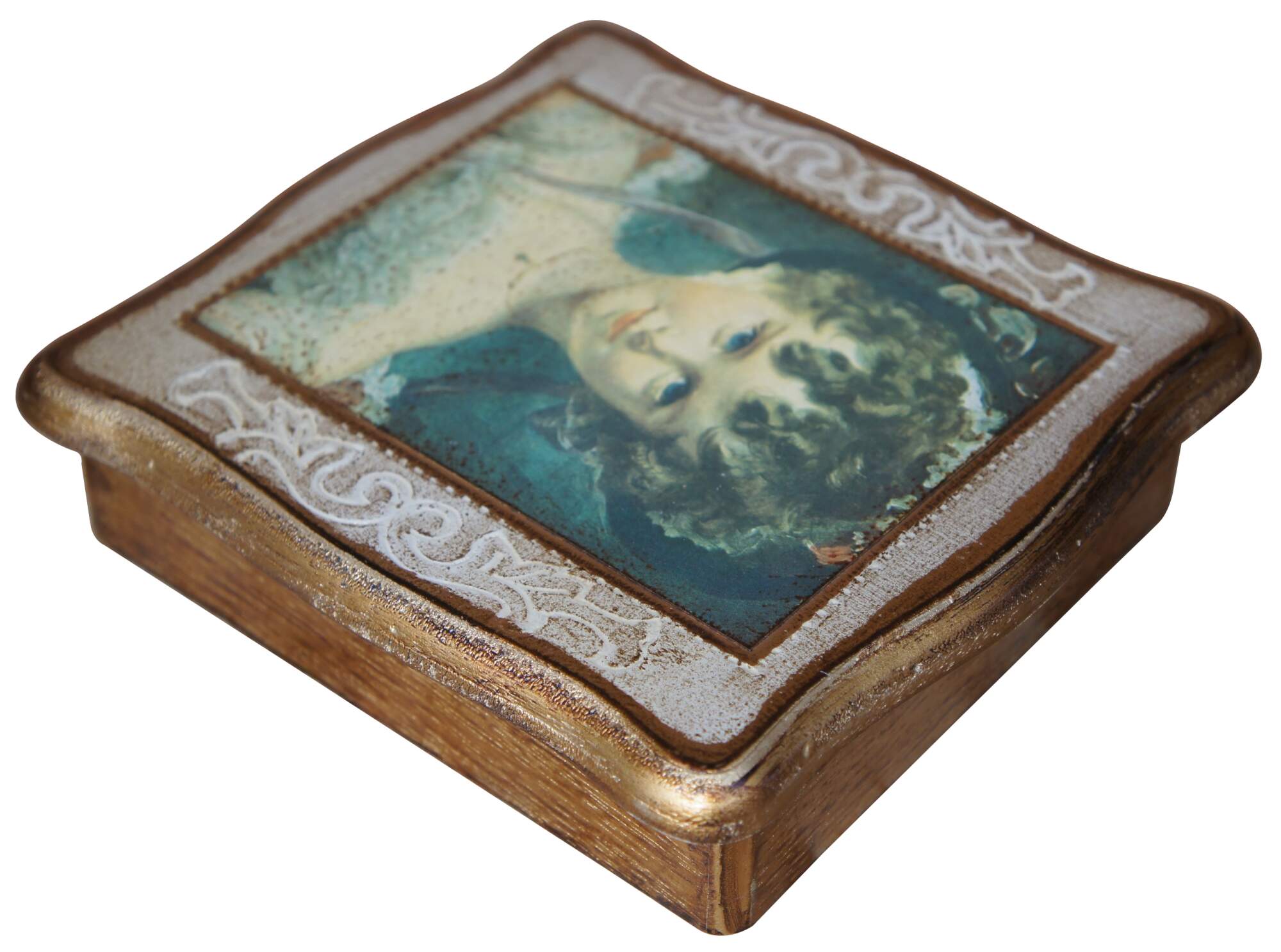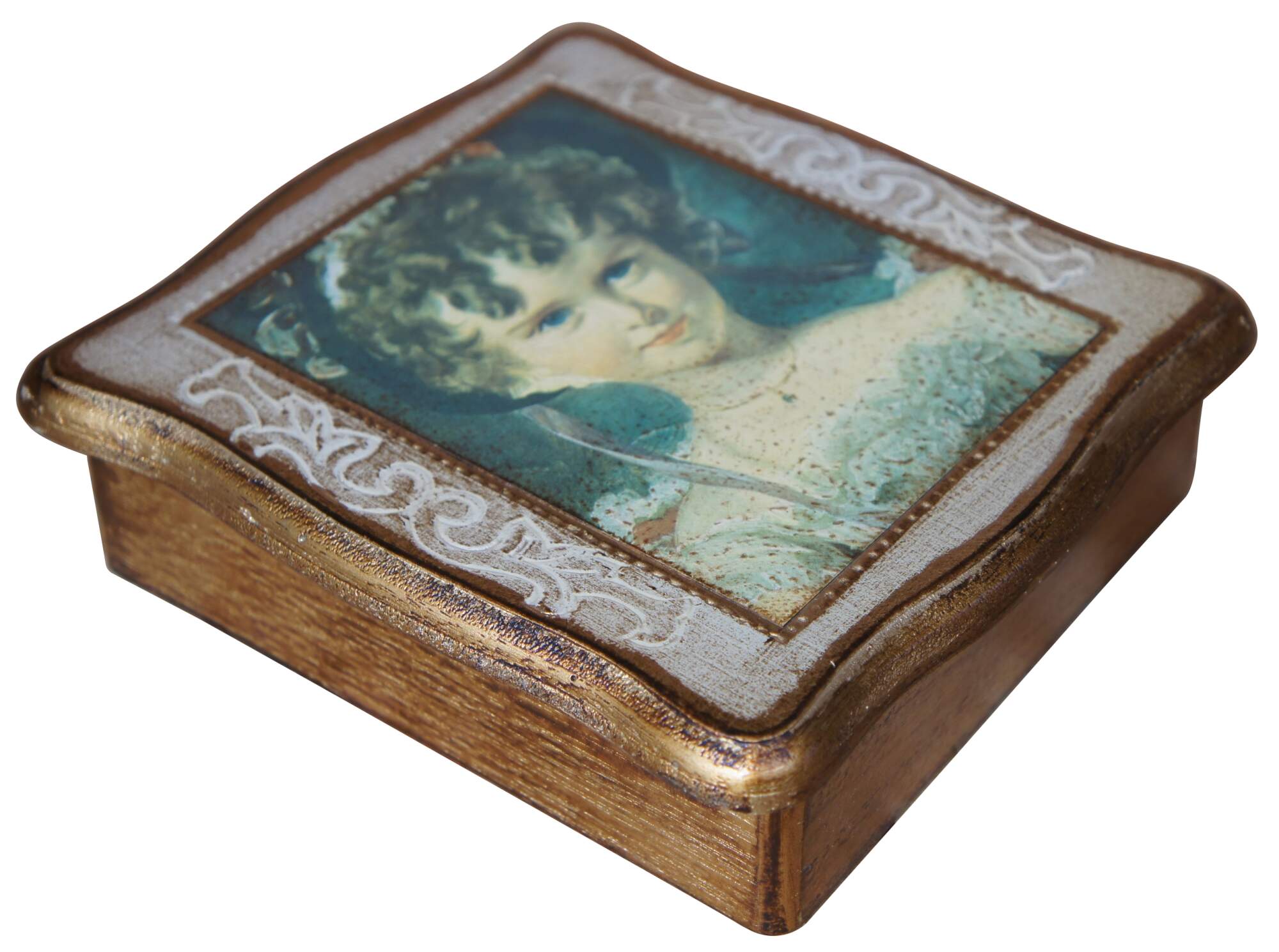 This wooden box features a hinged lid, red velvet lining and lithograph of a young girl in historical dress.