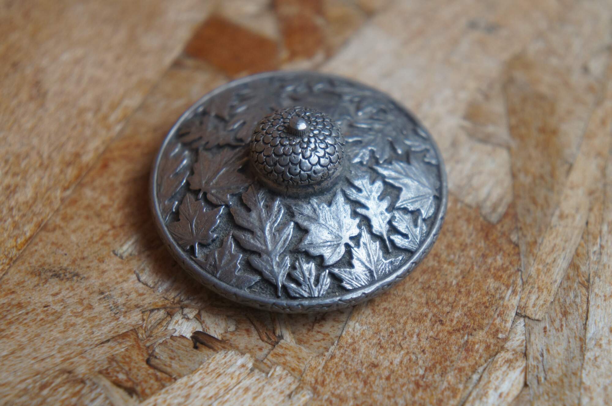 A vintage roll postage stamp dispenser in pewter with maple and oak leaves decorating it. Acorn on removable lid with stamp on bottom.