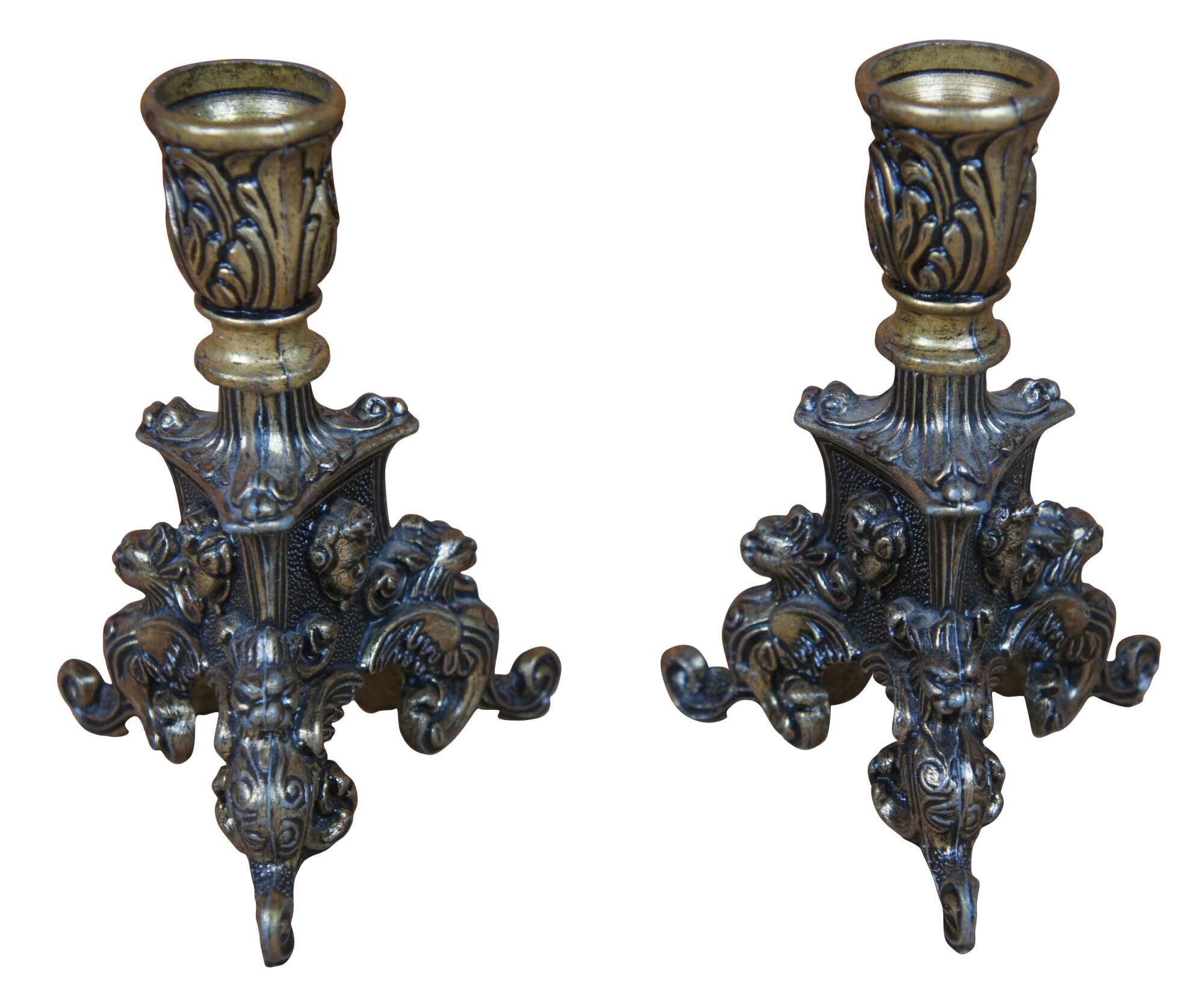 2 vintage ornate mythological candlesticks featuring cherubs and another animal resembling a lion / dragon / griffon / rabbit.