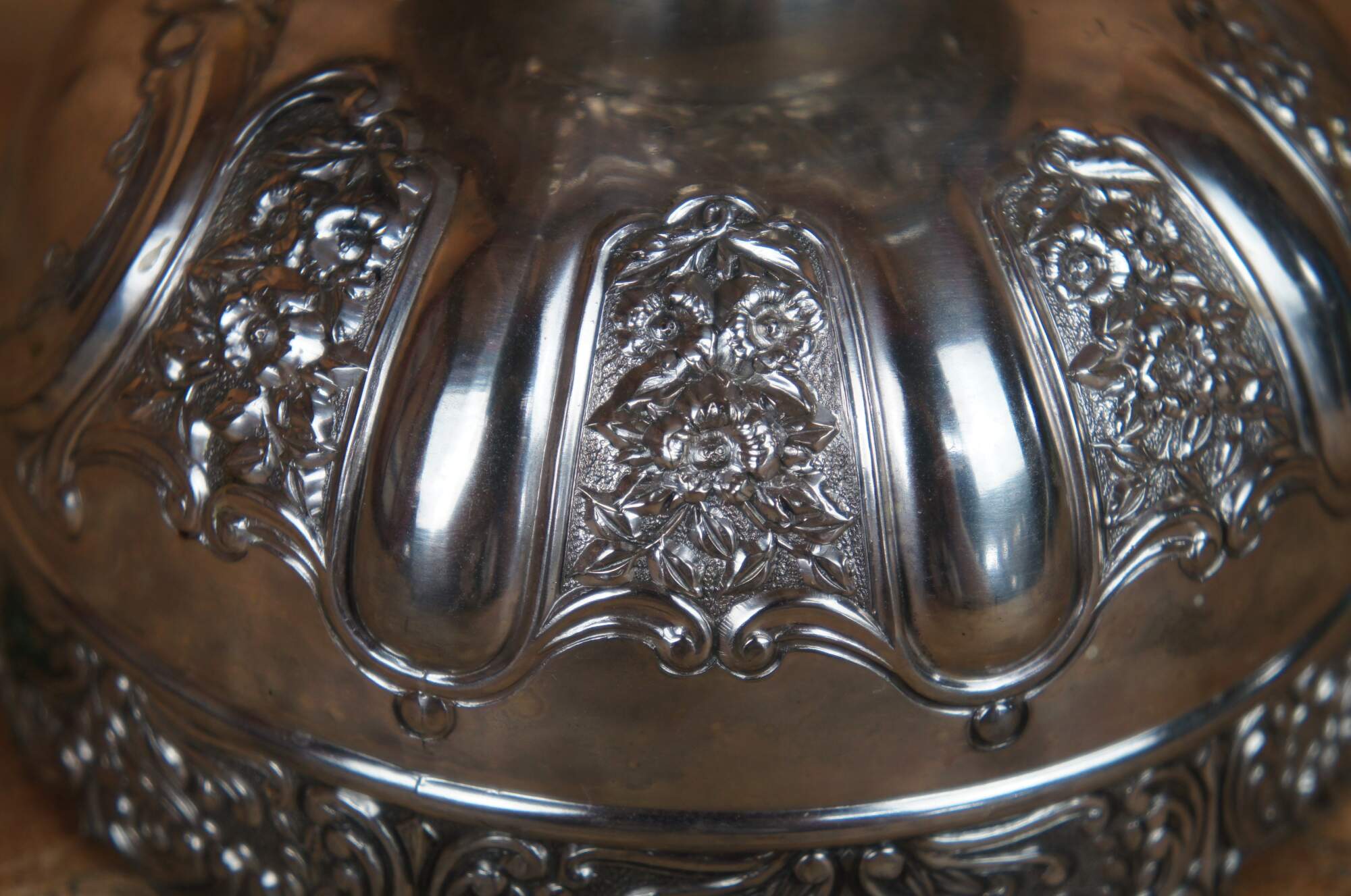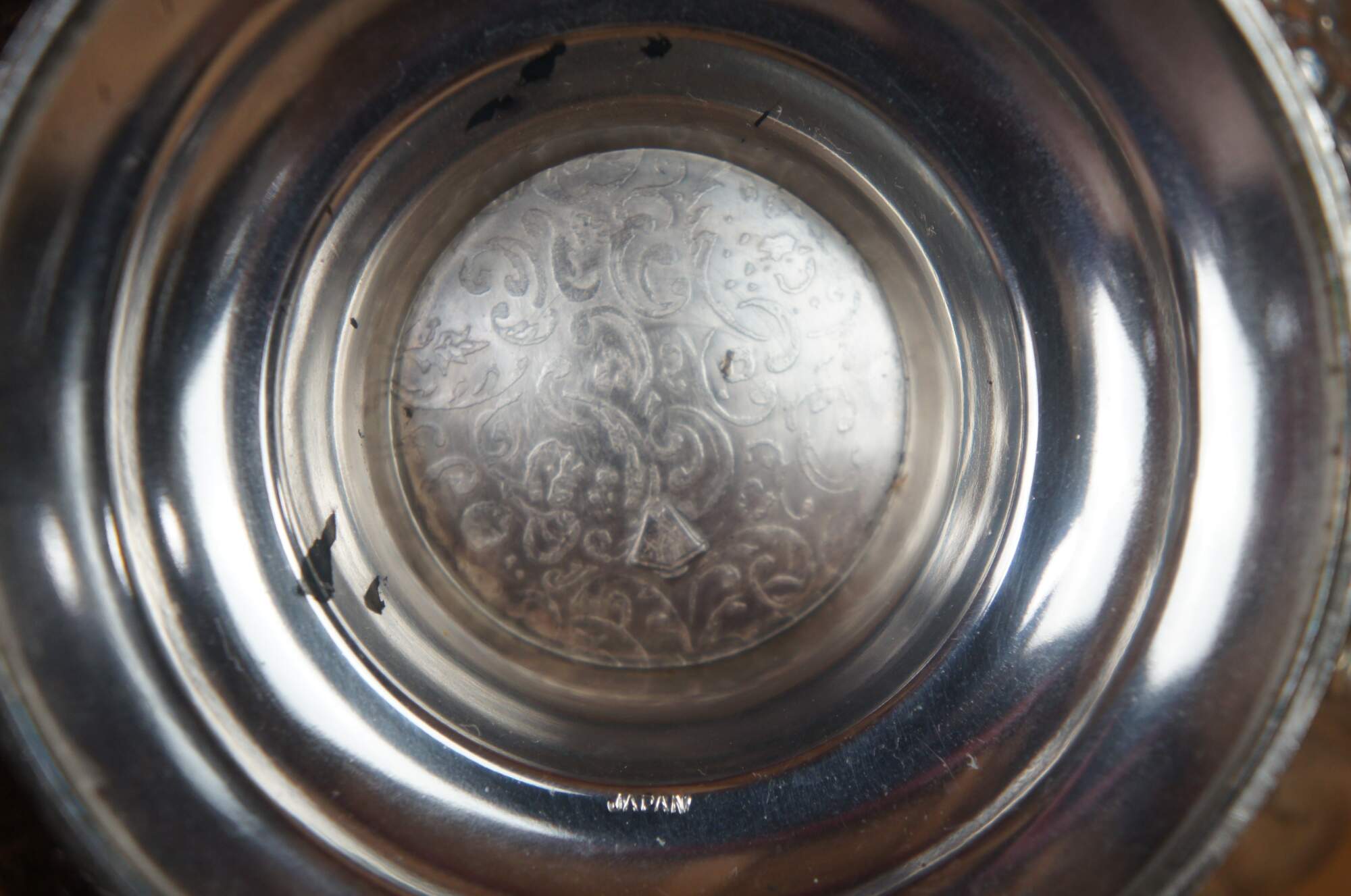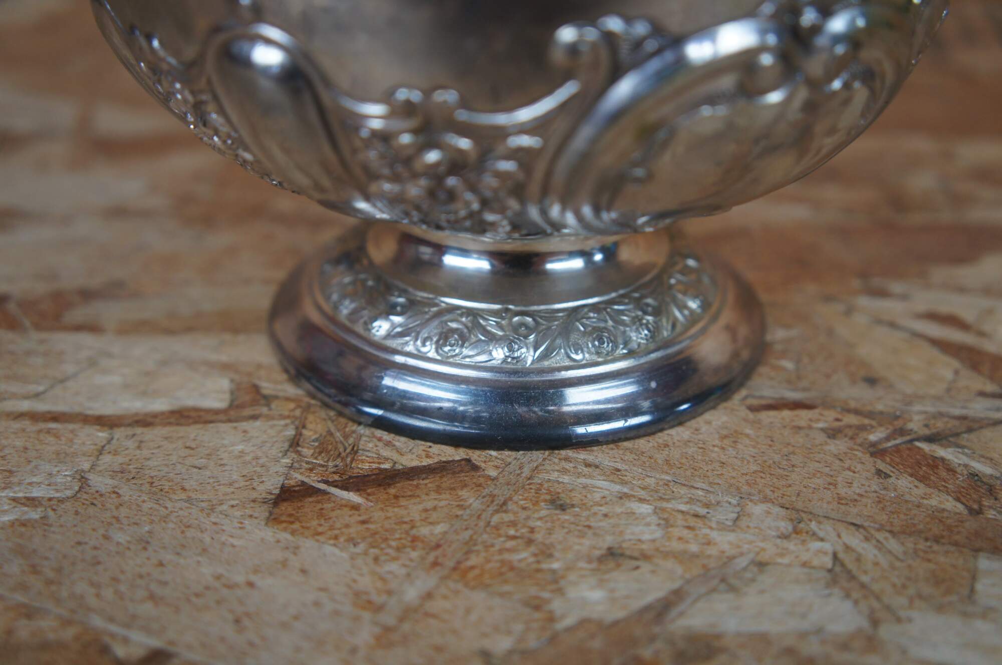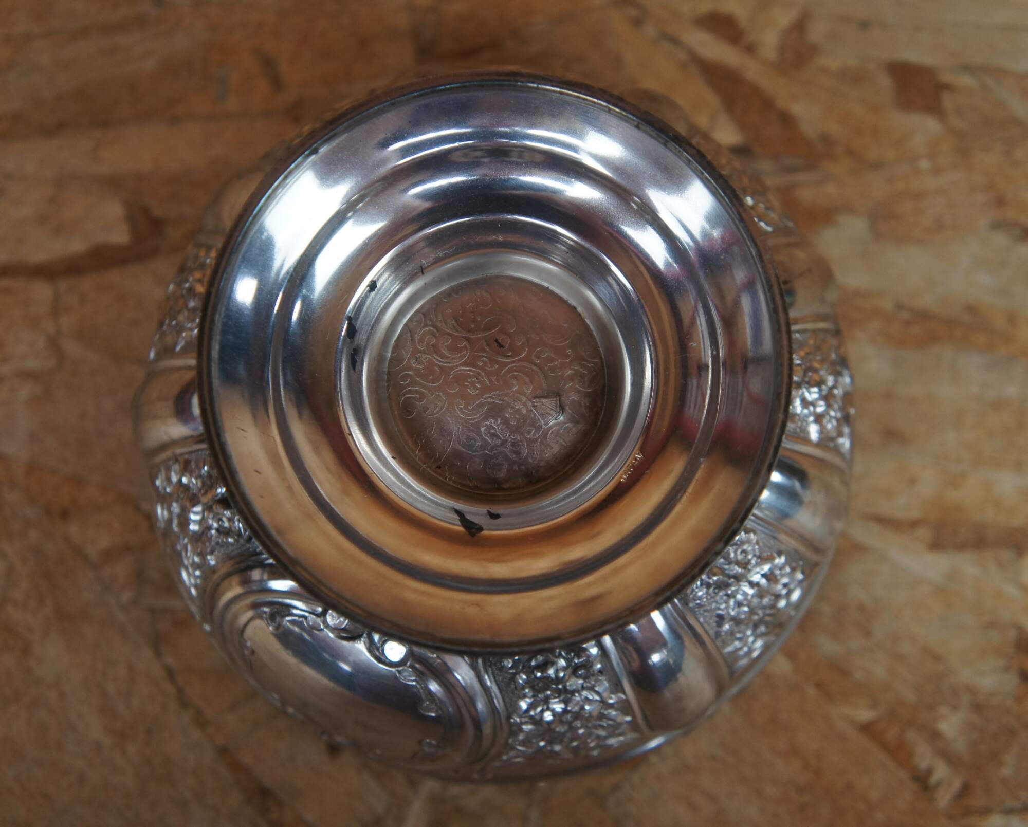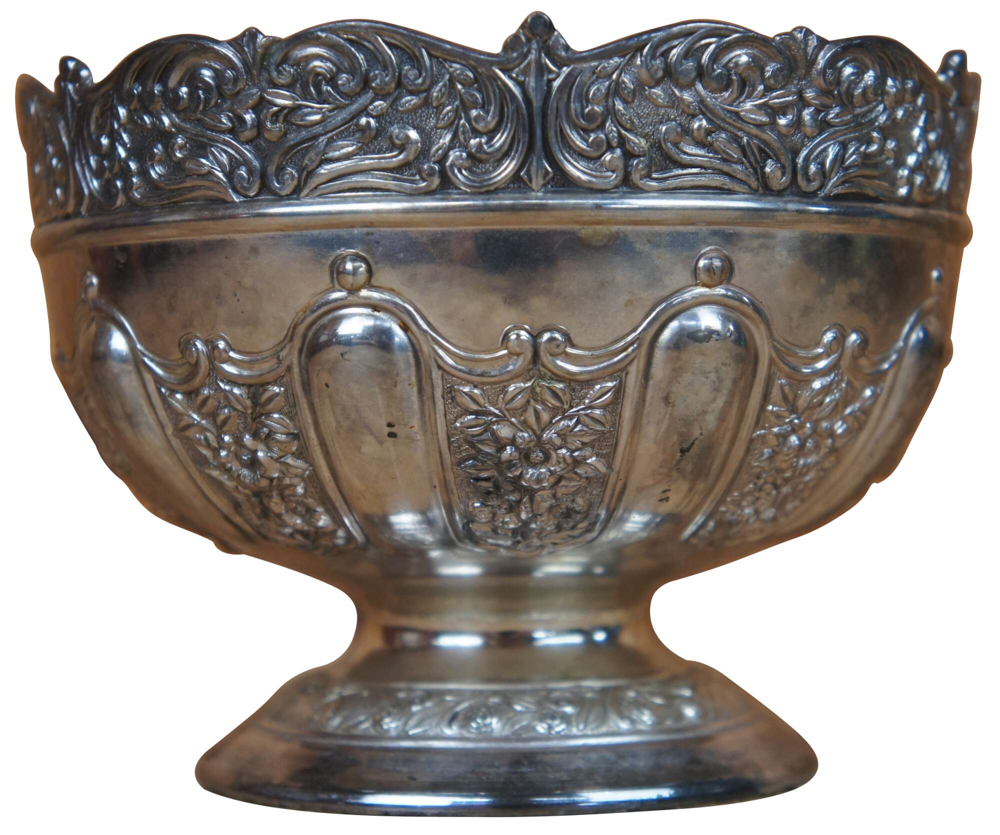 Vintage Japanese Meiji style repousse silver plate round pedestal compote or dish featuring a trophy form with pressed floral designs. Marked Japan.
