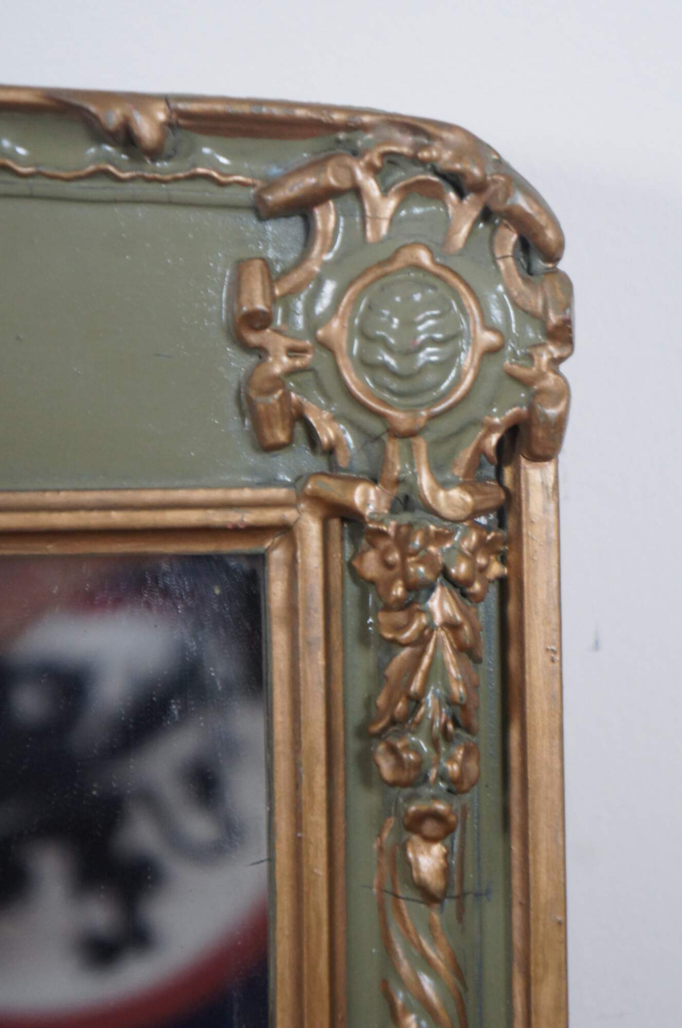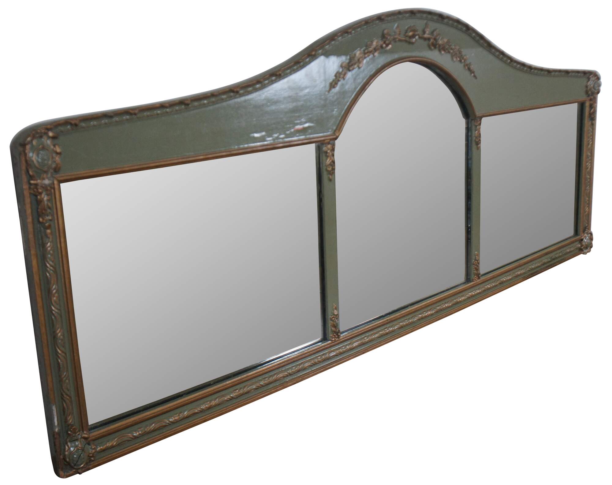 Antique overmantle mirror with three mirror segments framed in a soft olive green lacquer with gold trim and molded floral accents.