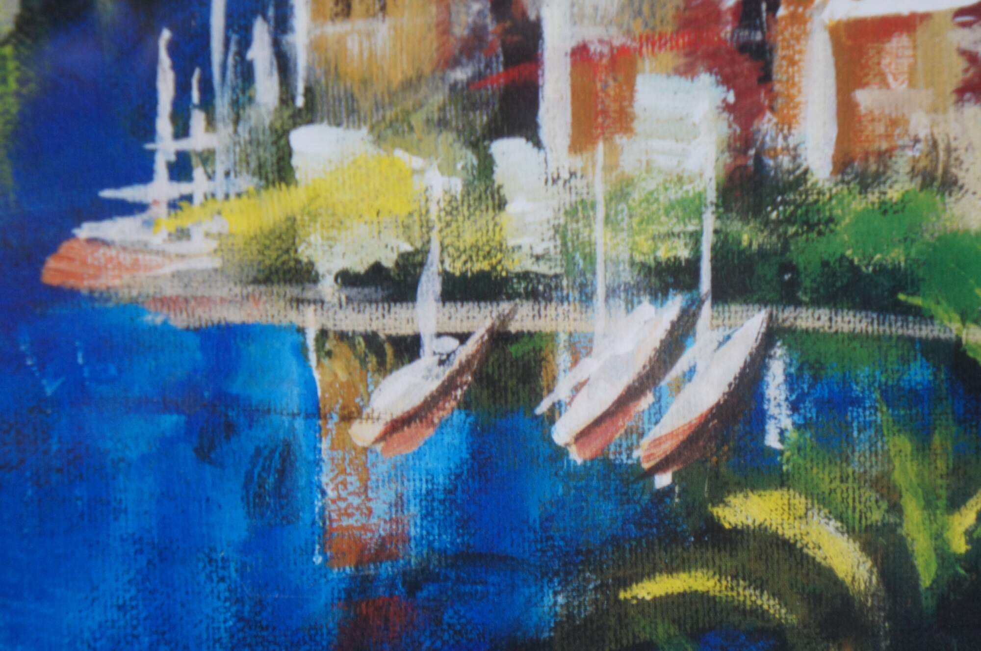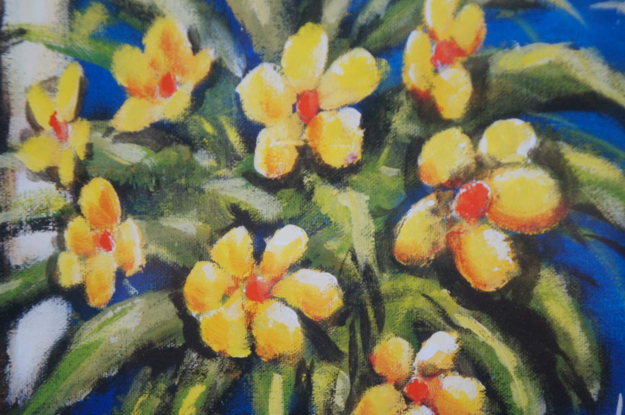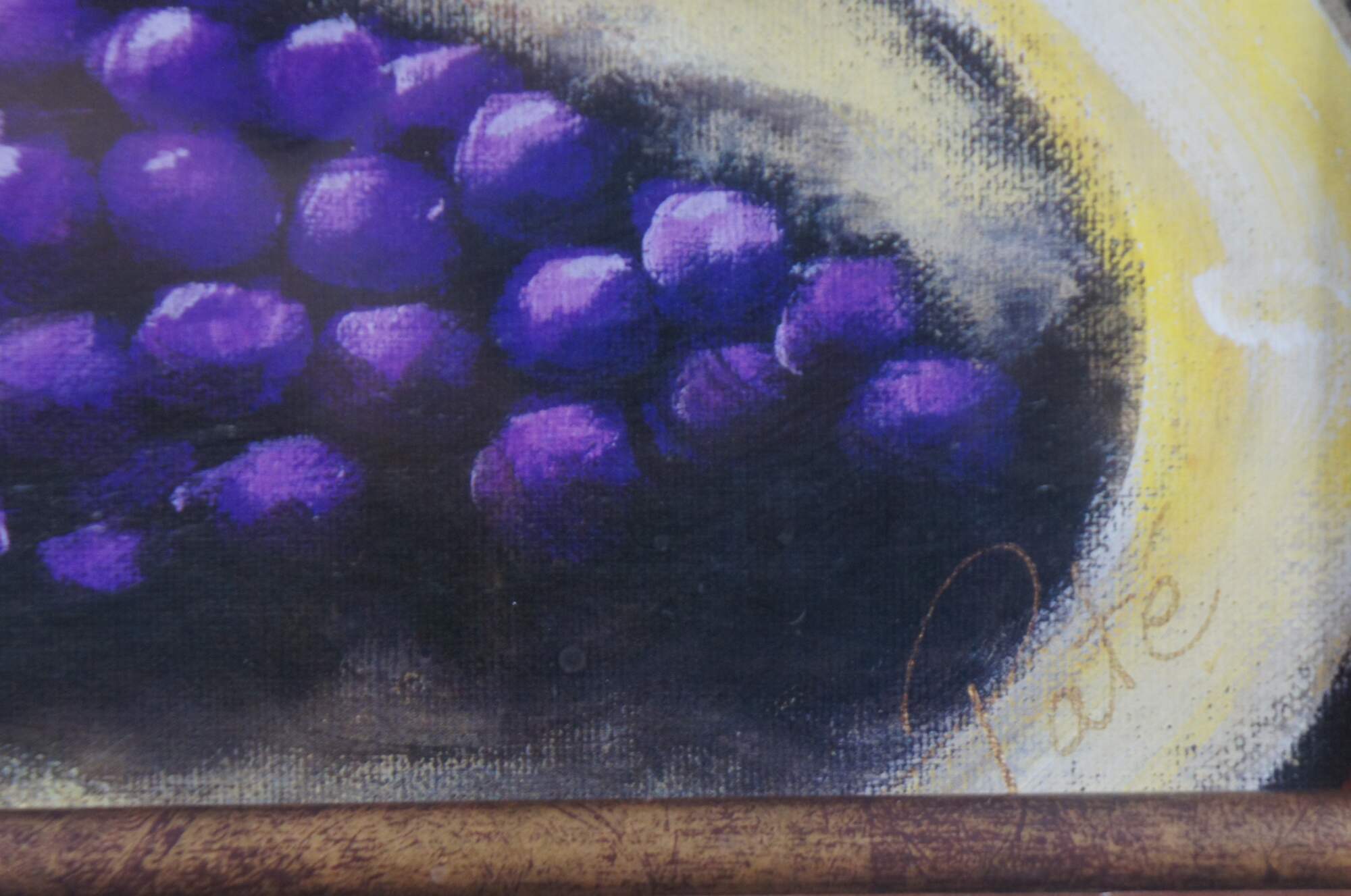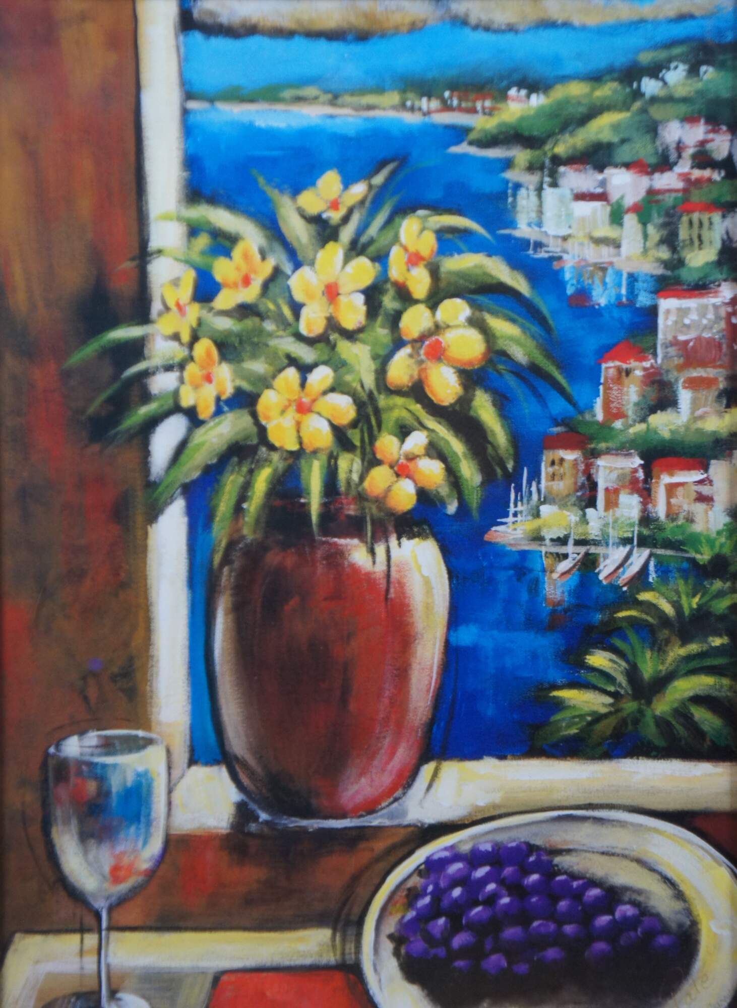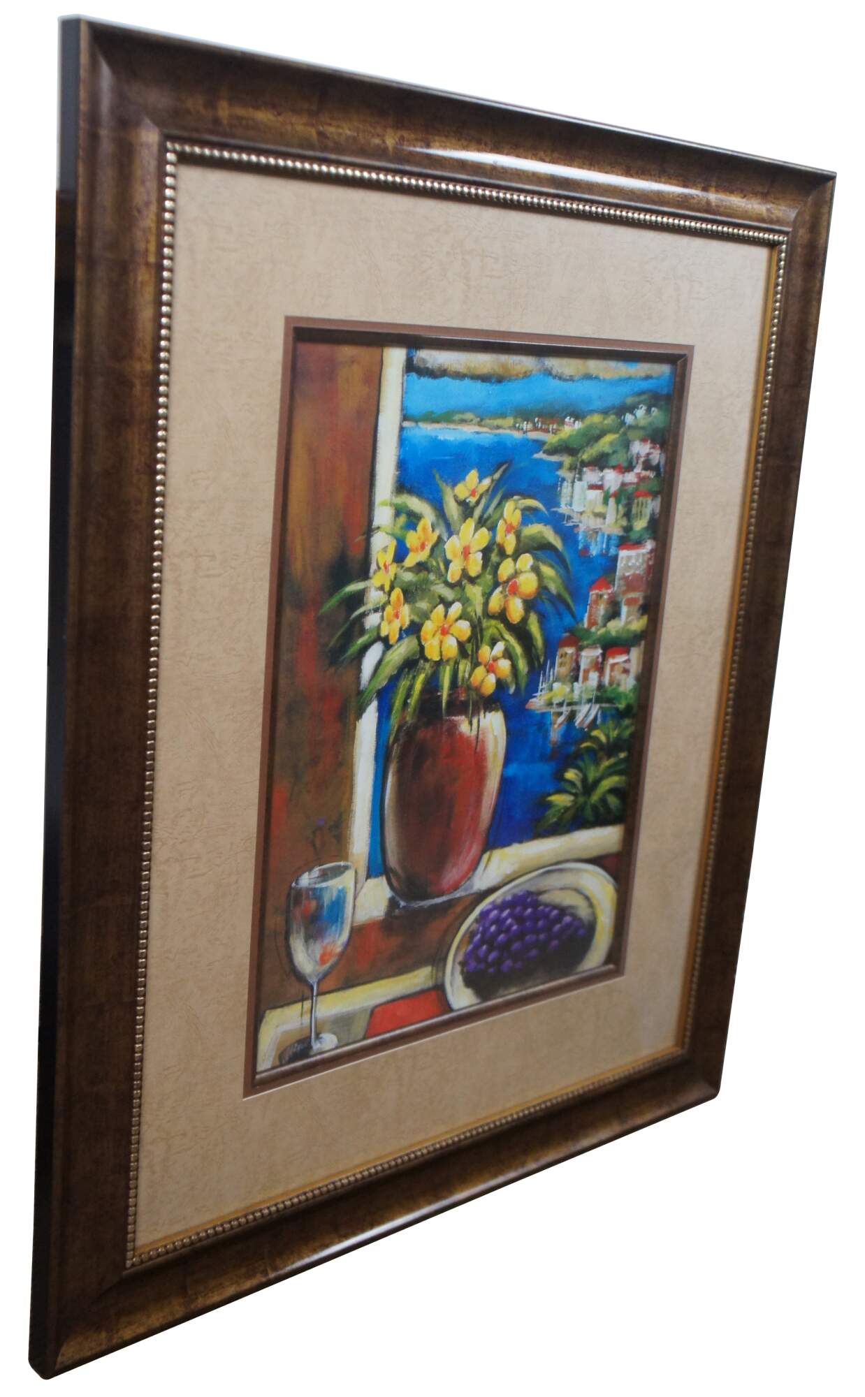 Elegantly framed still life print by Pate showing a plate of grapes and wine glass in front of a vase of yellow flowers in a window showing a coastal landscape.