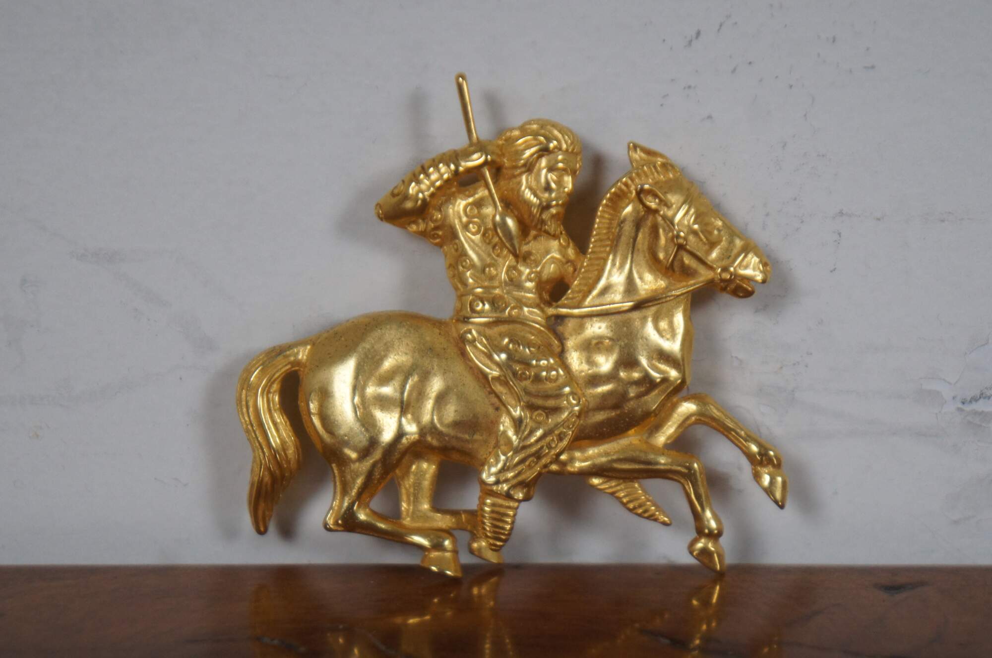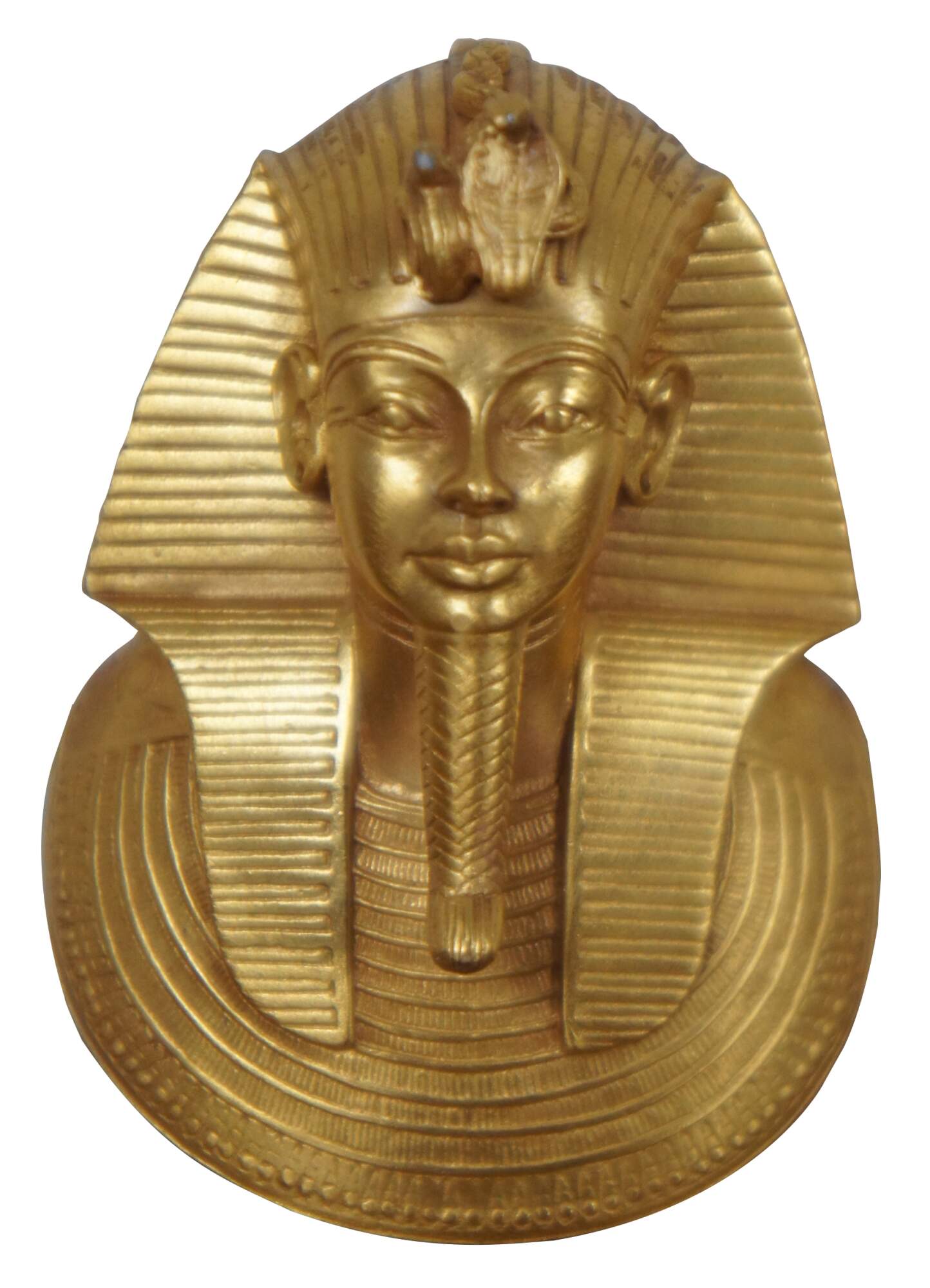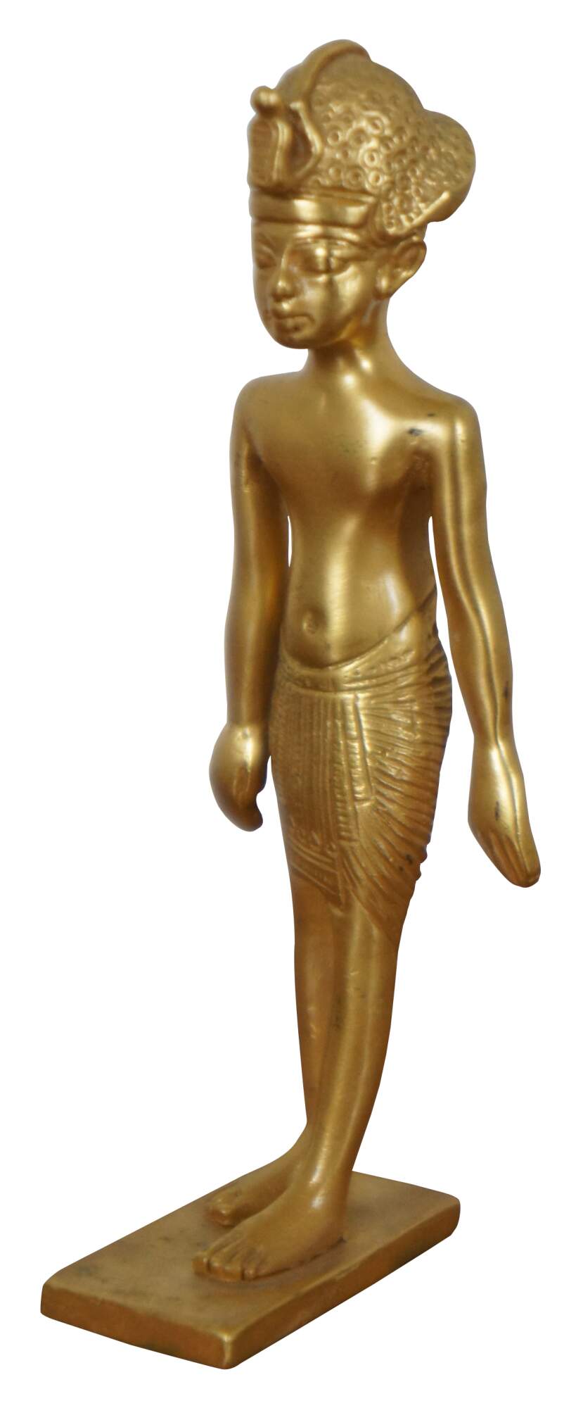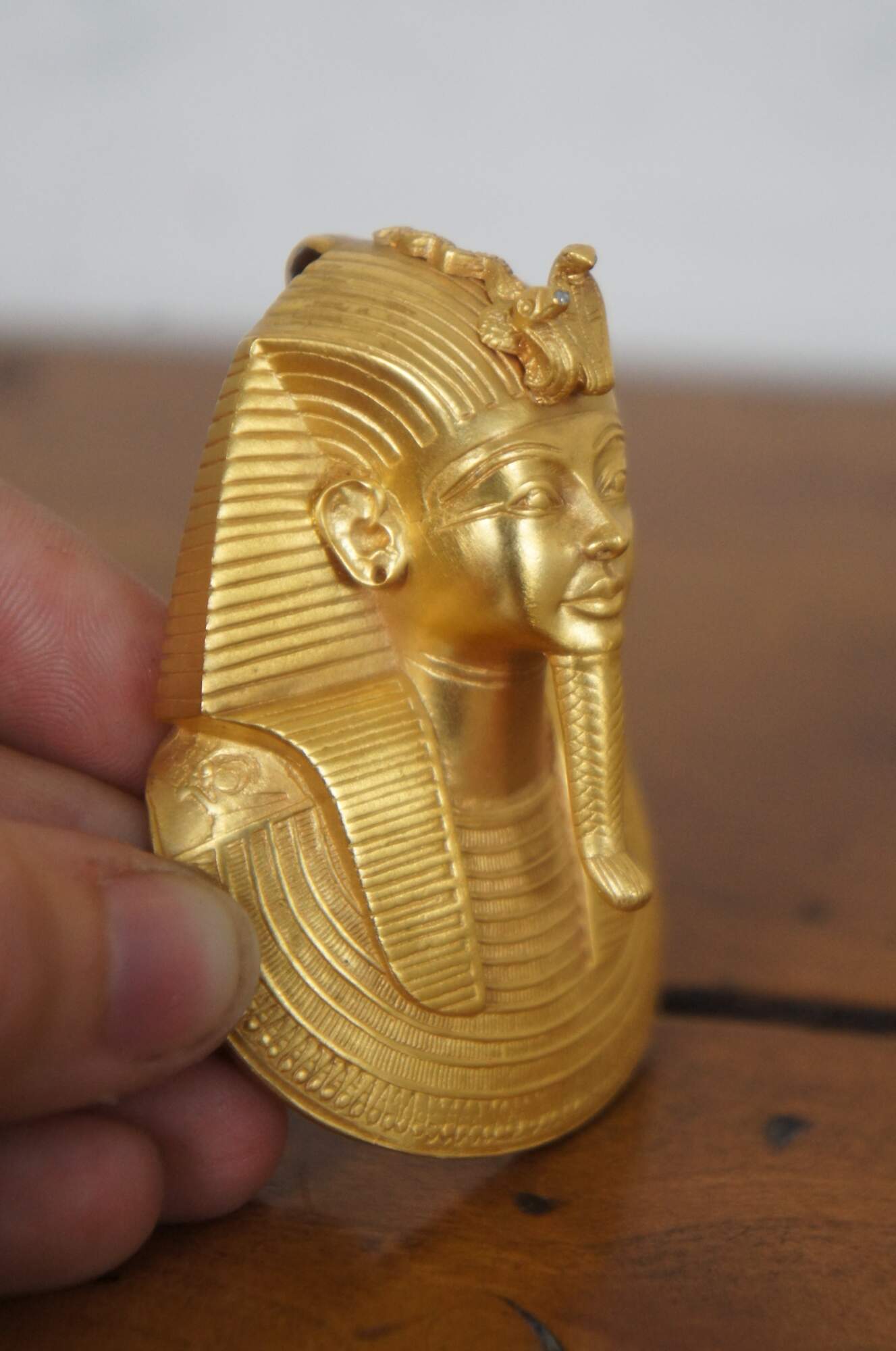 Set of four late 1970s gilt bronze souvenir items from the Metropolitan Museum of Art including Tutankhamun (“King Tut”) figurine, Scythian warrior/horseman brooch, blue enameled crook and flail brooch, and Tutankhamun funerary mask pendant.