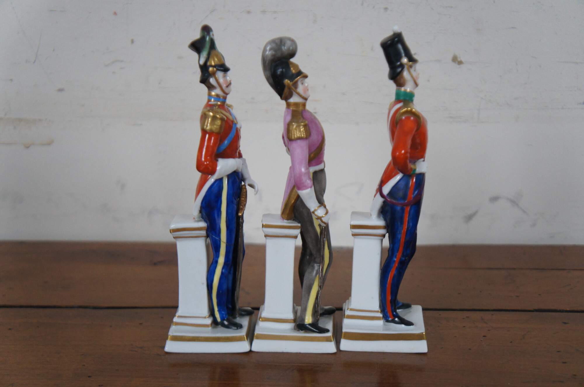 Set of three hand painted German porcelain soldier figurines standing against pillars, likely by A.J. Uffrecht & Company, marked with a gold anchor on the back and “Germany” with a five point crown over an N on the base.