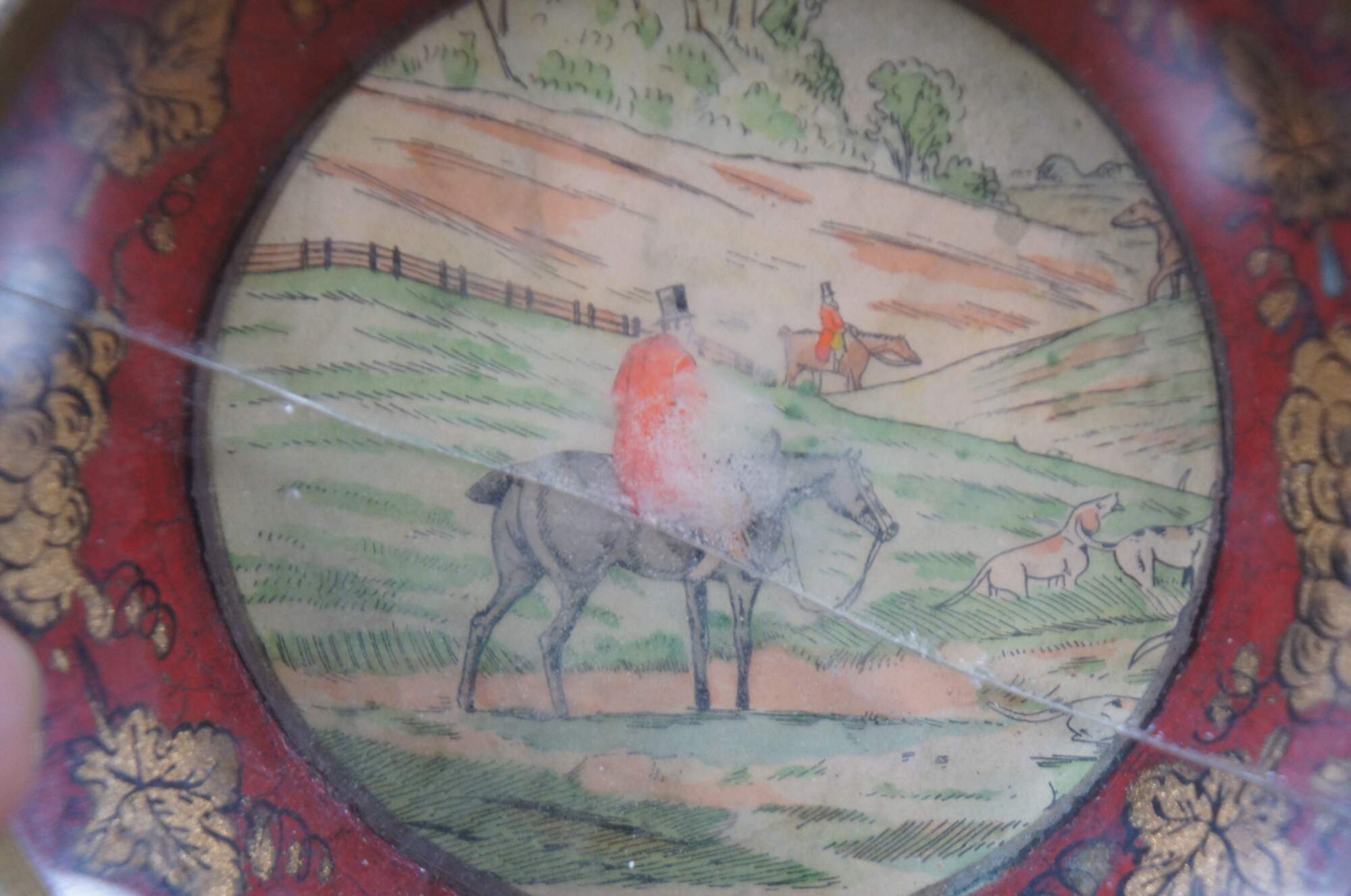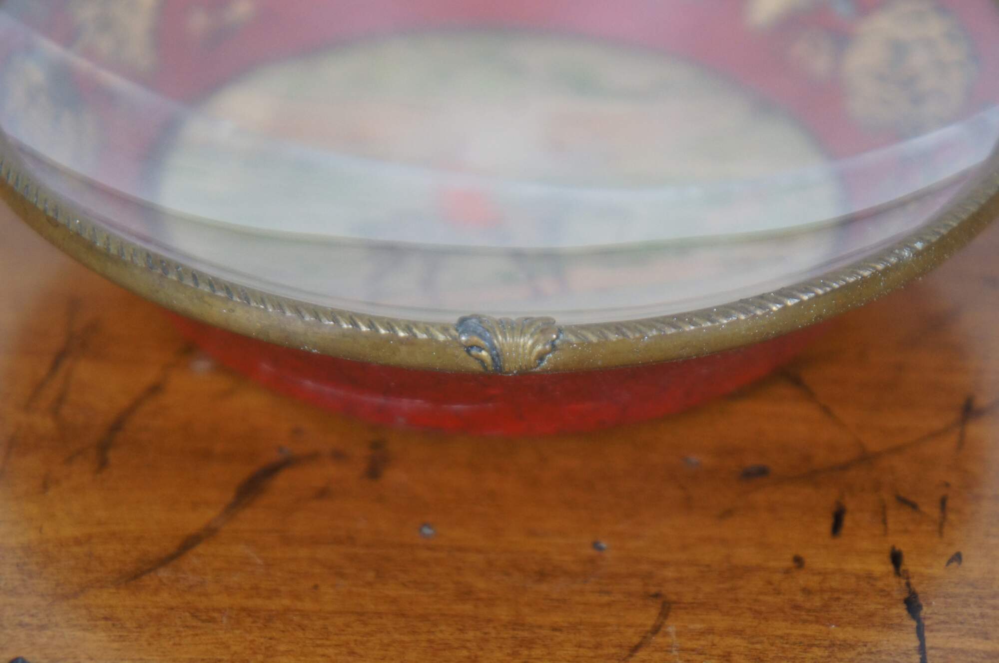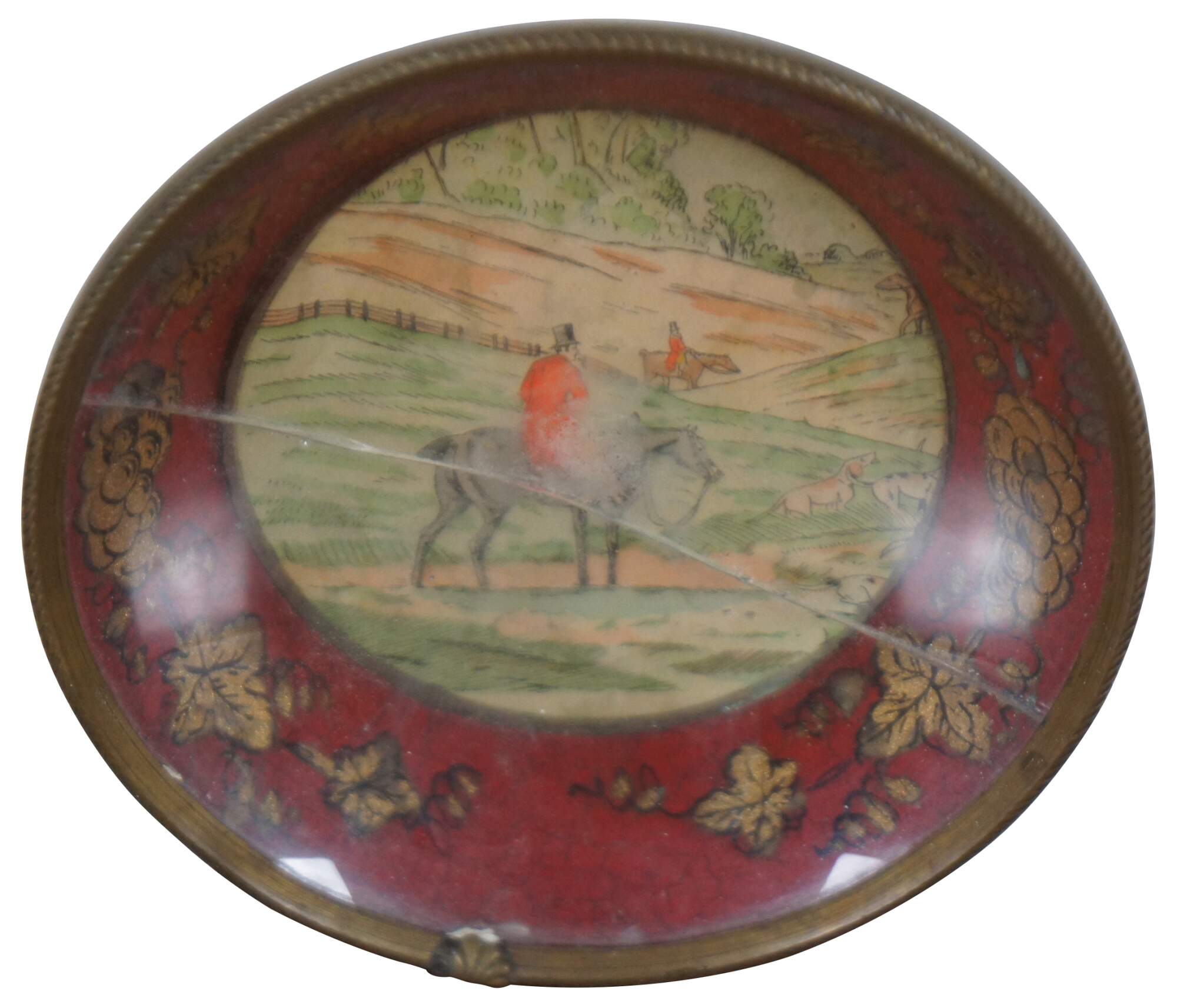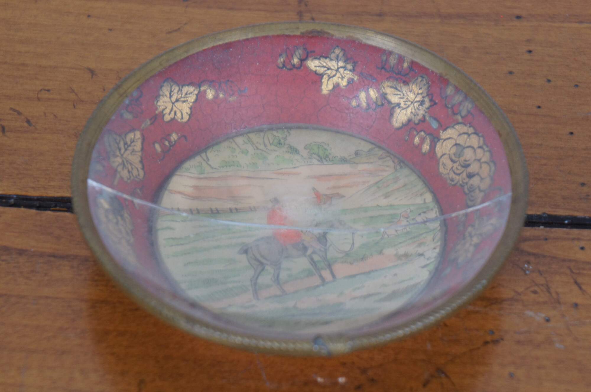 Antique Chinoiserie red and gold floral painted metal dish with a fox hunt scene in the center, with brass edge and glass cover.