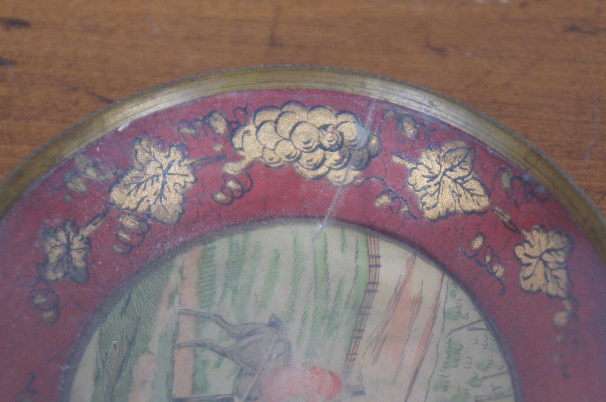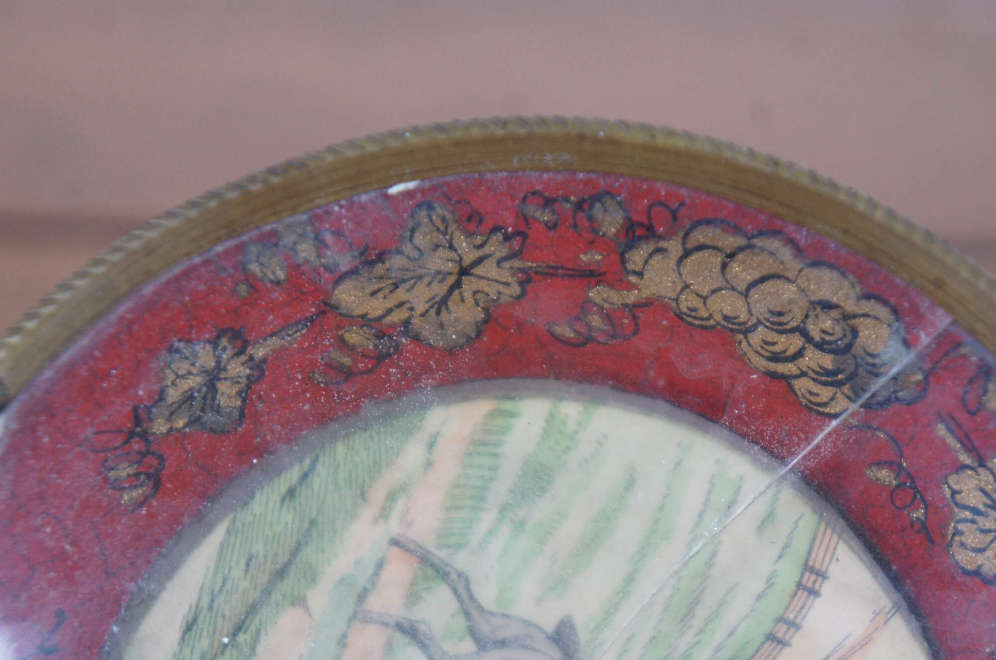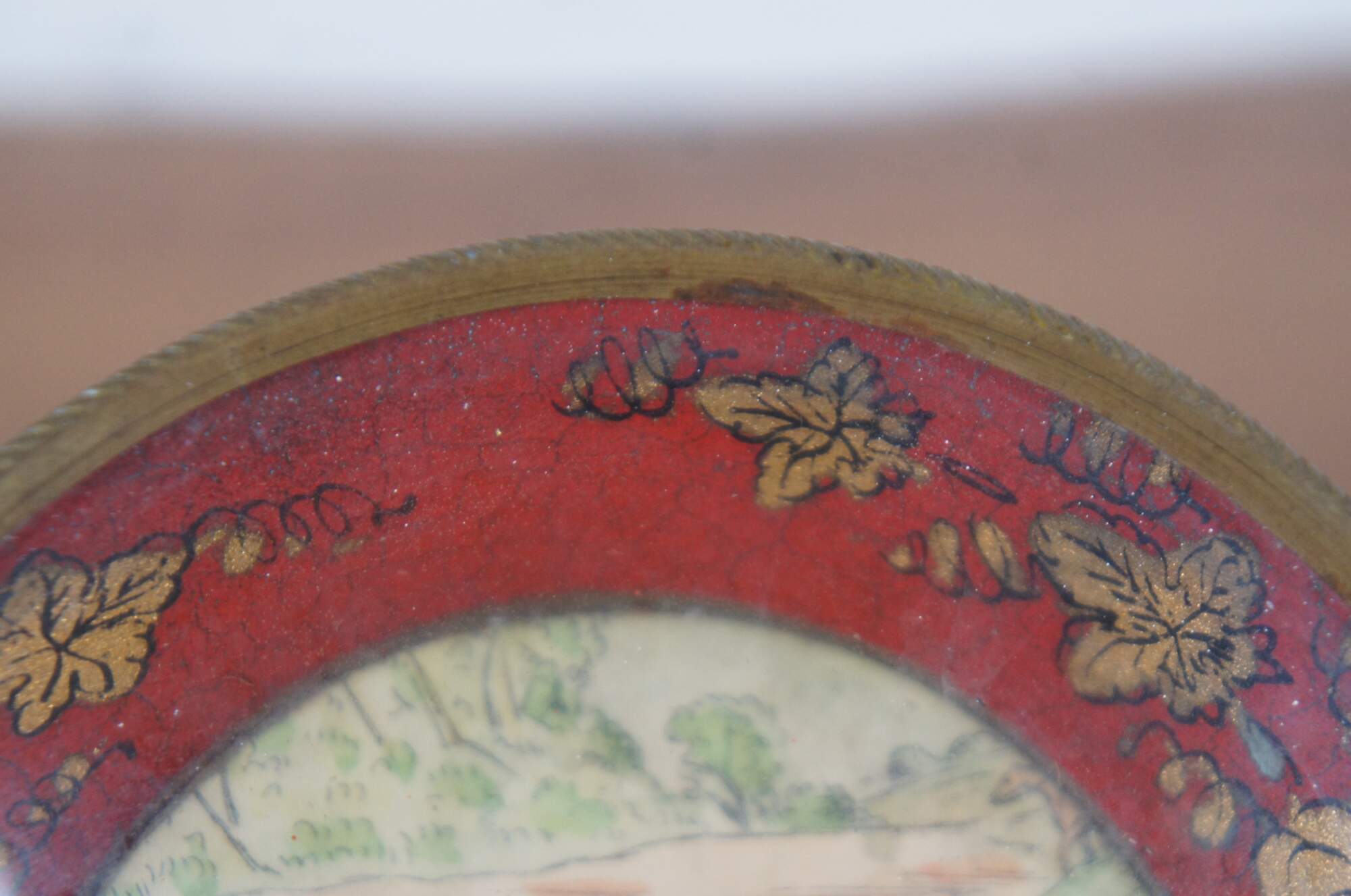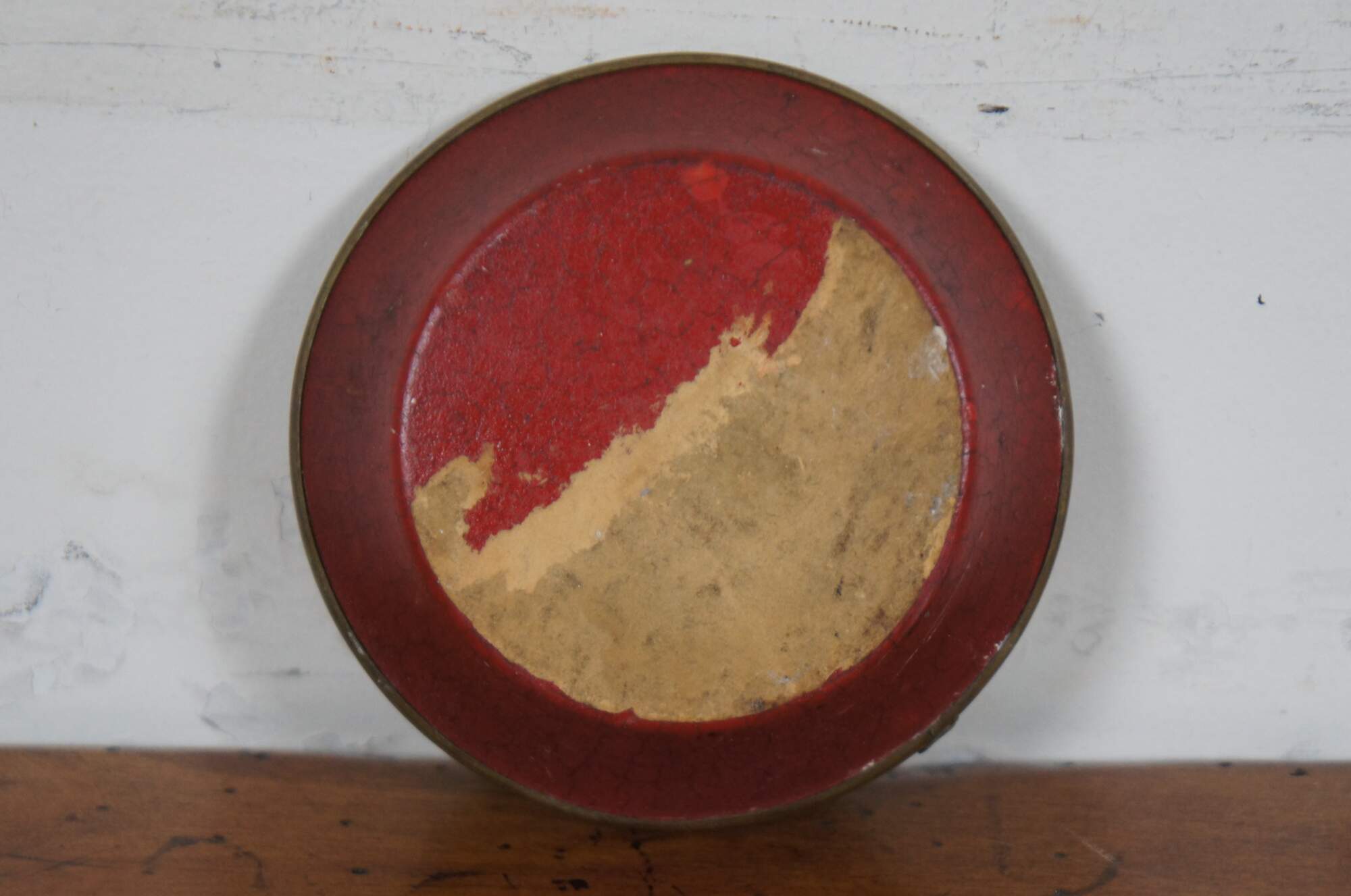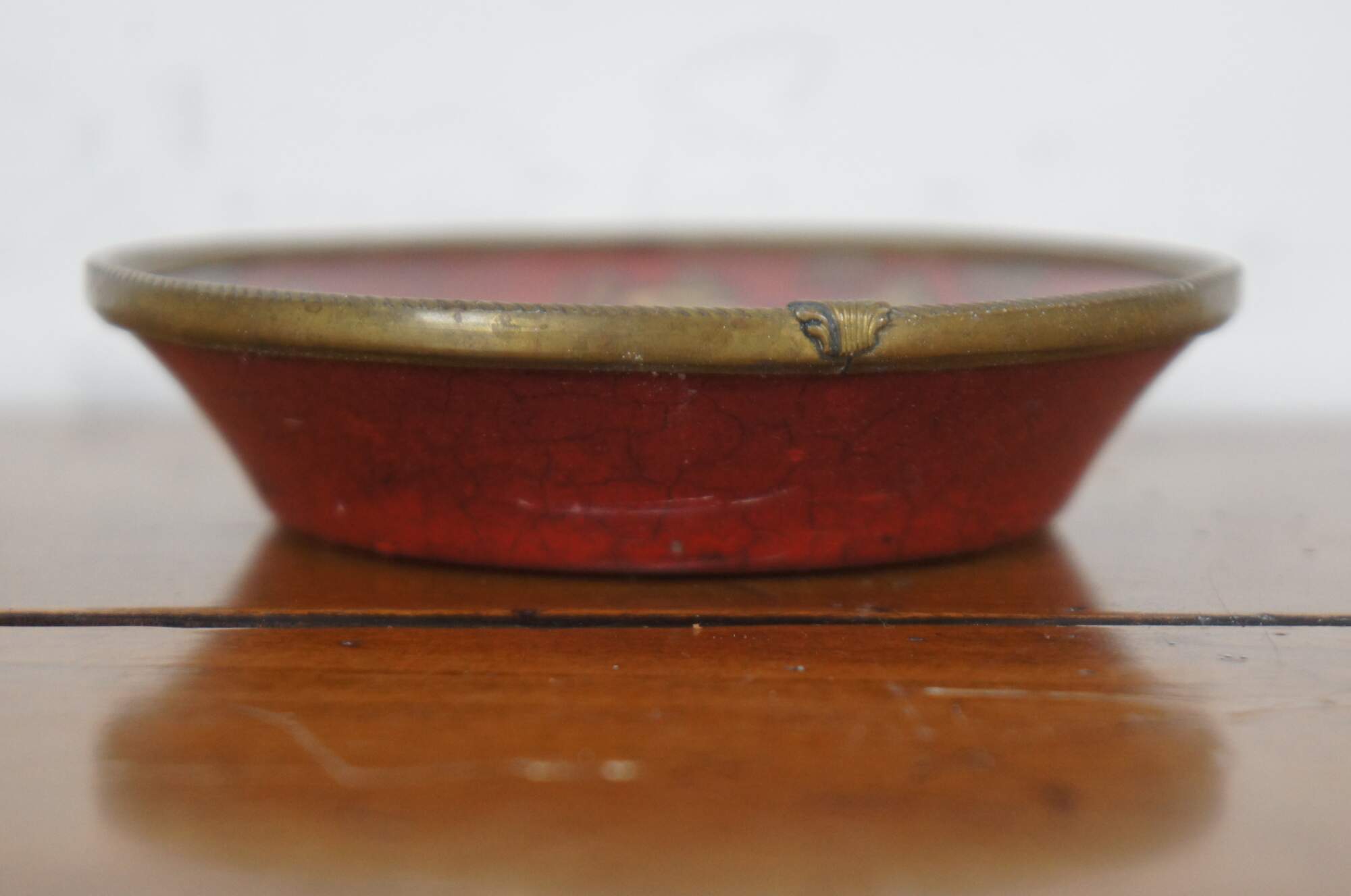 Antique Chinoiserie red and gold floral painted metal dish with a fox hunt scene in the center, with brass edge and glass cover.