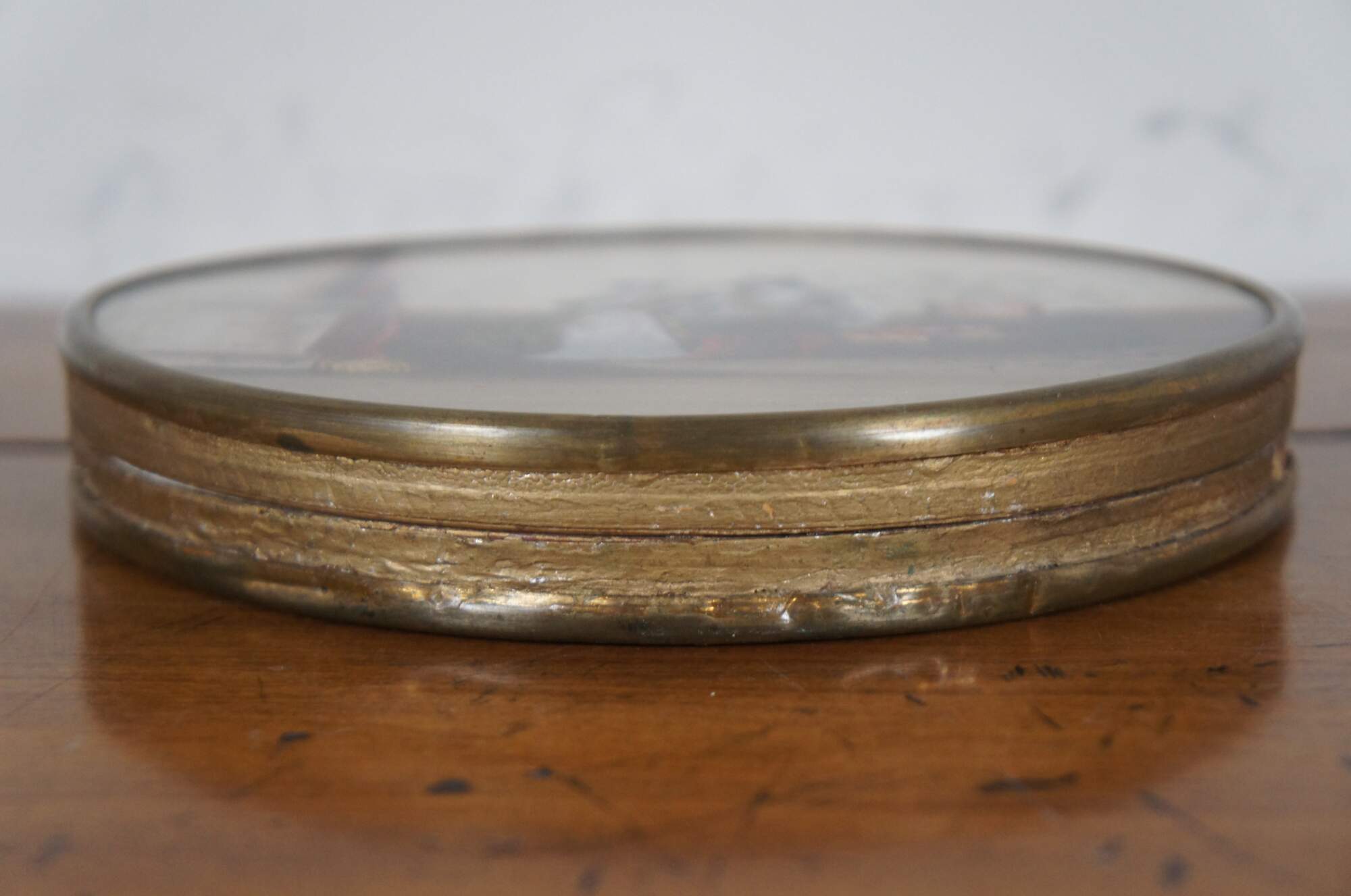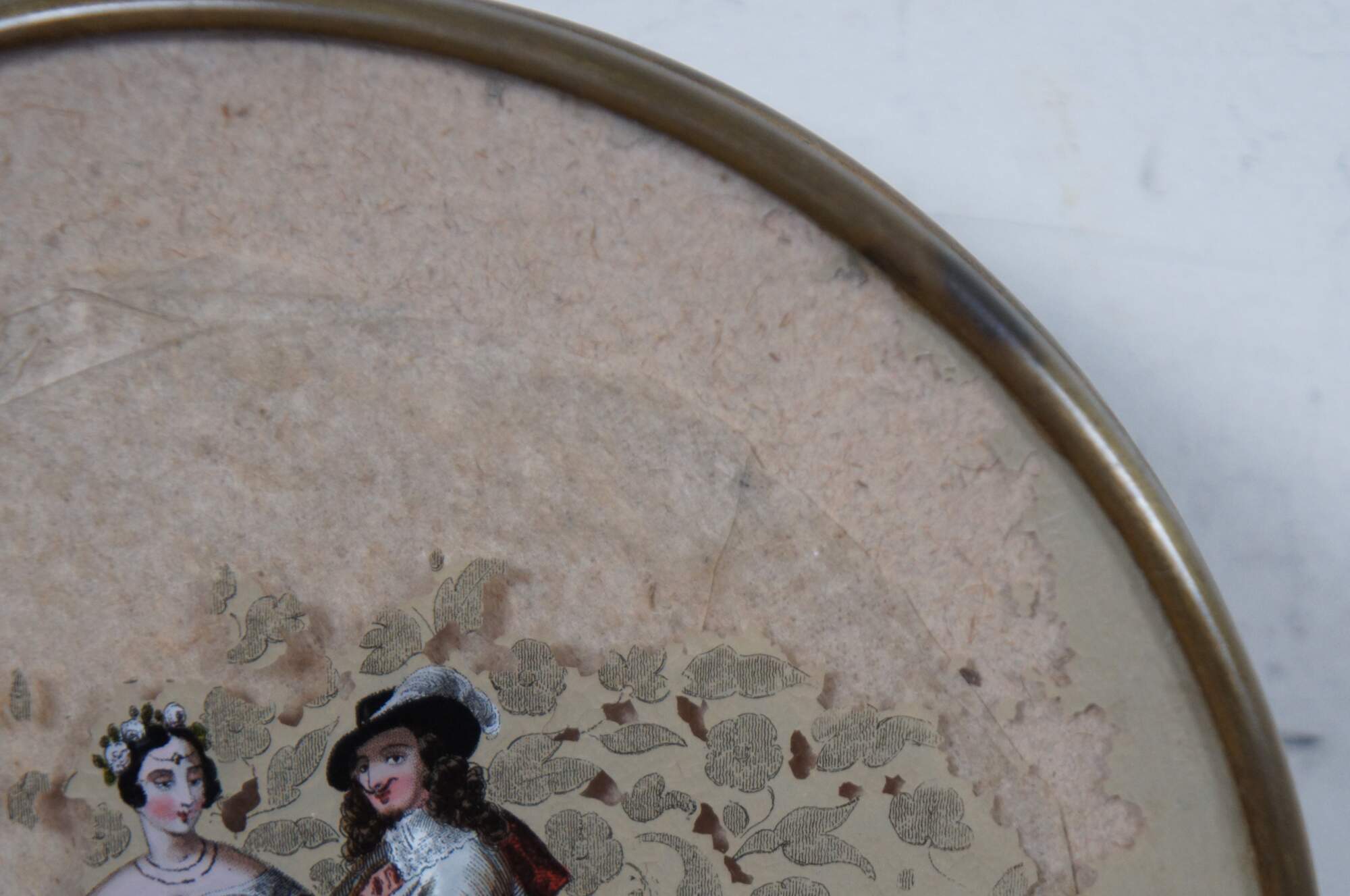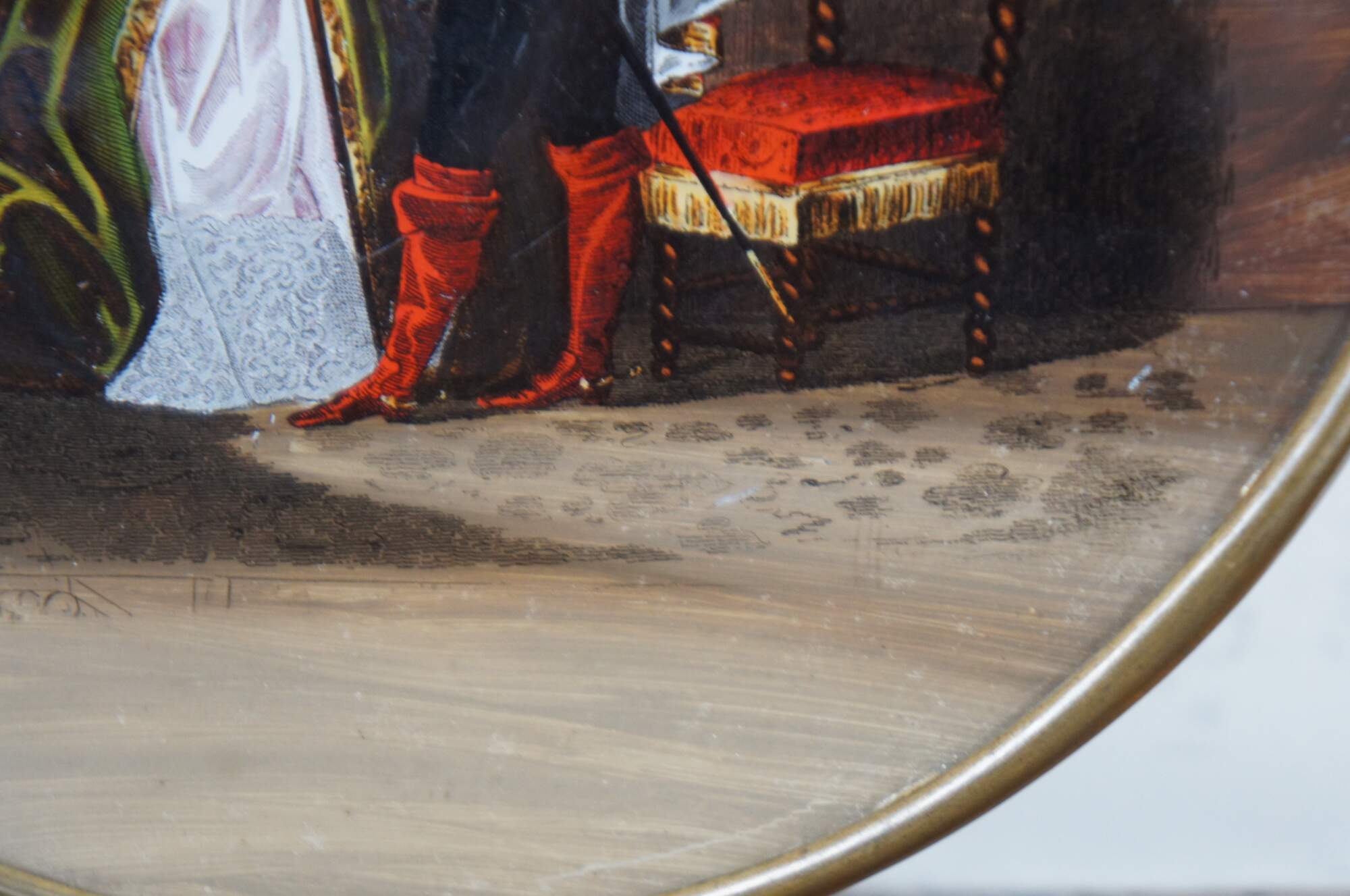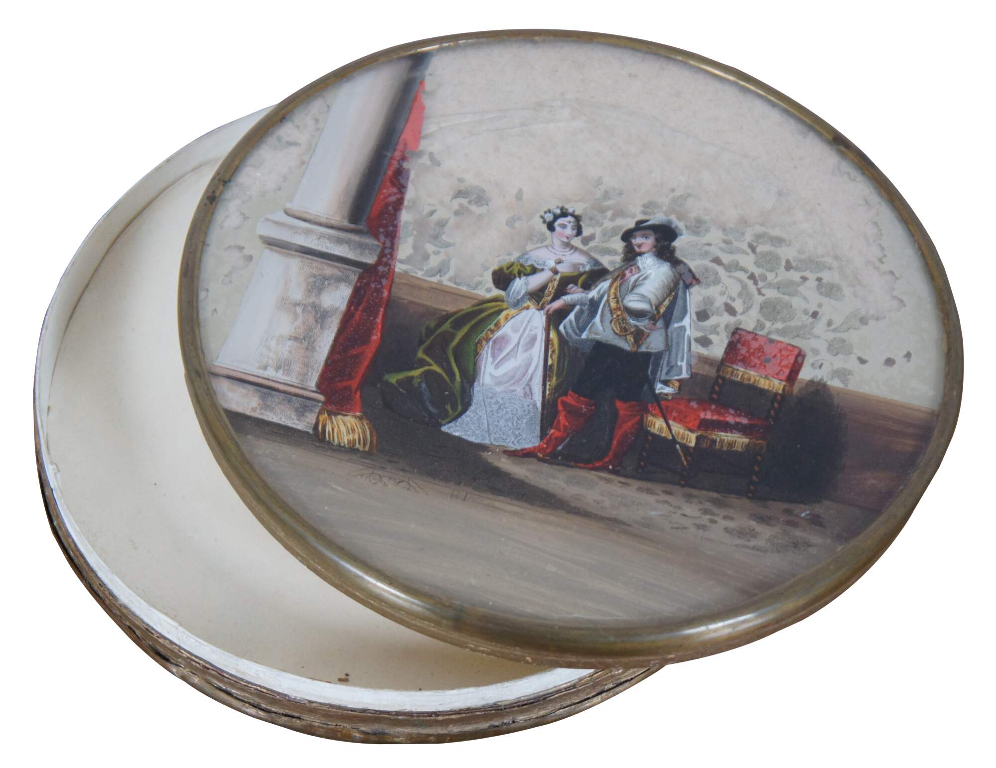 Antique 19th century French reverse painted, eglomise candy box featuring an image of a Musketteer and a well dressed lady on a balcony.