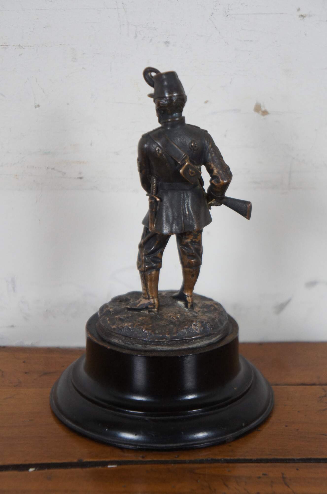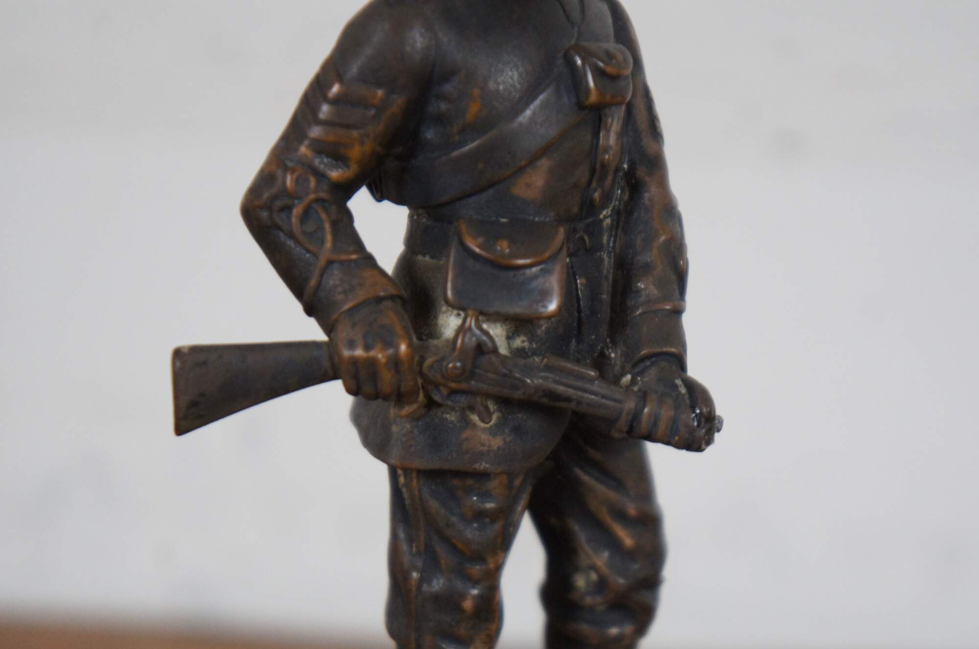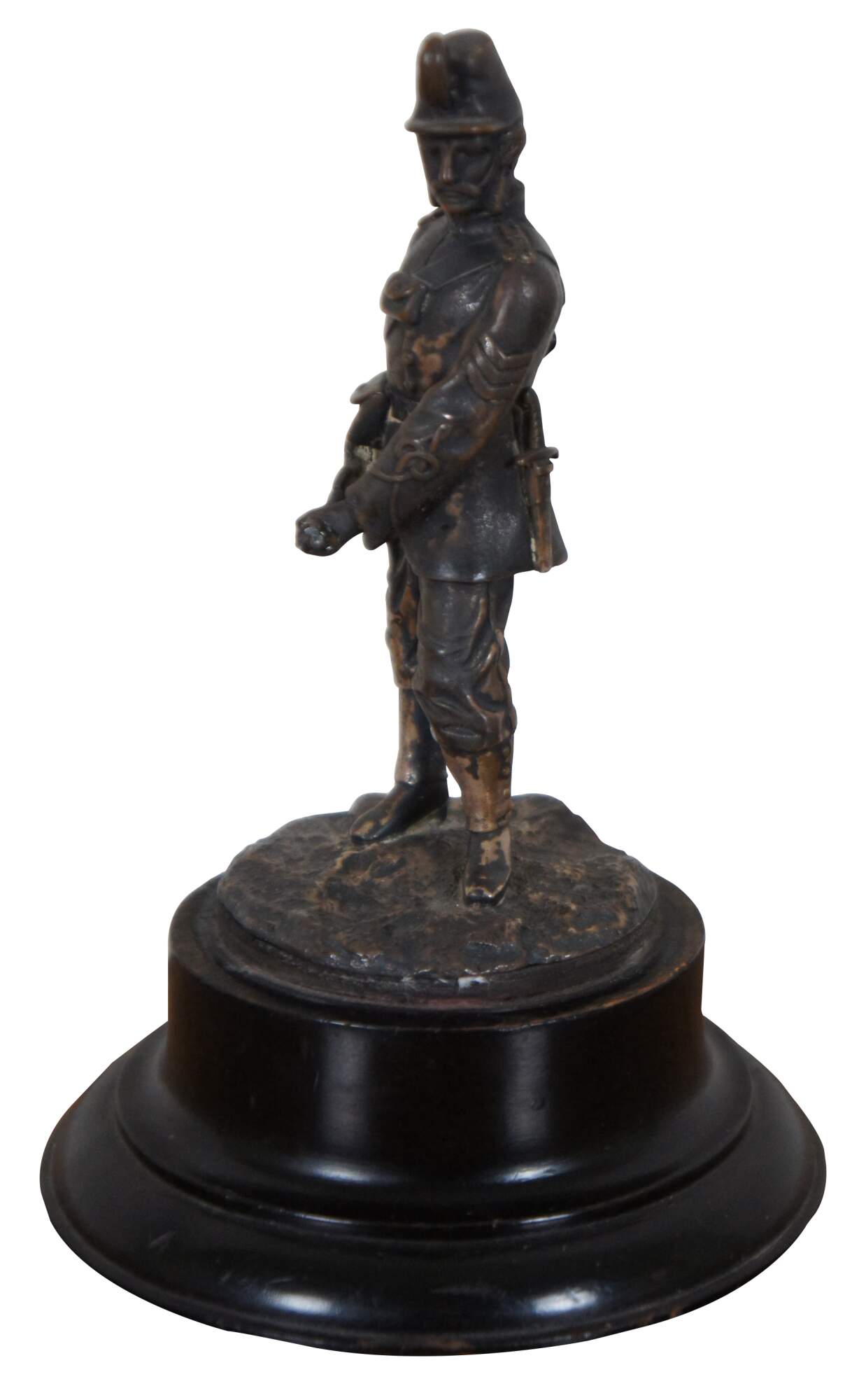 Antique bronze American Revolutionary War soldier figurine or statue featuring a Infantry Field Officer (Colonel) dressed in traditional military attire from the time with sword, holding a rifle / shotgun, mounted on a round wood base.