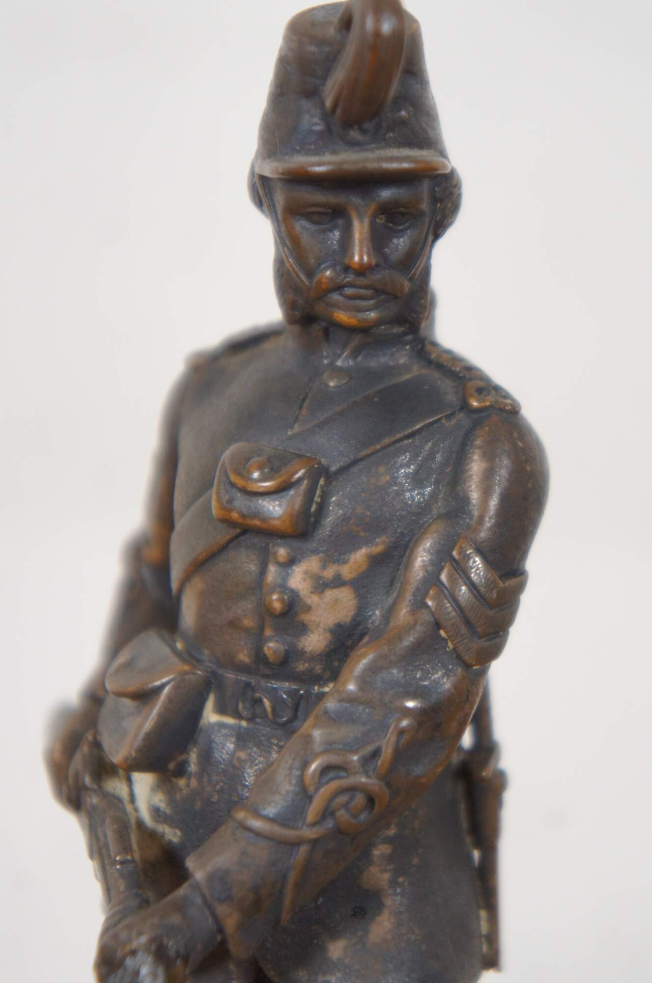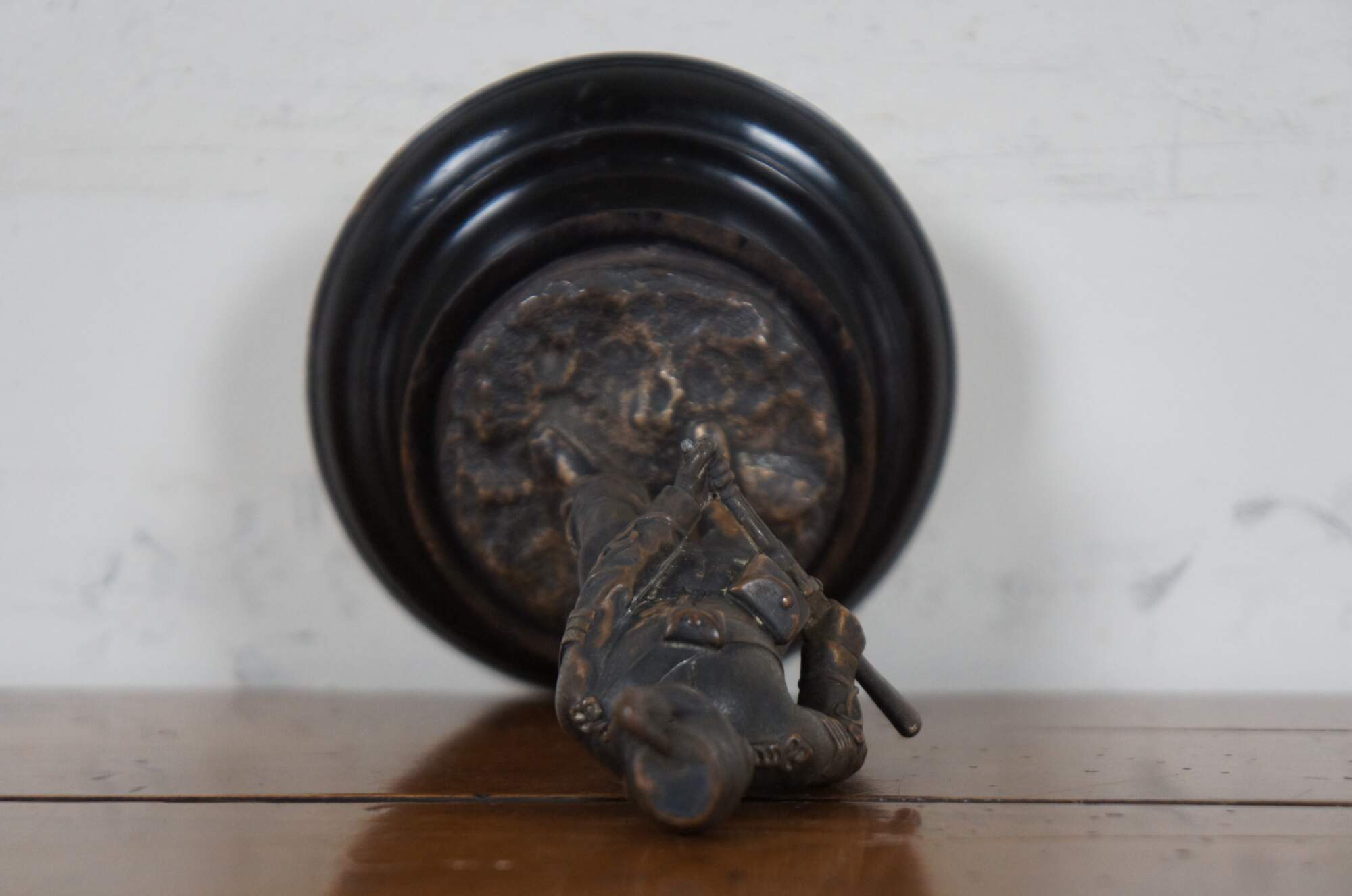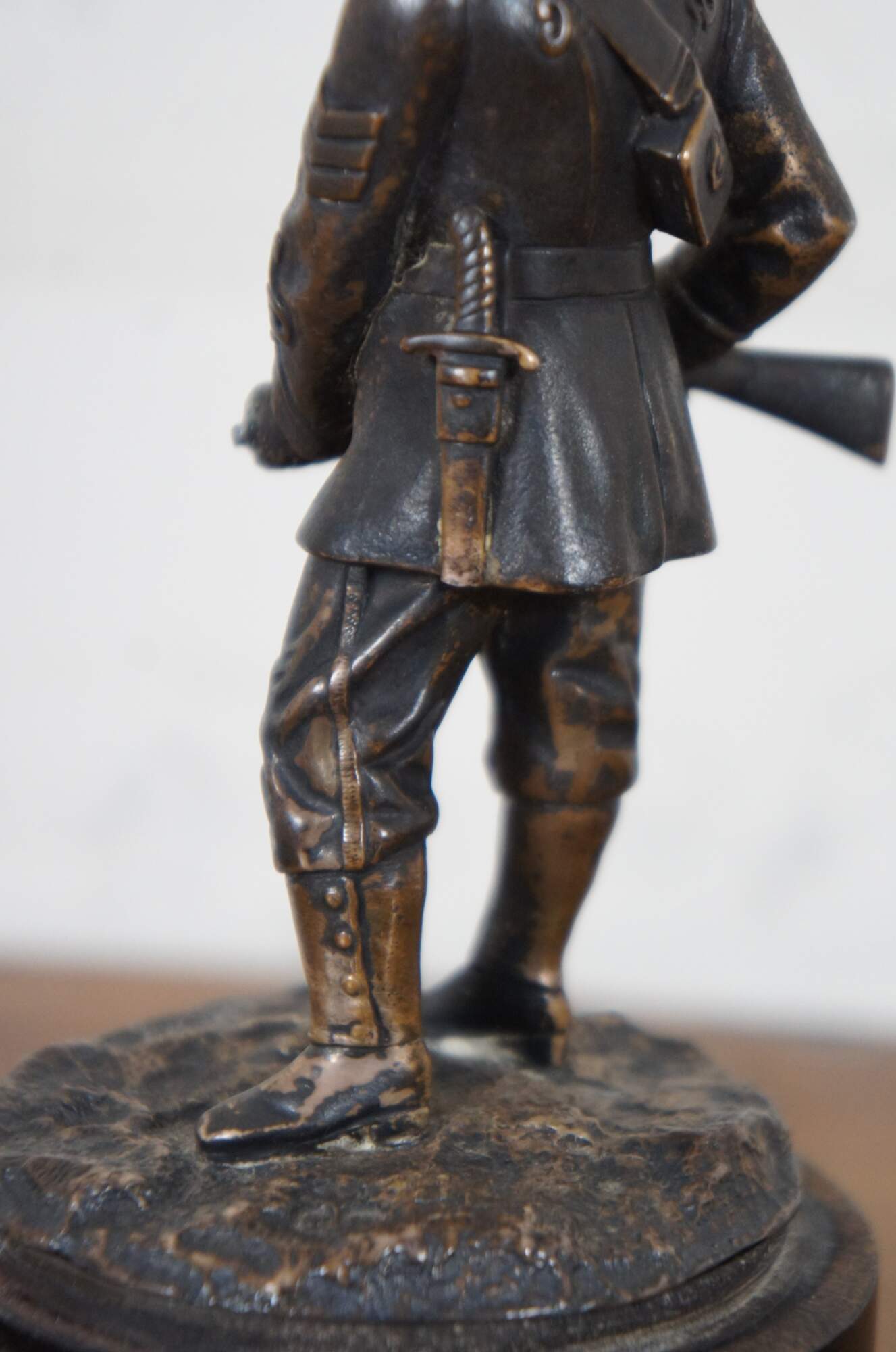 Antique bronze American Revolutionary War soldier figurine or statue featuring a Infantry Field Officer (Colonel) dressed in traditional military attire from the time with sword, holding a rifle / shotgun, mounted on a round wood base.