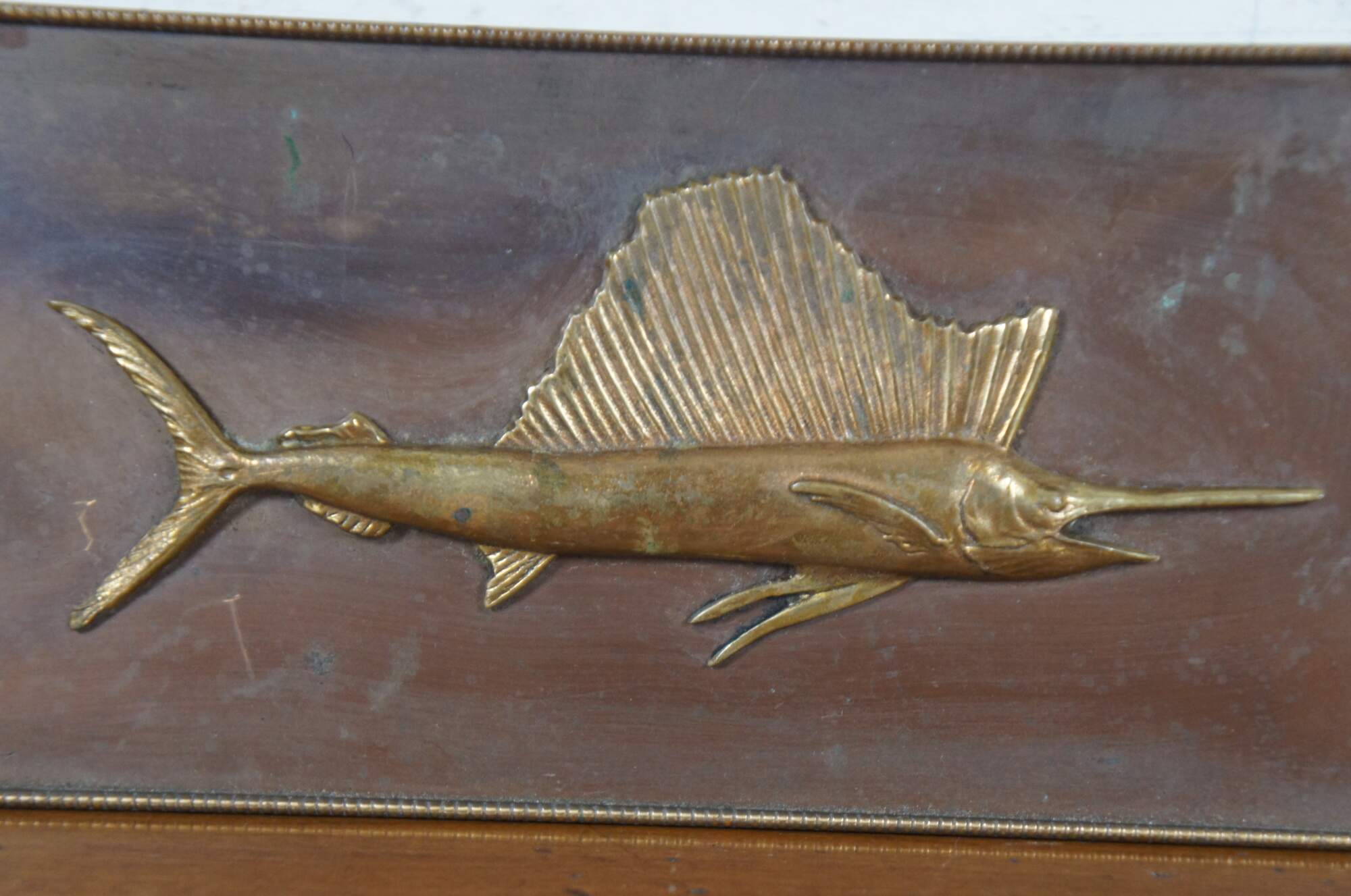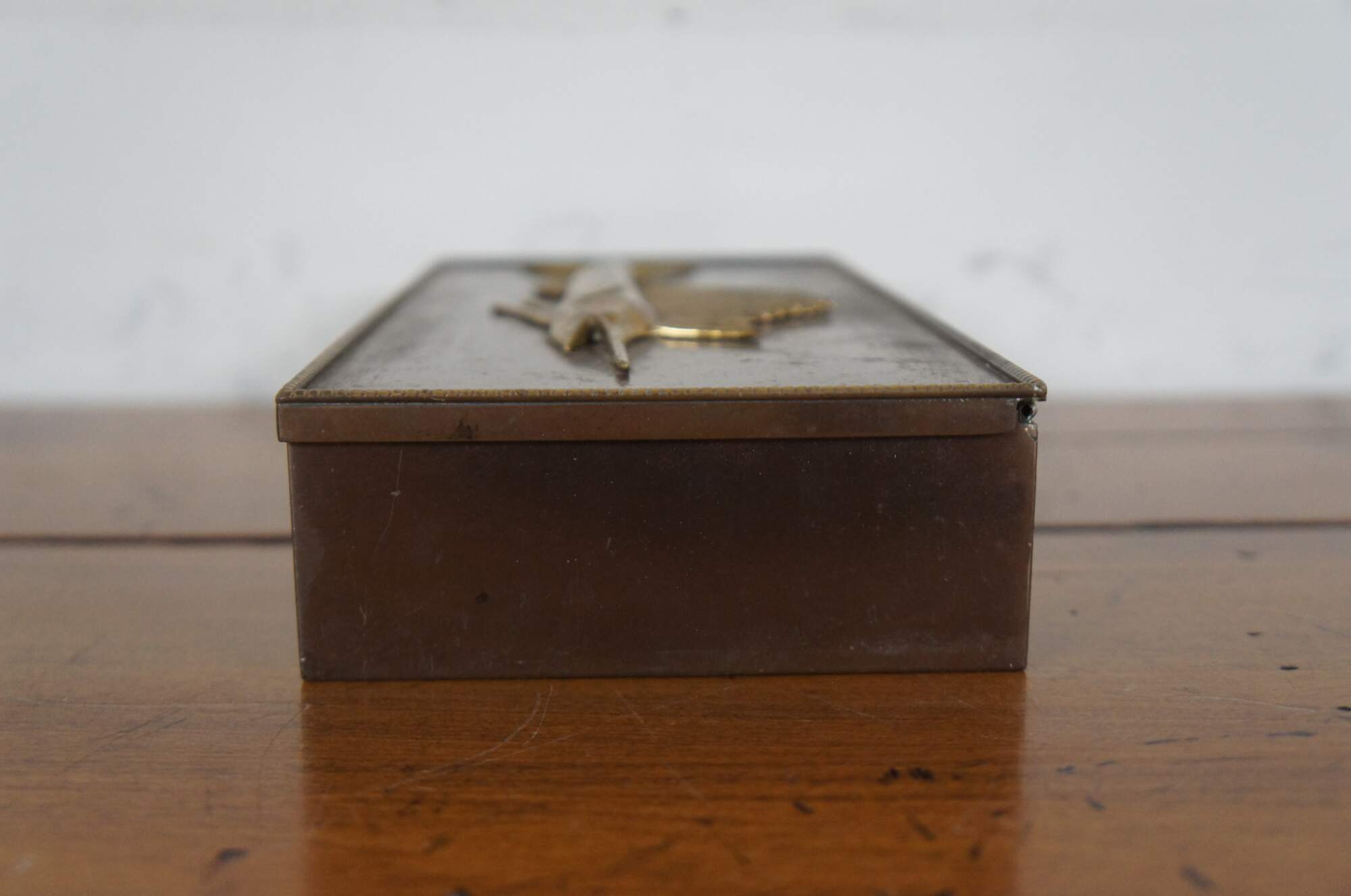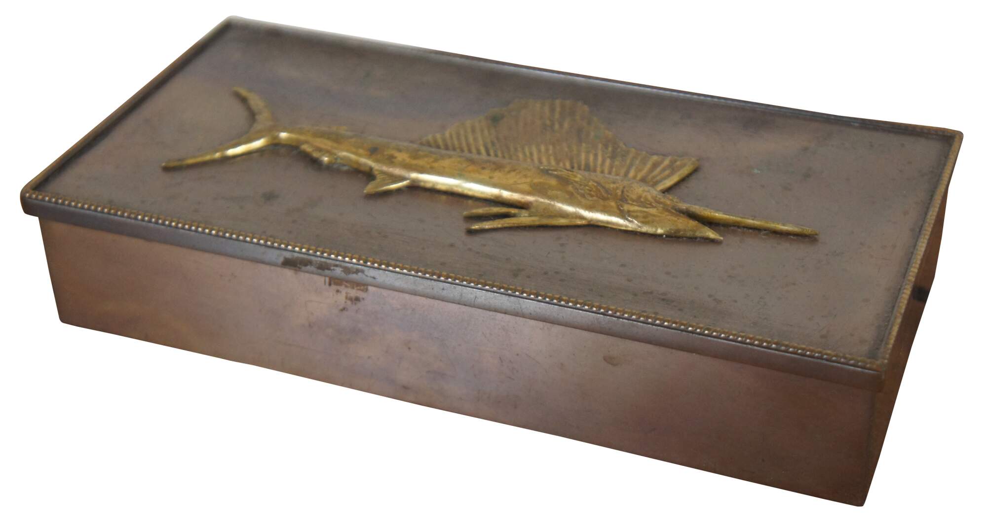 Vintage Silvercrest bronze cigarette box with a polished swordfish in relief on the lid, wood lined in three sections and marked 1516-55 on the base.