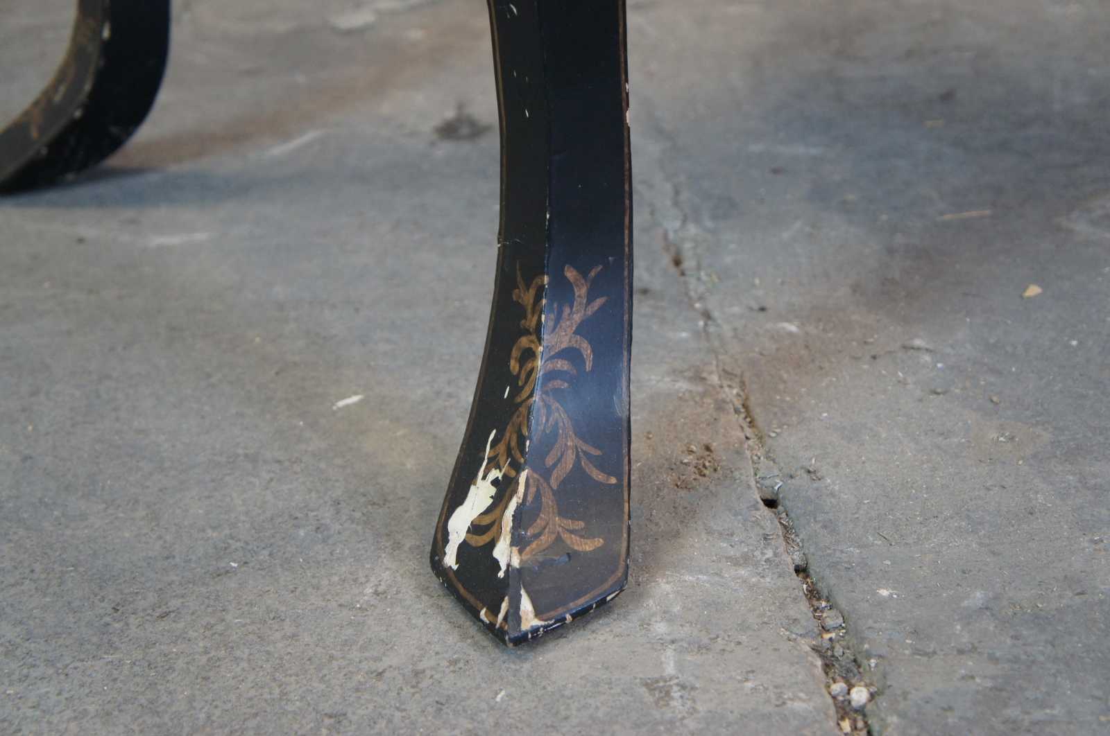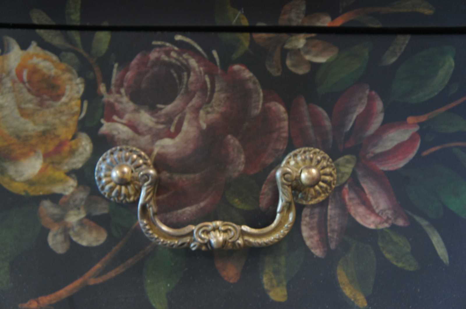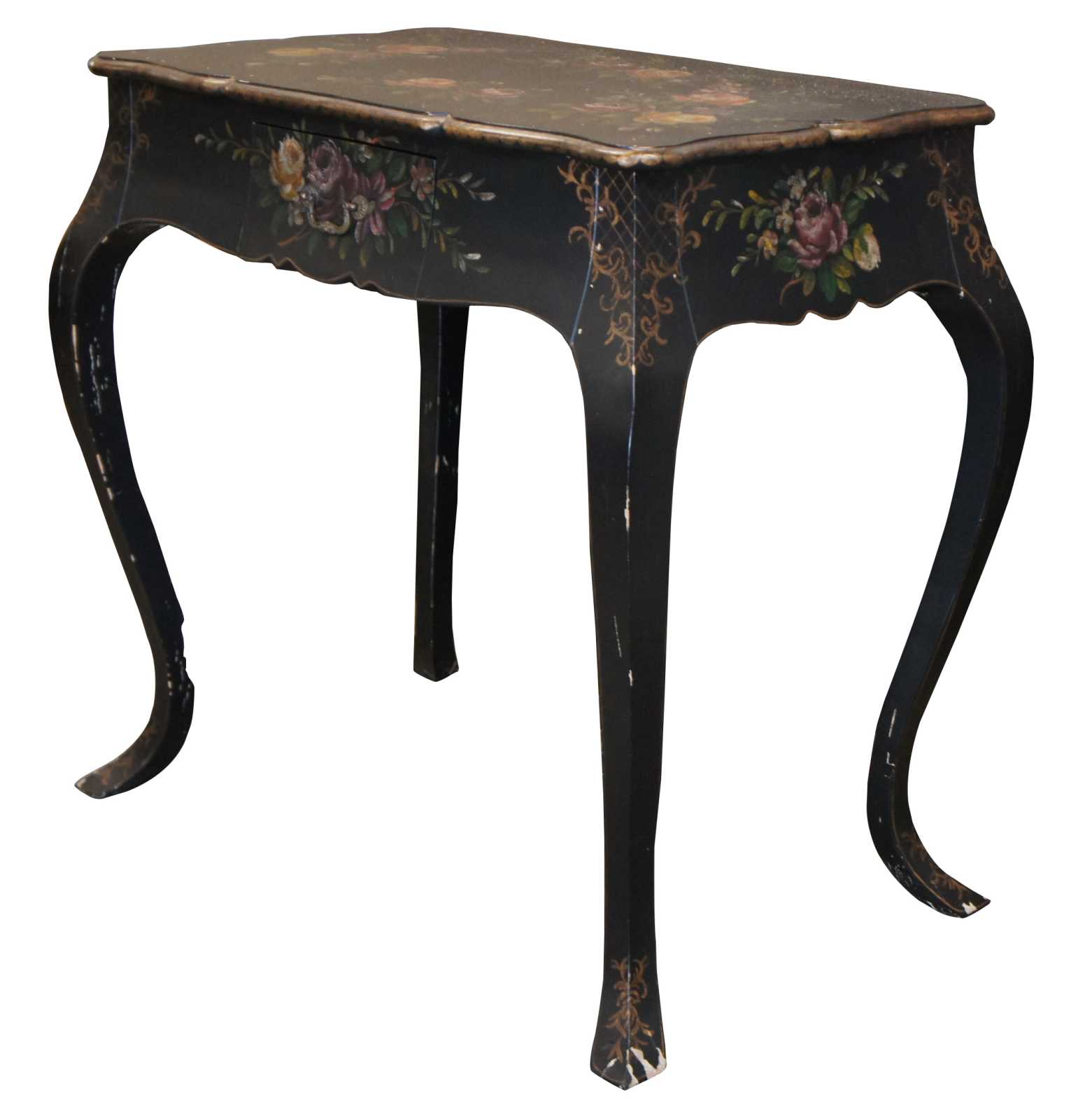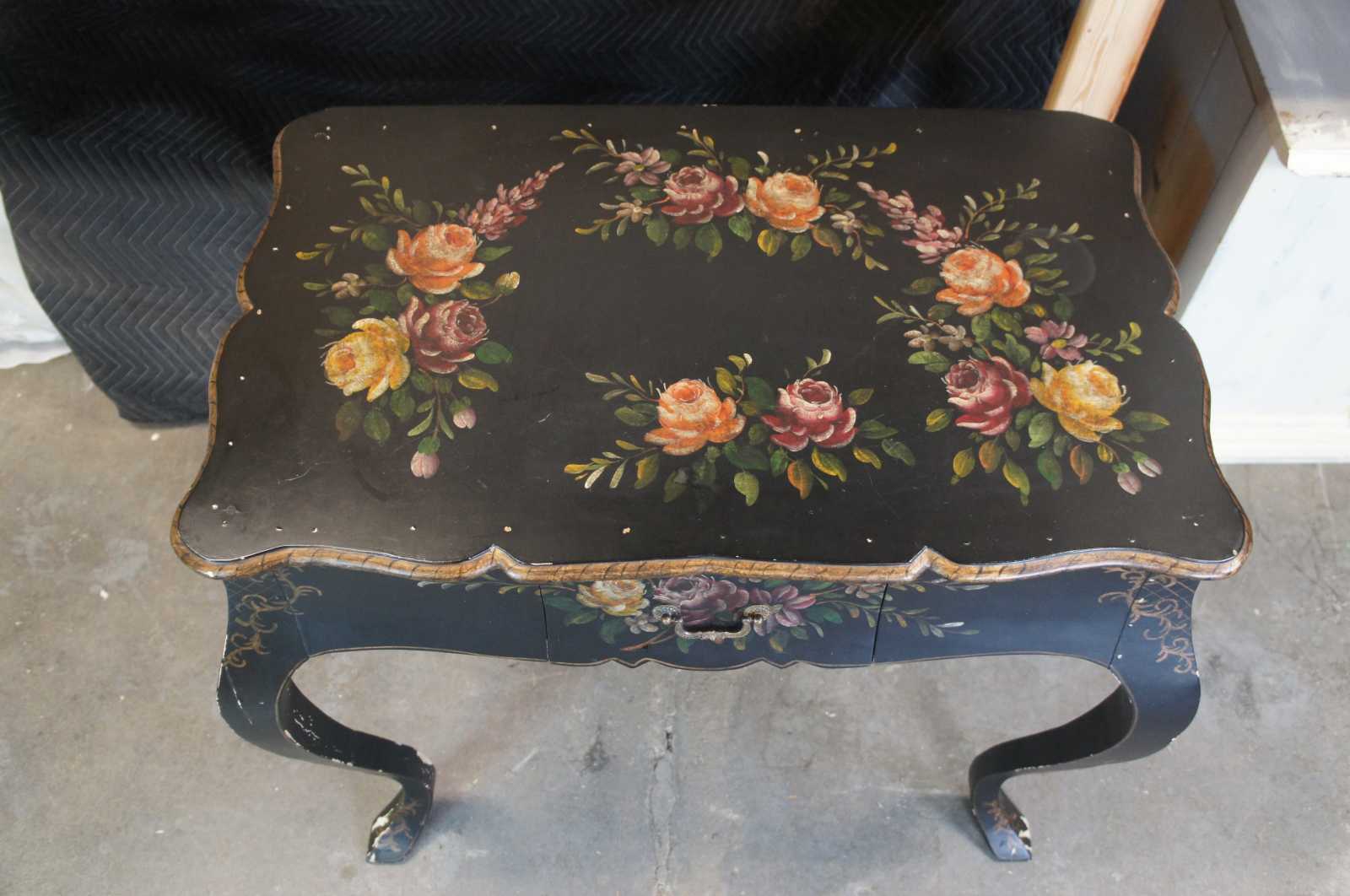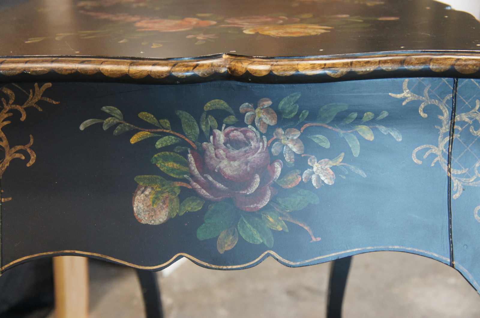 Vintage French Provincial Rococo entry console table featuring hand painted floral designs over black or ebony finish with elaborate serpentine and scalloped form and one storage drawer.