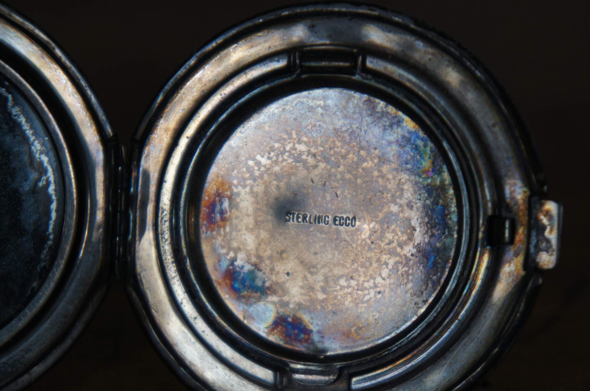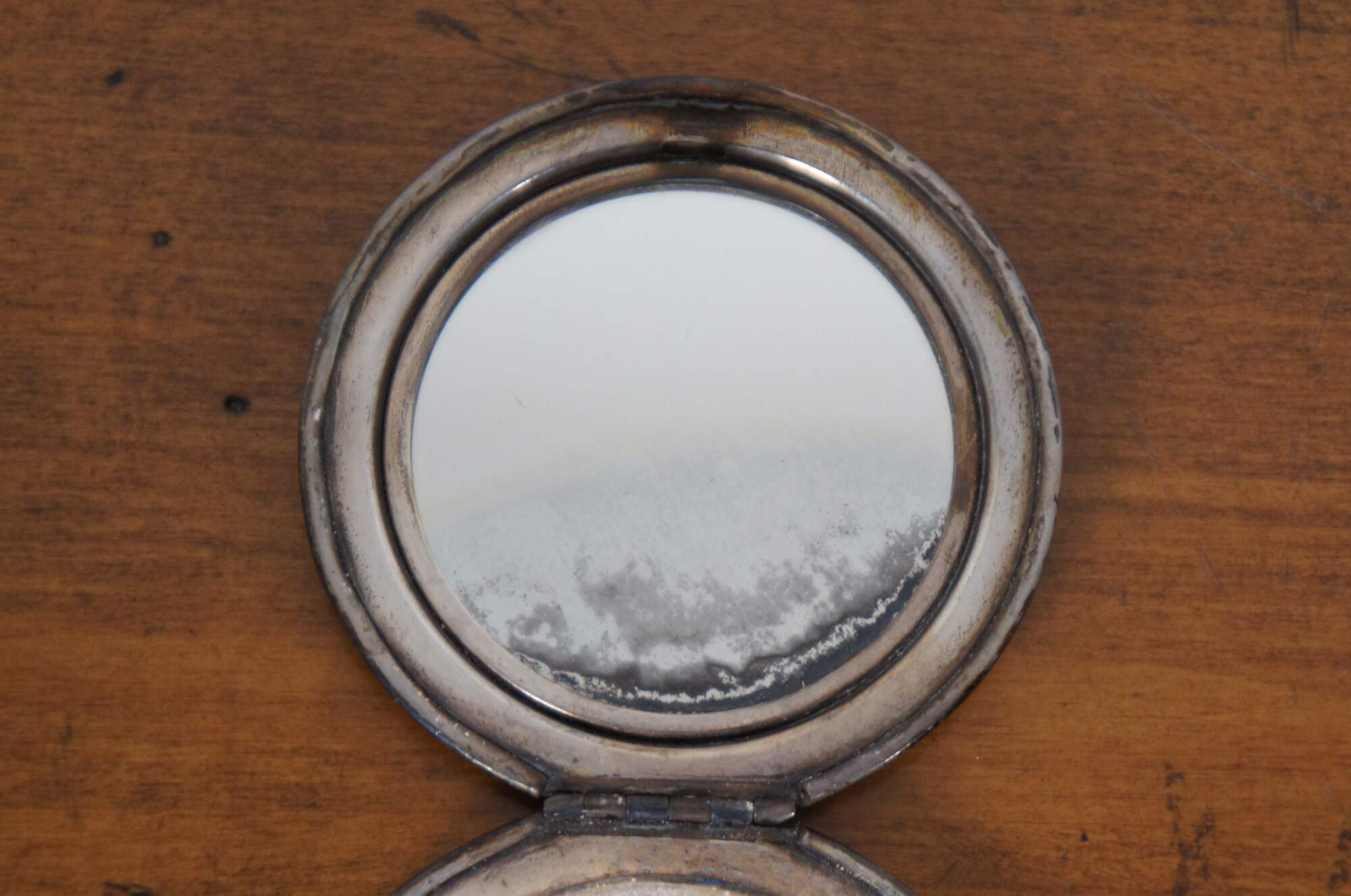 Antique floral engraved sterling silver compact mirror with flat puff and separate compartment for powder. Marked Sterling Ecco.