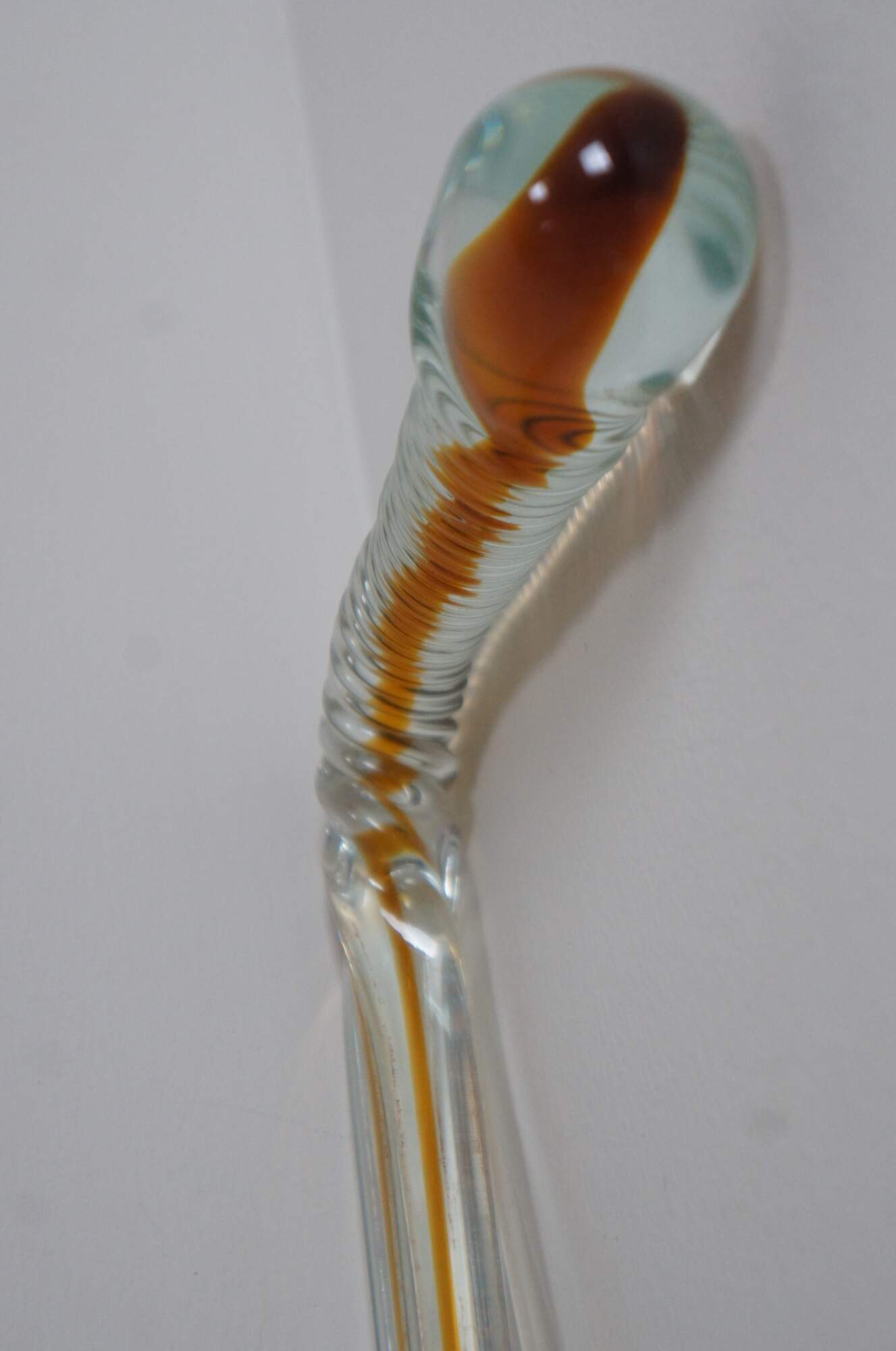 Victorian hand blown art glass End-of-Day walking stick or parade cane in clear glass with a brown or amber core, with a twisted shape at the handle and the base. Considering its length it is a very rare find in this style.